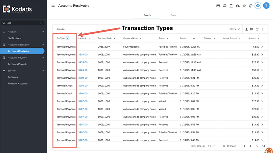 In the operations portal, on the accounts receivable screen you can view the different transaction types for records. These transaction types could be coming from your ERP, an integration, or from Kodaris.