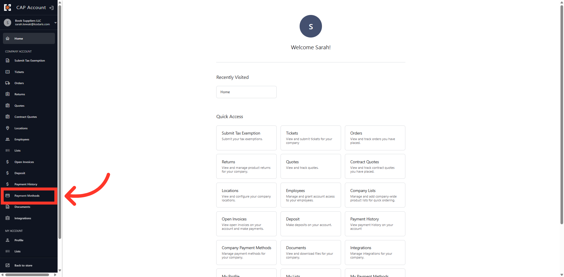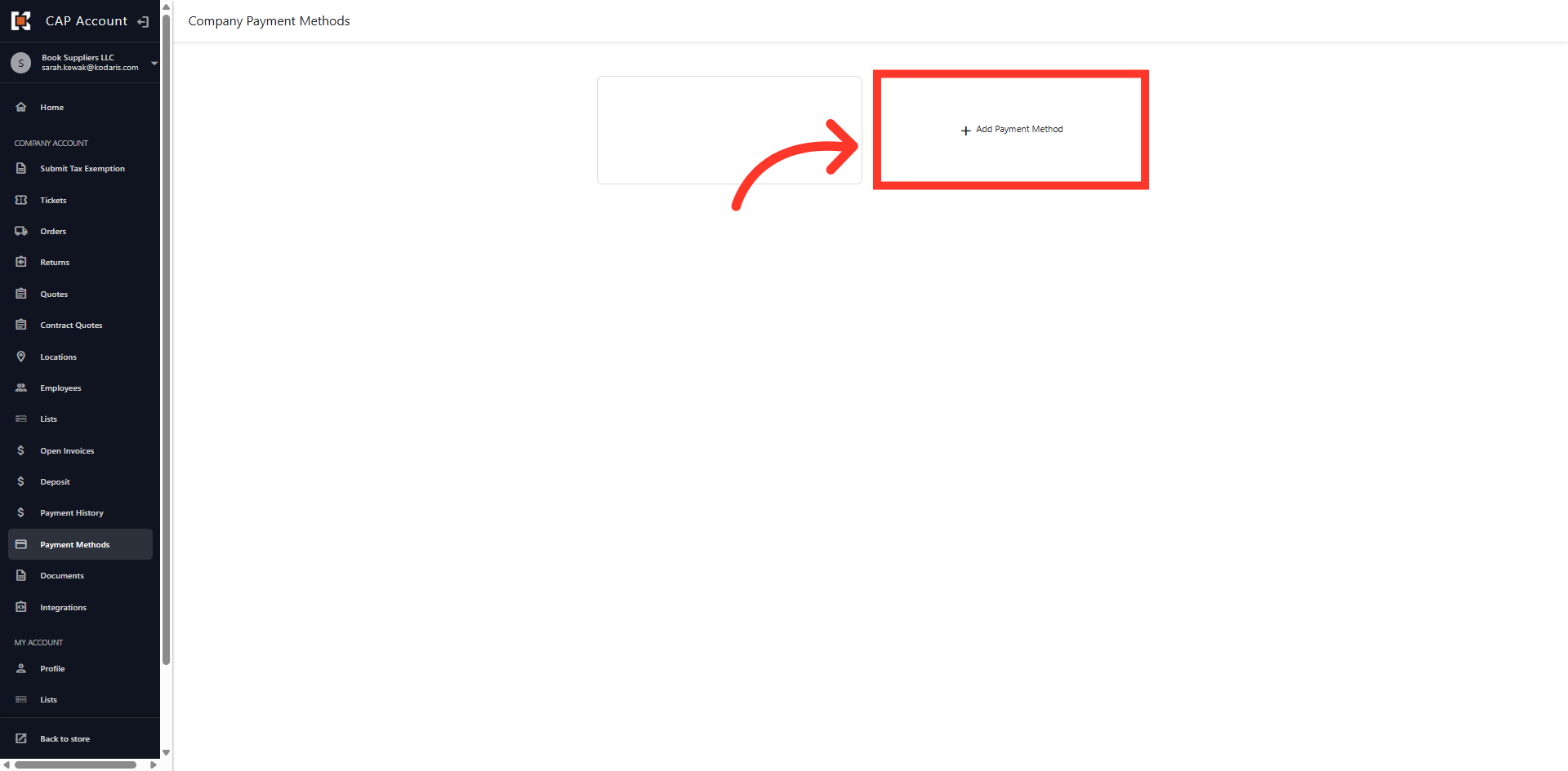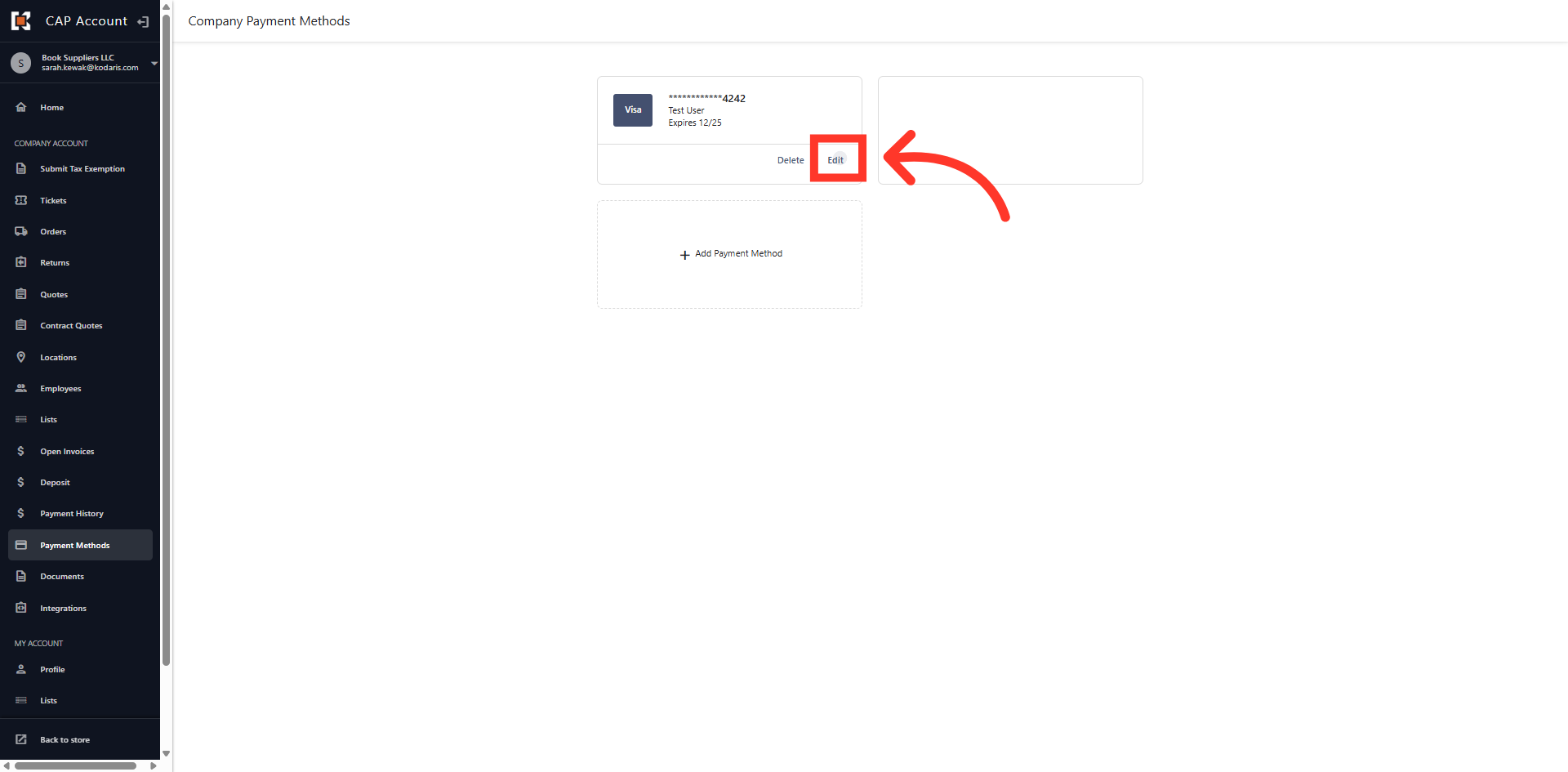 You can manage the payment methods used to pay invoices in the Customer Portal by navigating to the "Payment Methods" section. In order to complete these actions, you will need to be assigned the "Accounts Payable" permission.