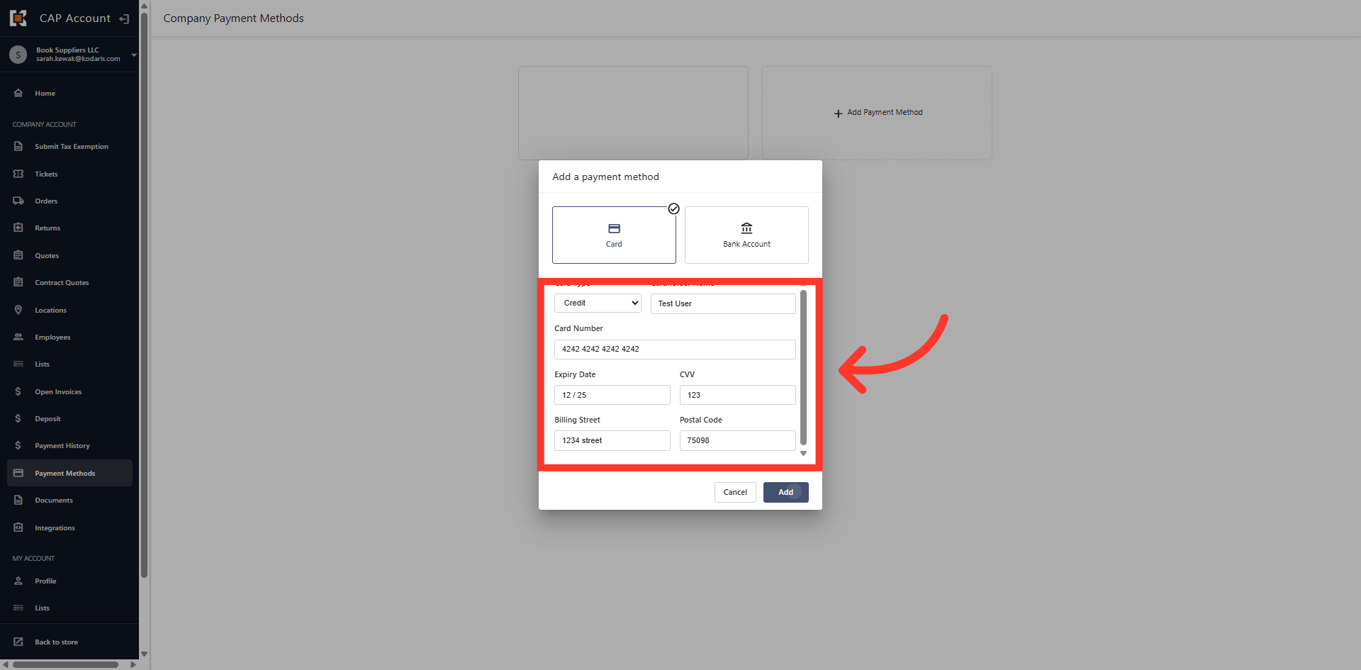 Add the card details and Click the "Add" button to save.