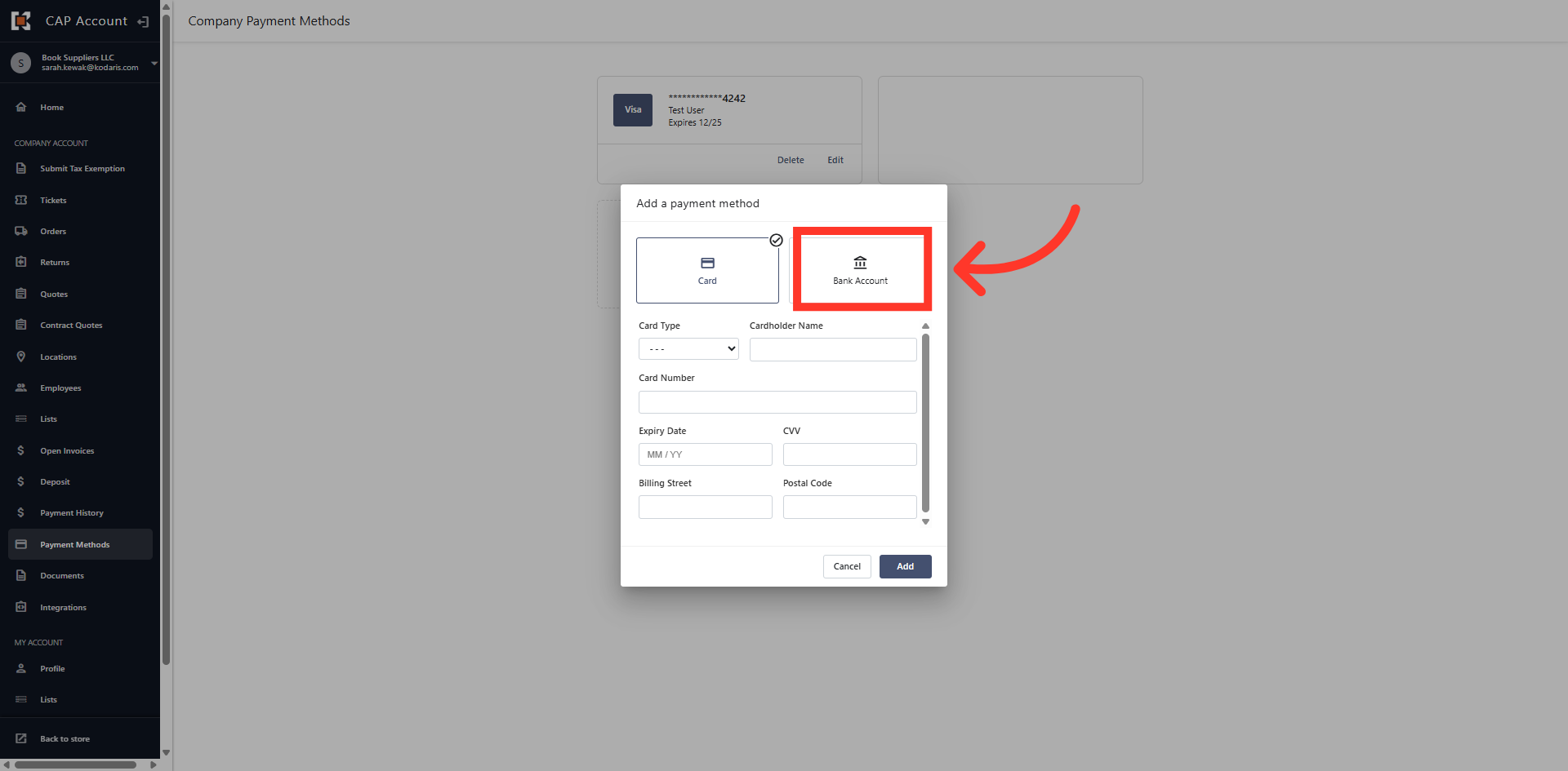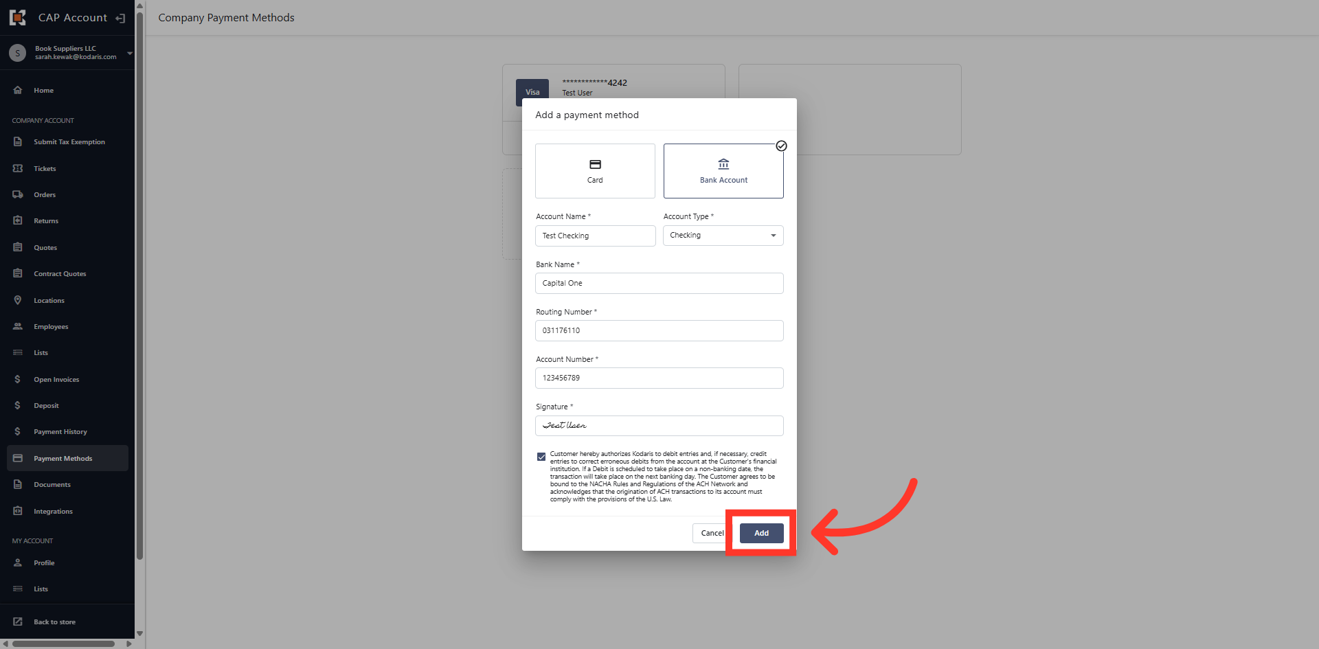 Click "Add" to add the bank account in your payment methods.