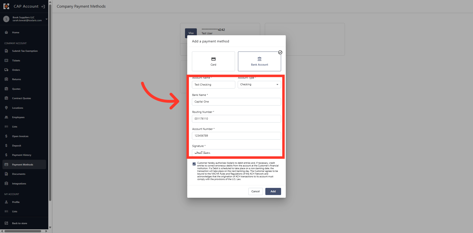 Add the checking or savings account information. Note that all fields are required. If it is your first time adding, you will be prompted to agree to ACH terms & signature.