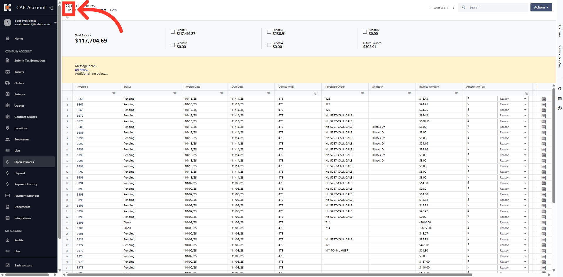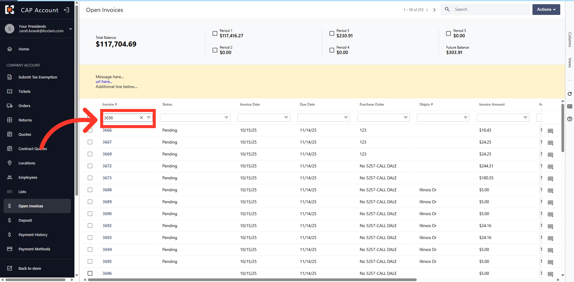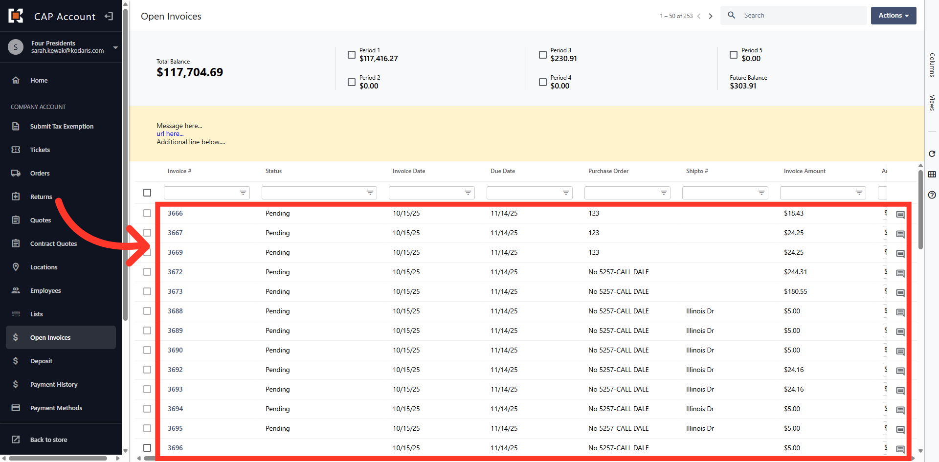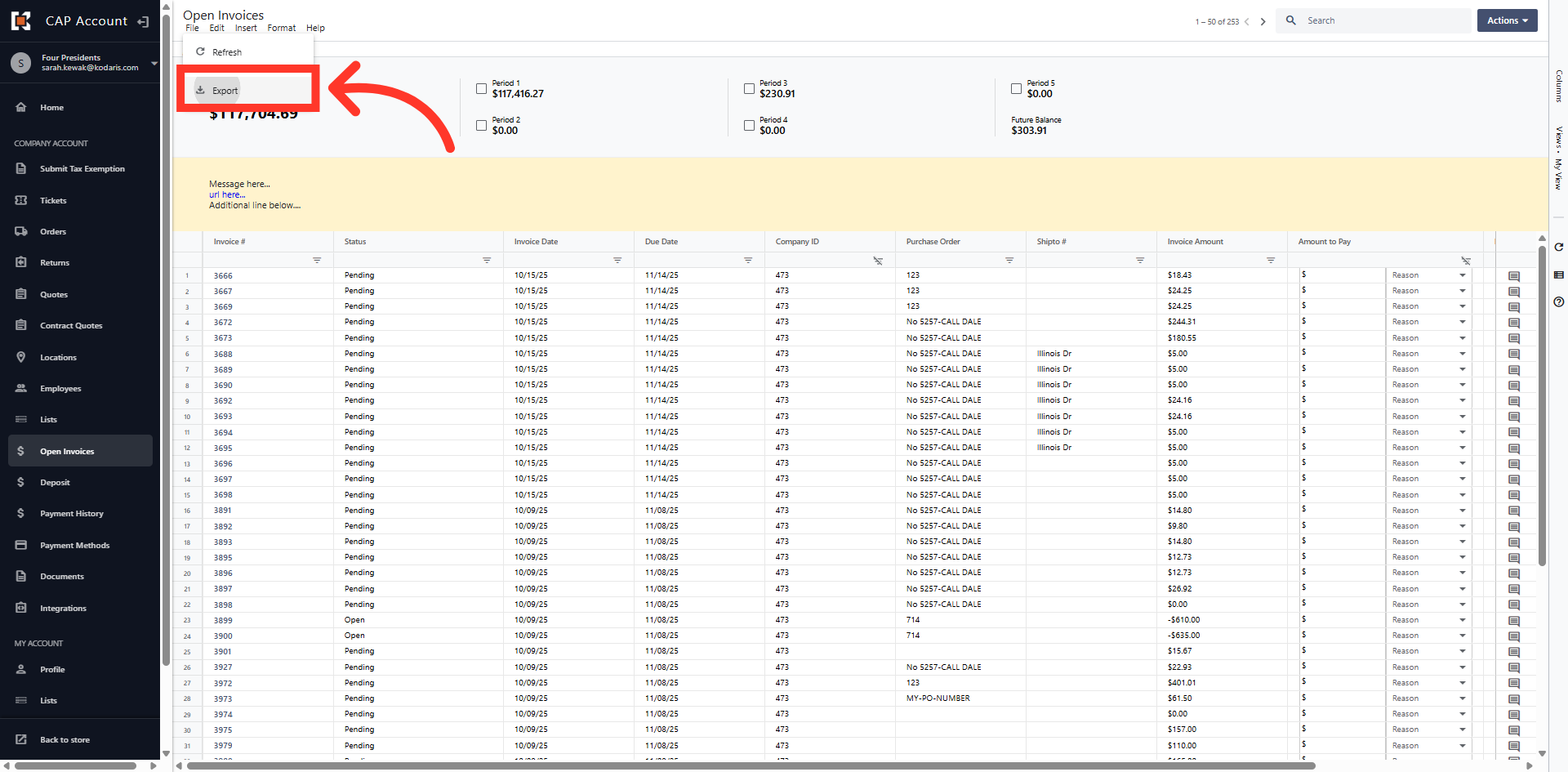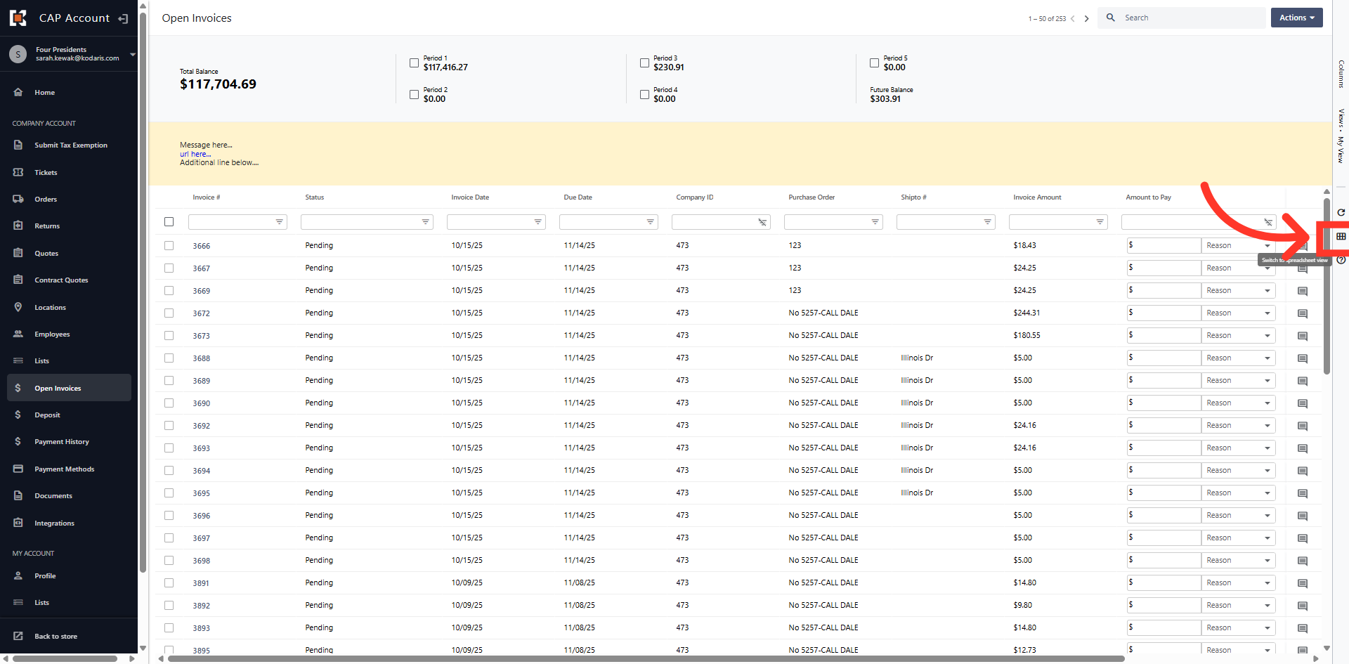 The grid view displays all Open Invoices on the account.