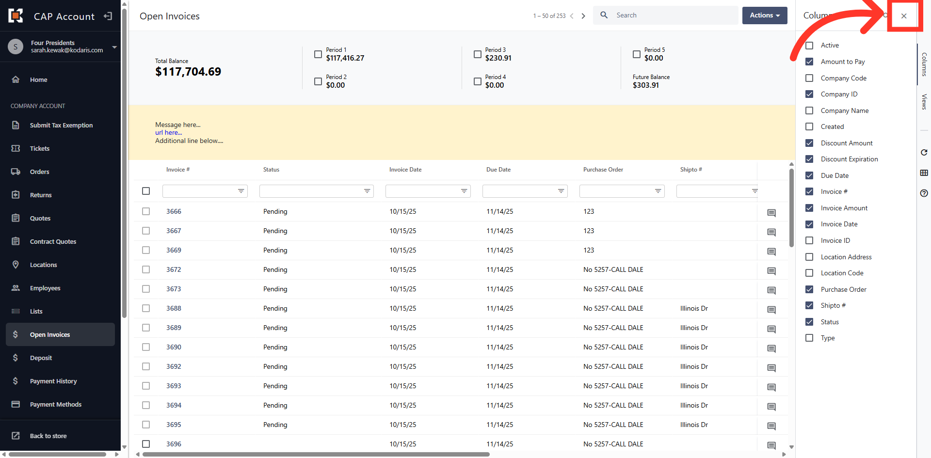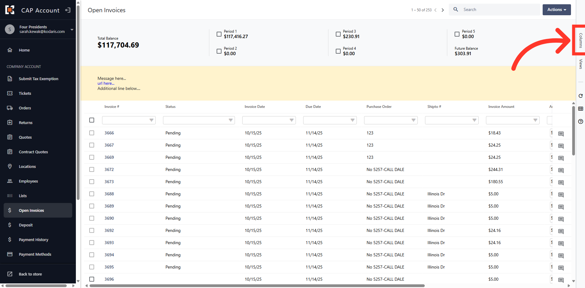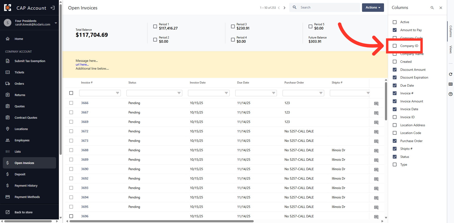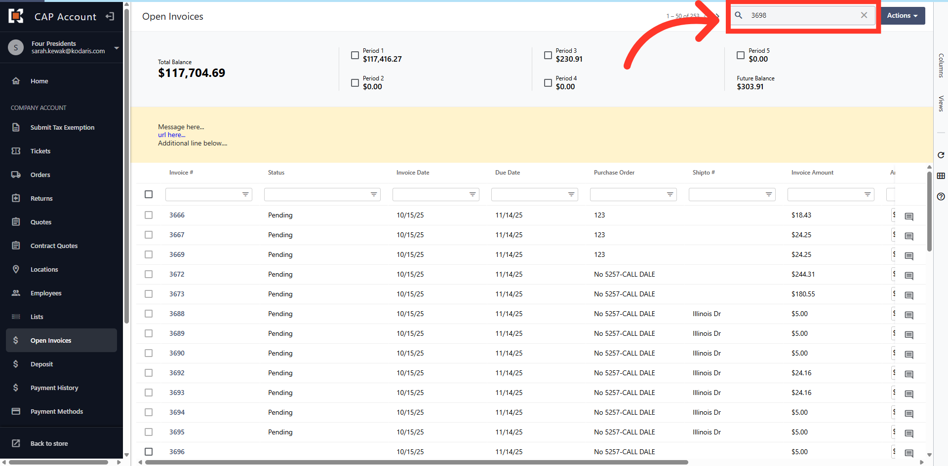 The grid view displays all Open Invoices on the account.