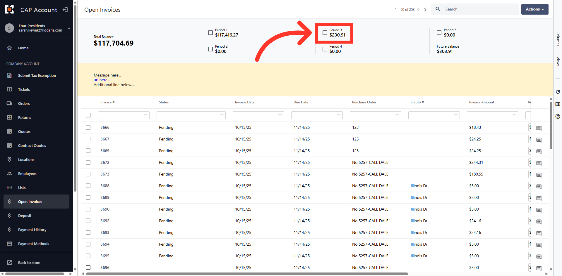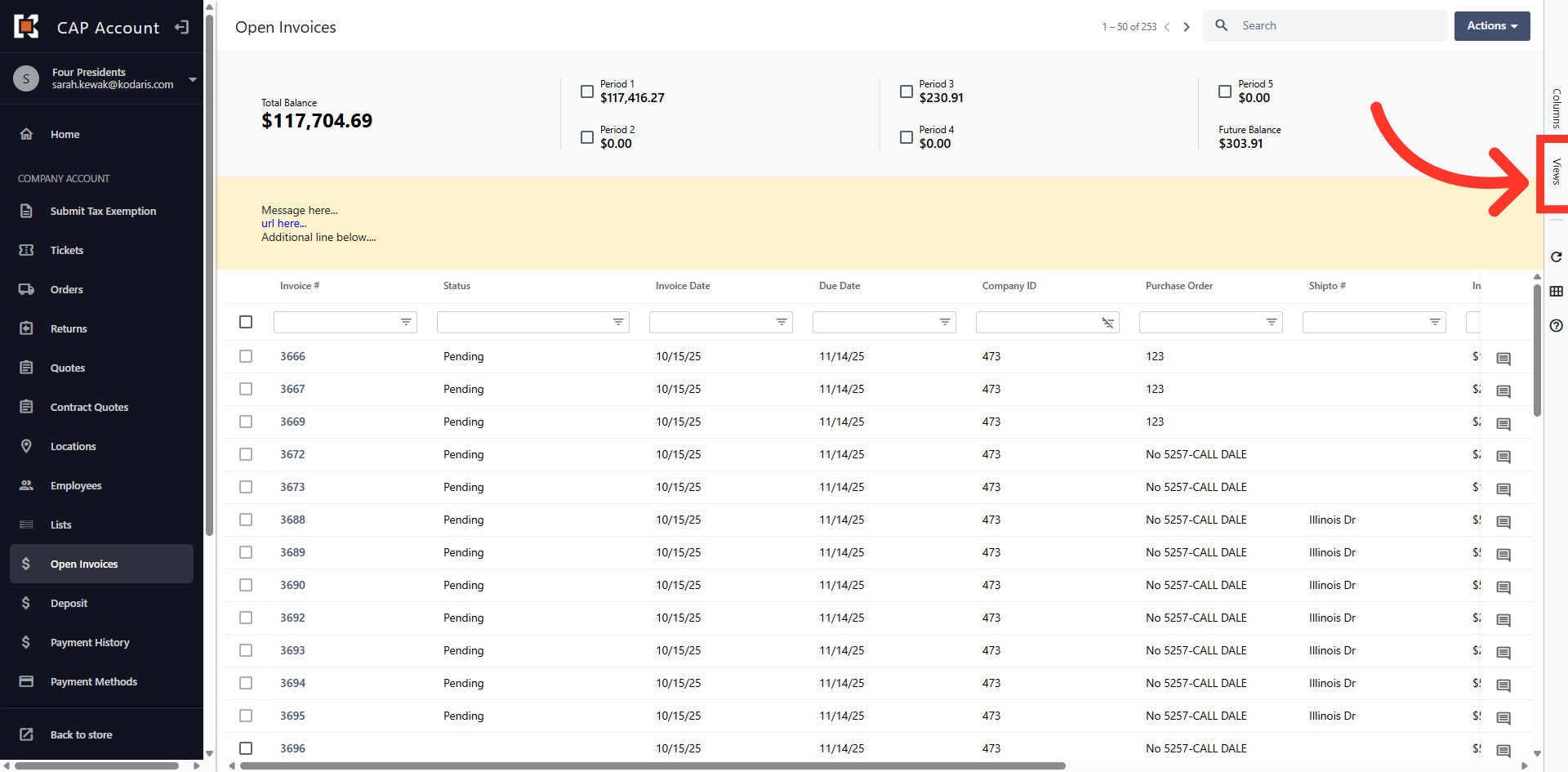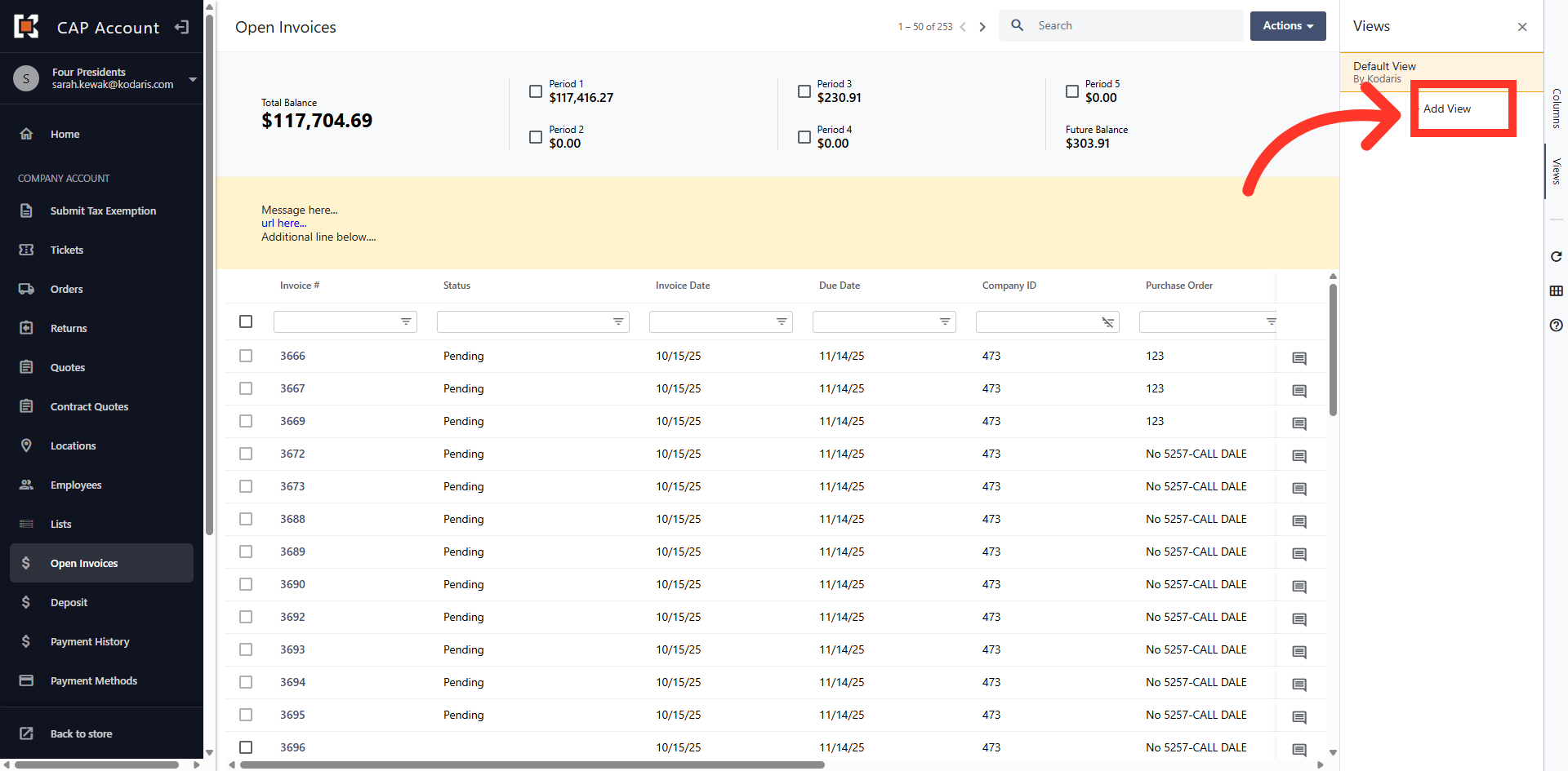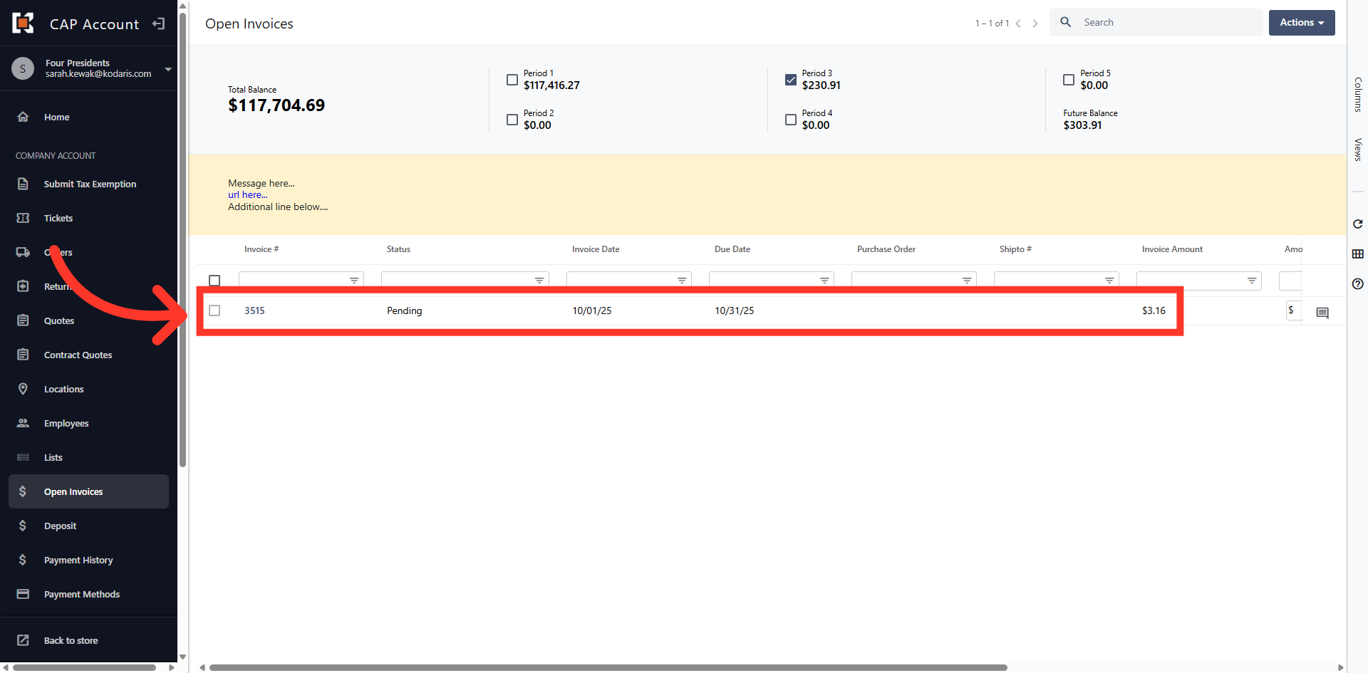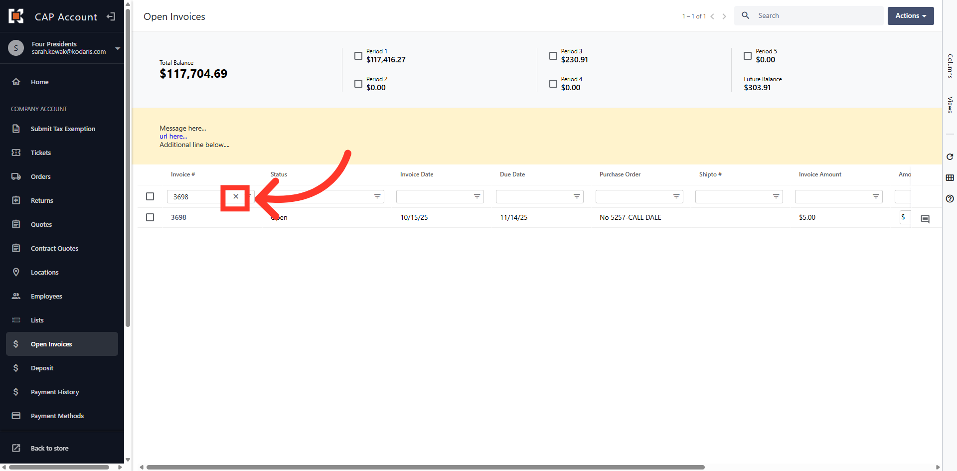 The grid view displays all Open Invoices on the account.