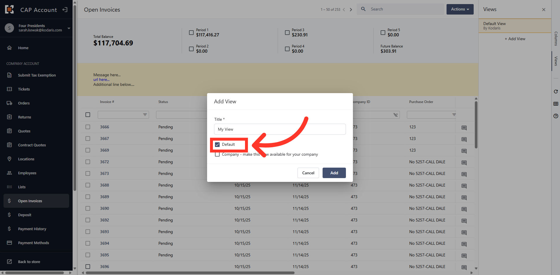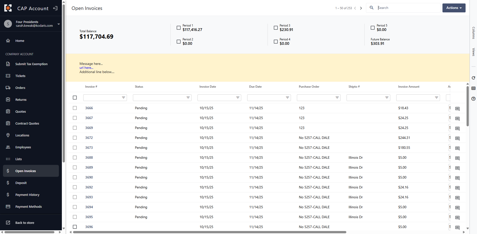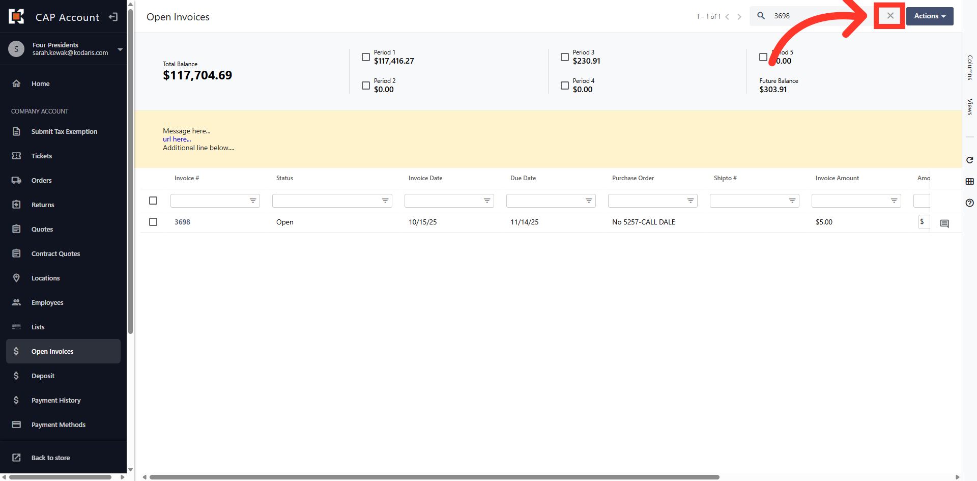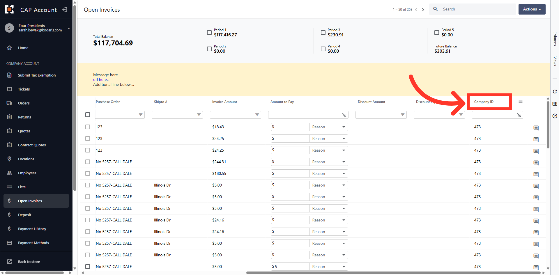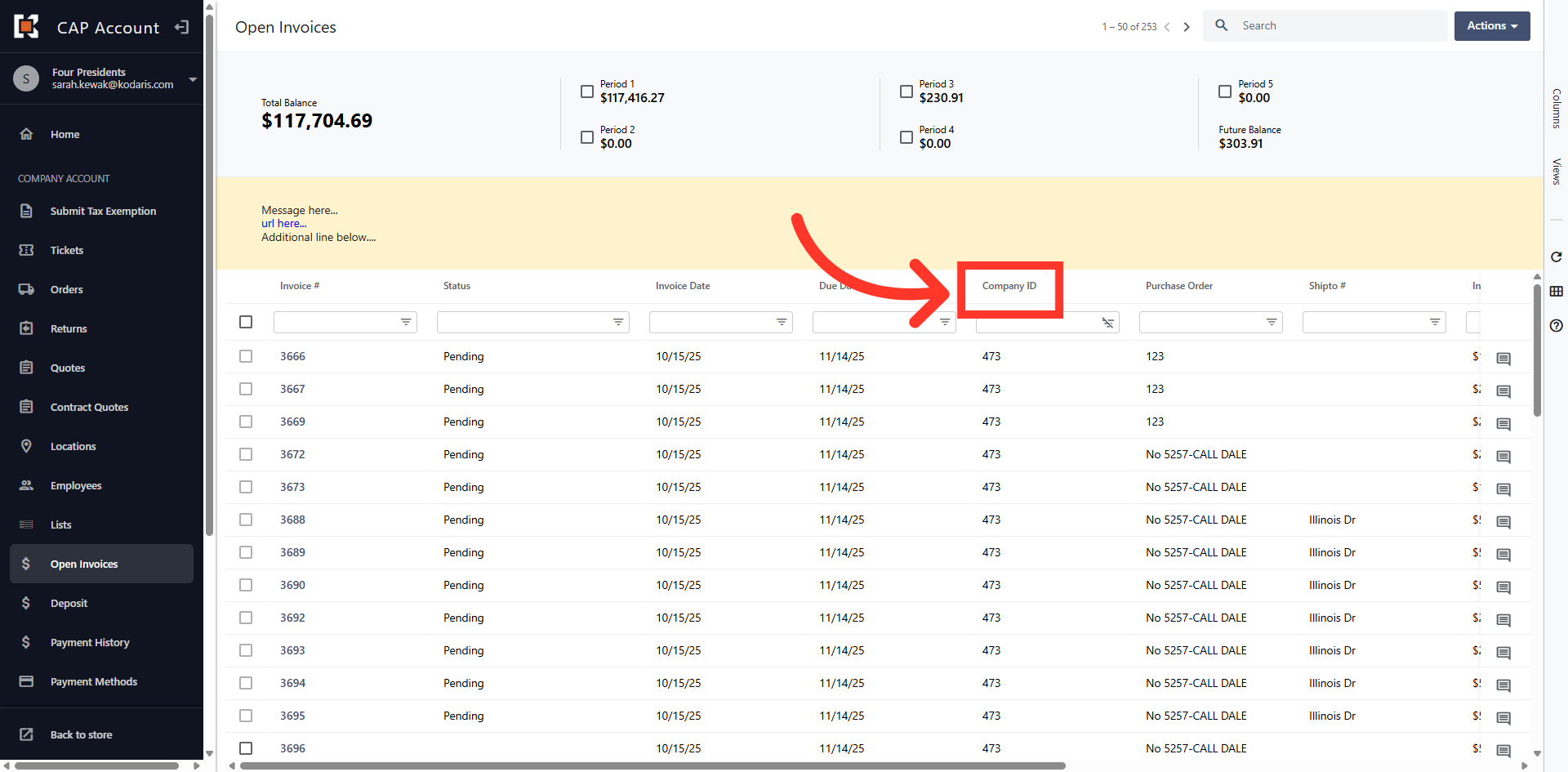 The grid view displays all Open Invoices on the account.