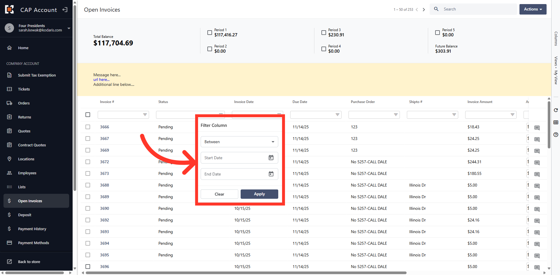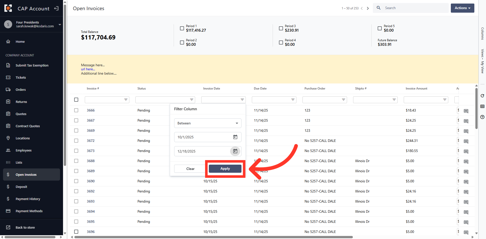 Once you've entered the start and end date click "Apply" to filter invoices.