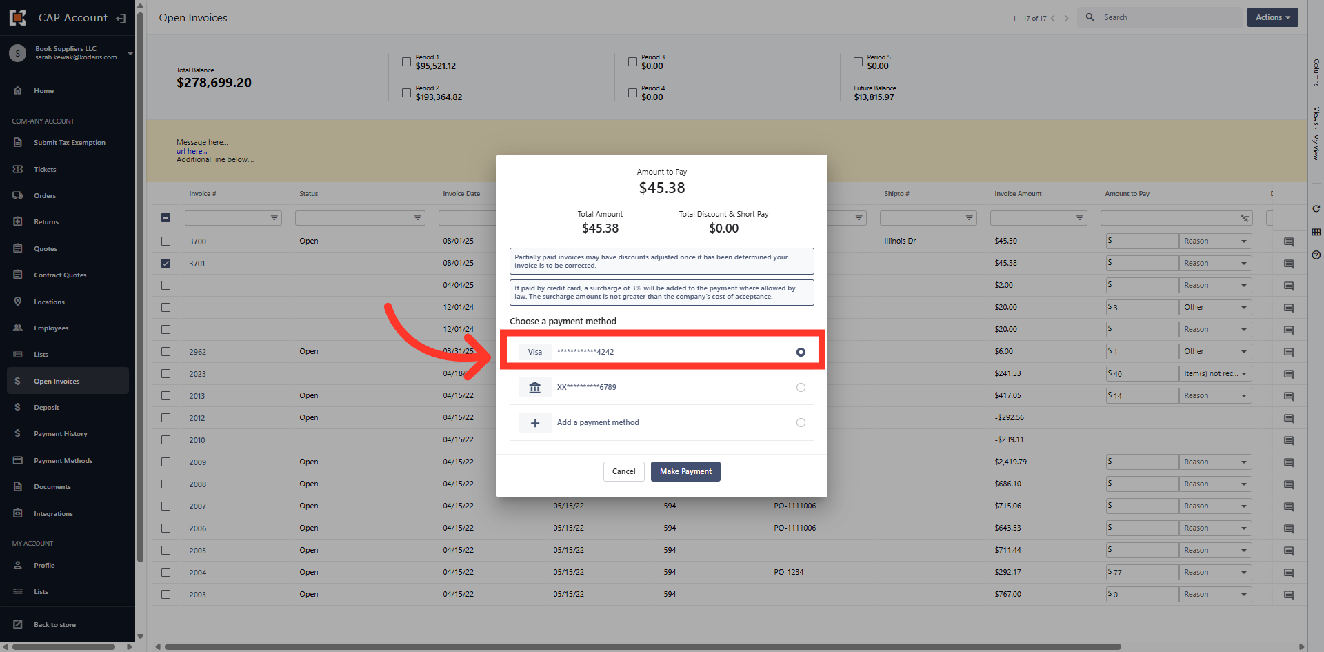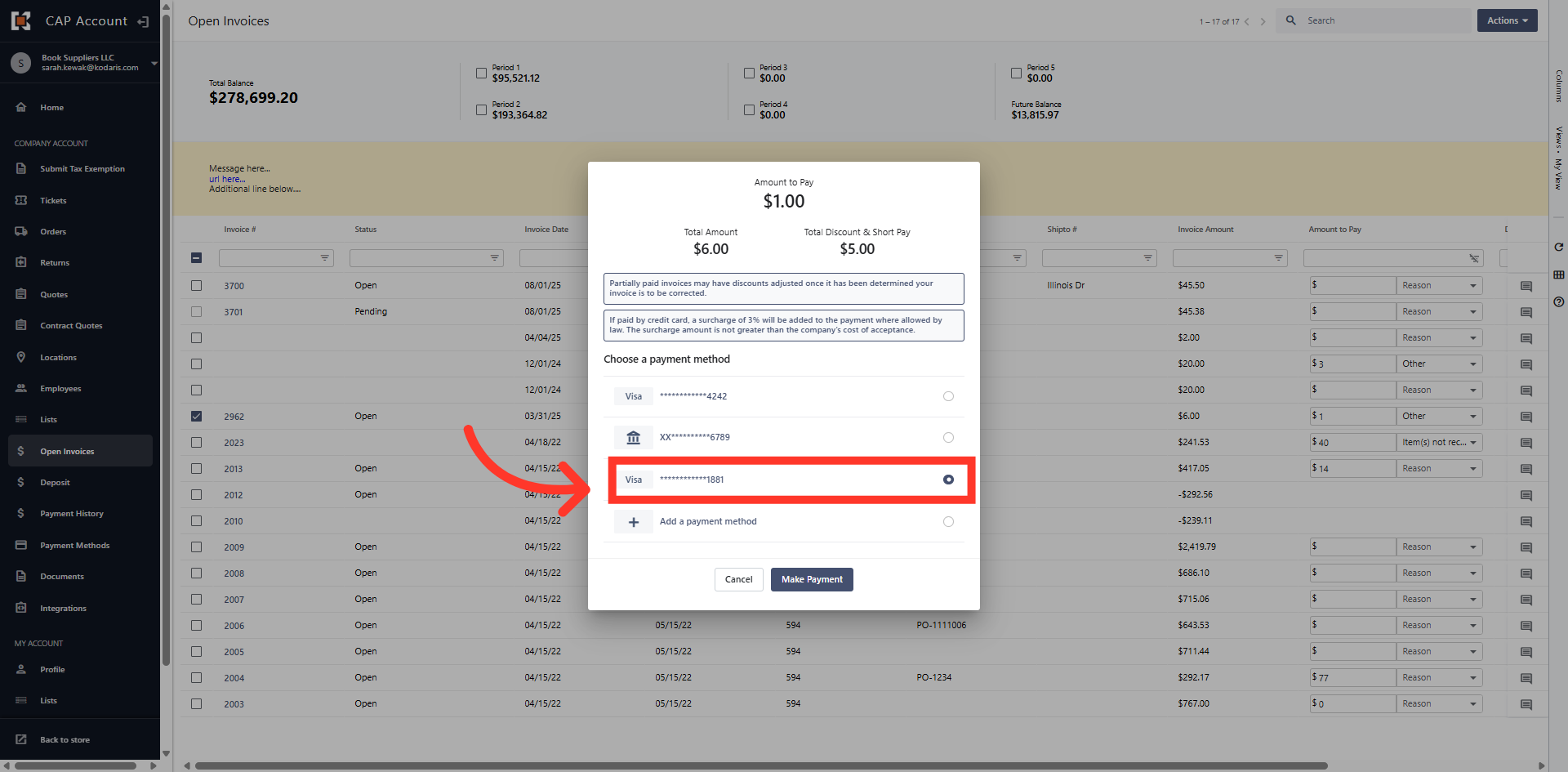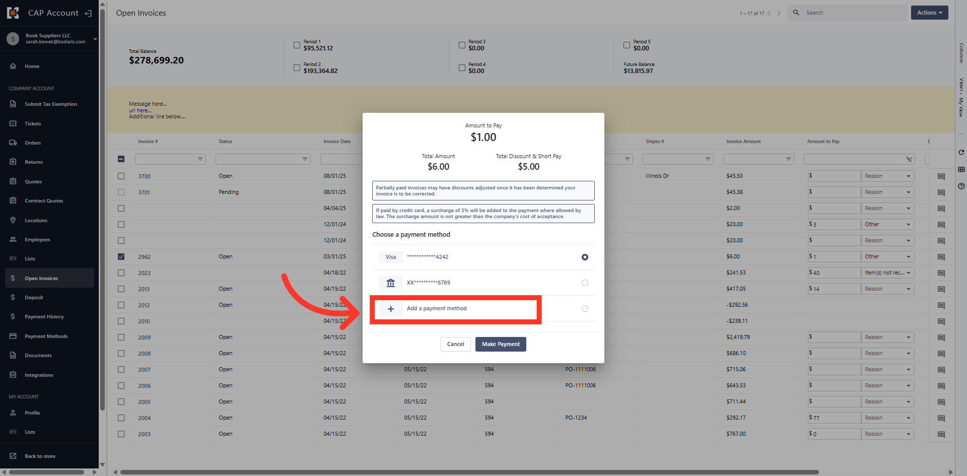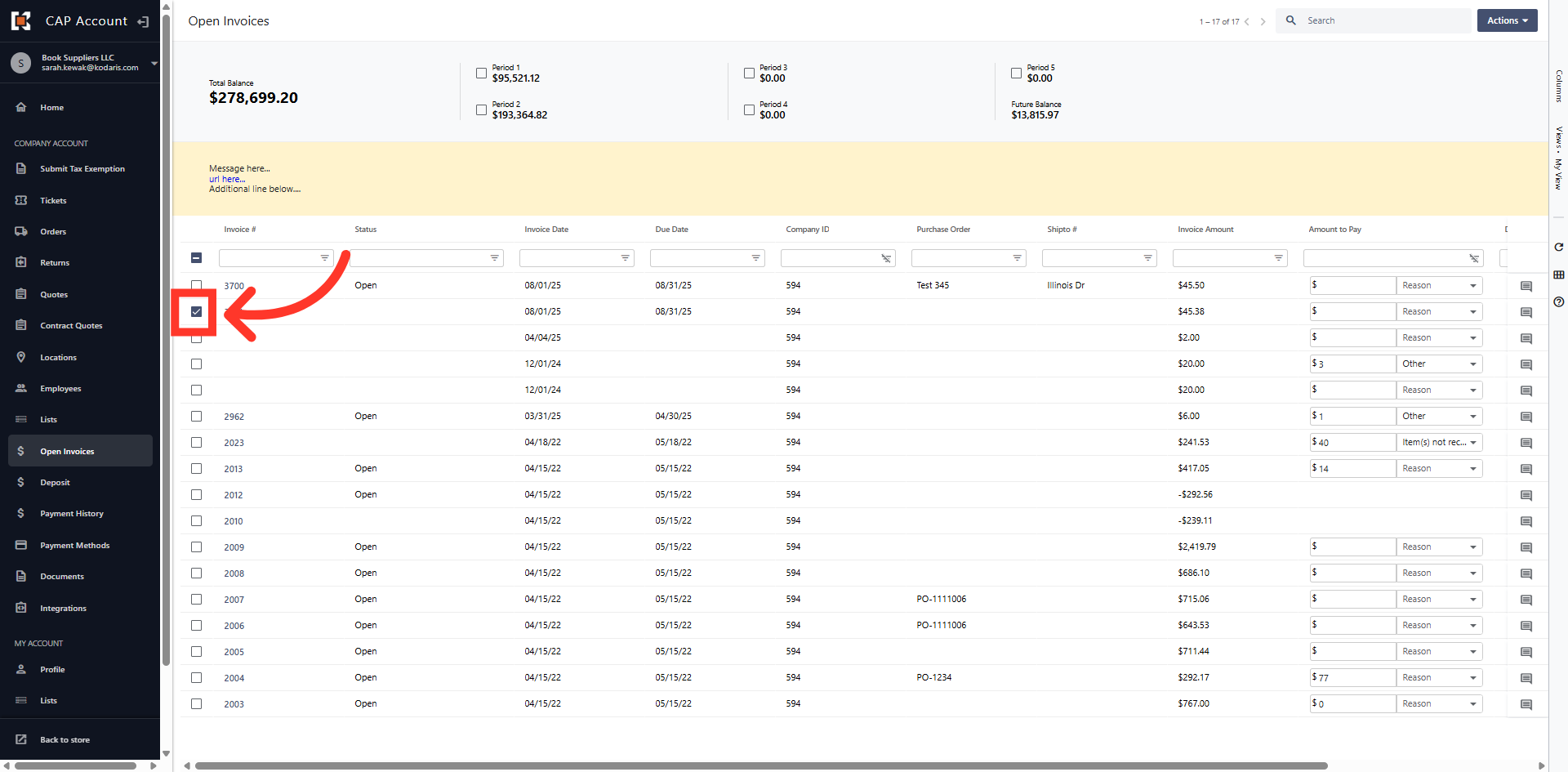 You can also pay an invoice with a new payment method. First, select an invoice.