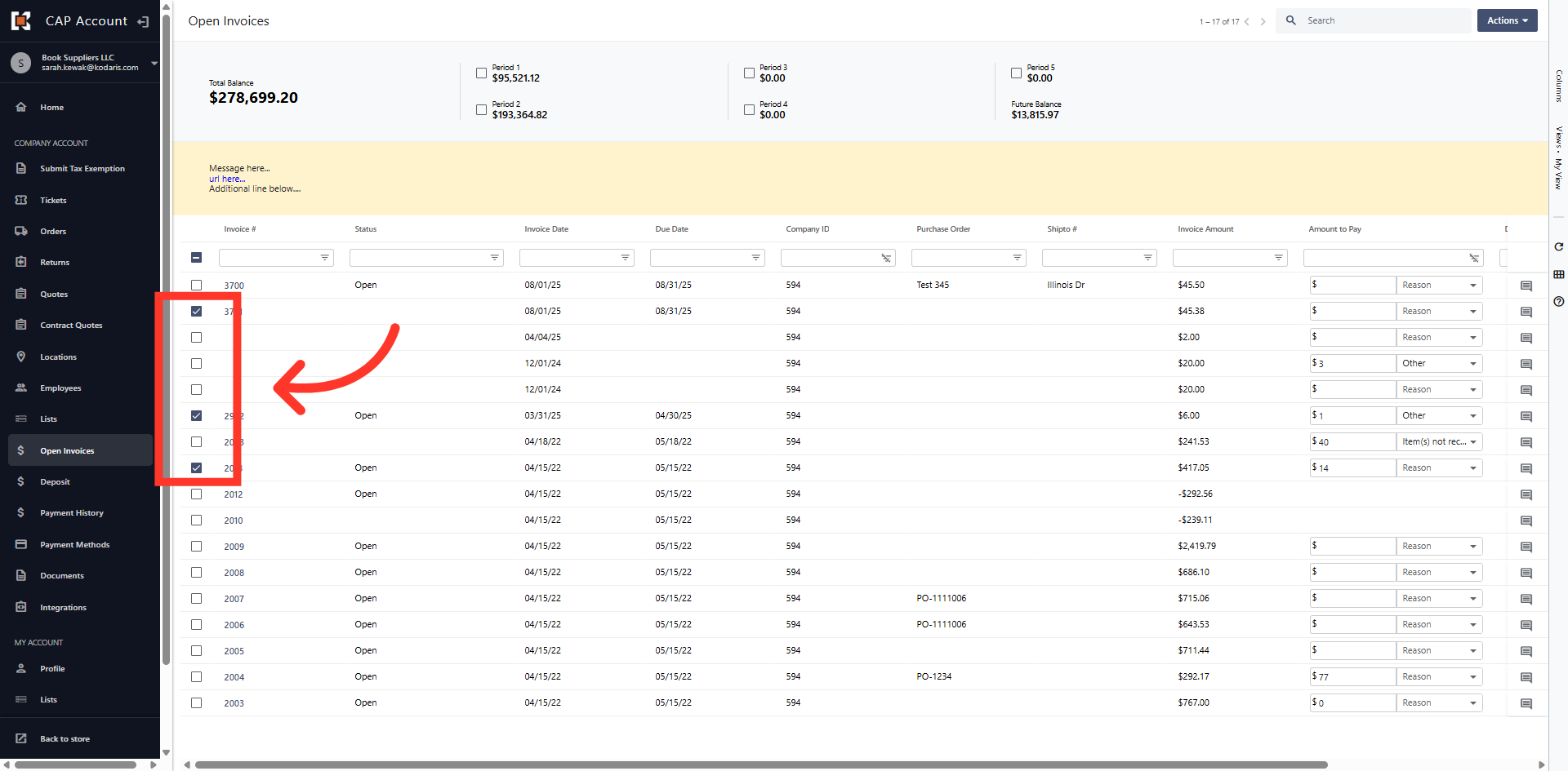 To select and pay open invoices, you will first navigate to the "Open Invoices" section in the Customer Portal. In order to select and pay open invoices, you will need to have the permission of "Accounts Payable".
