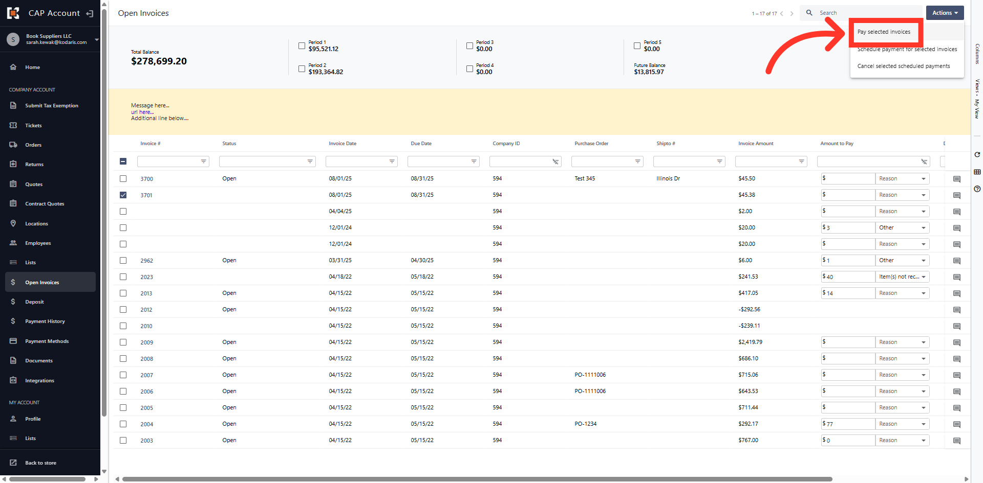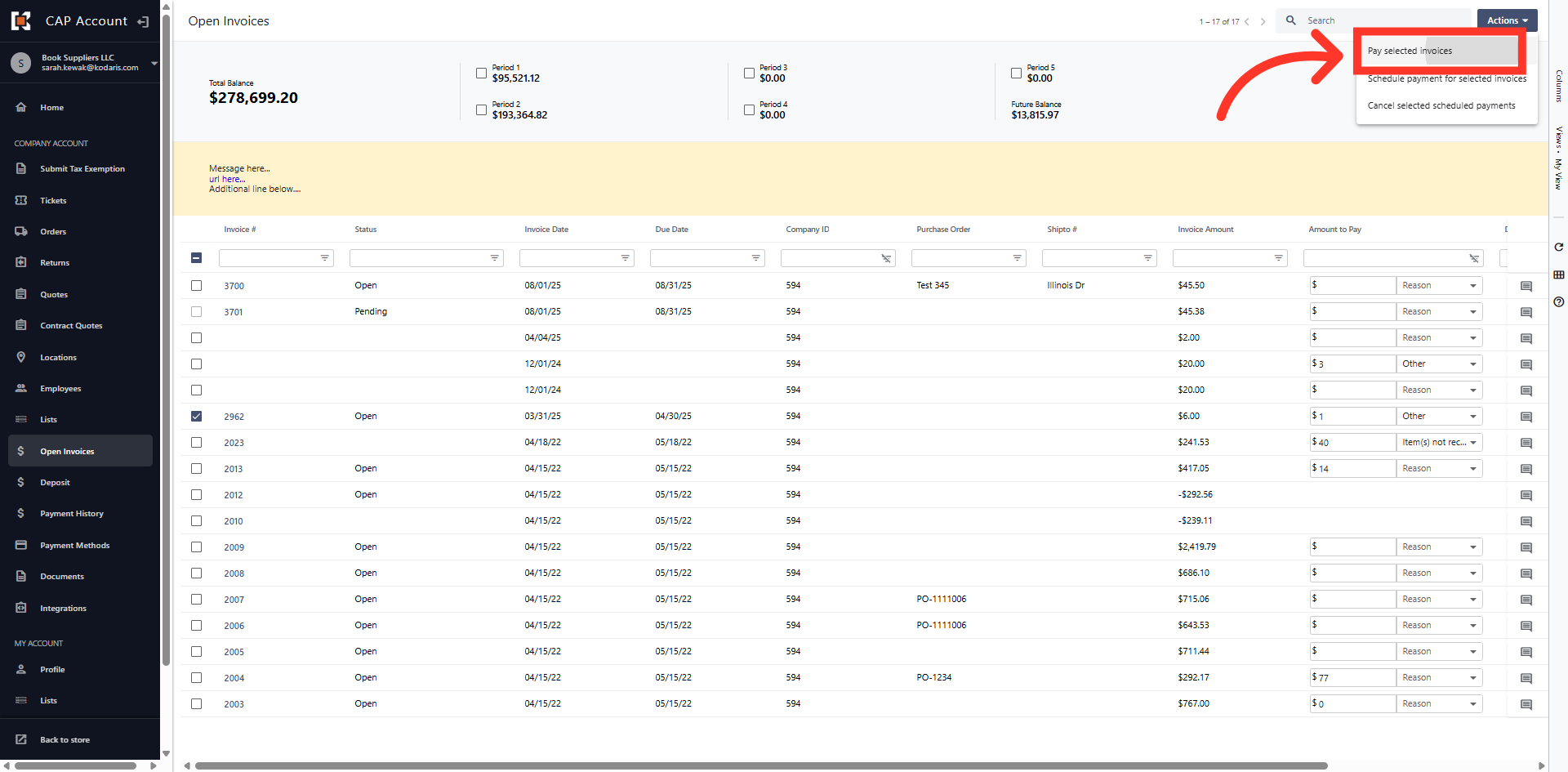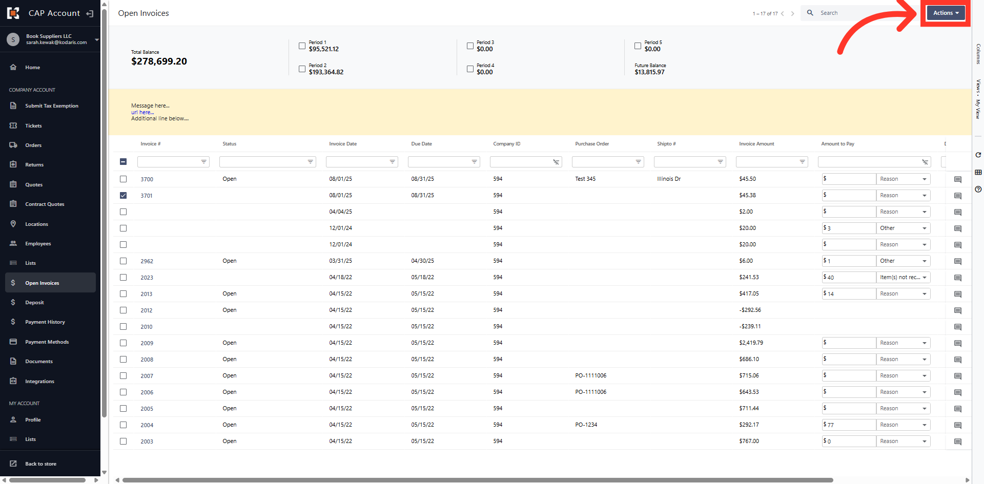 Once you have your invoices selected, click the "Actions" button on the upper right hand side of your screen.