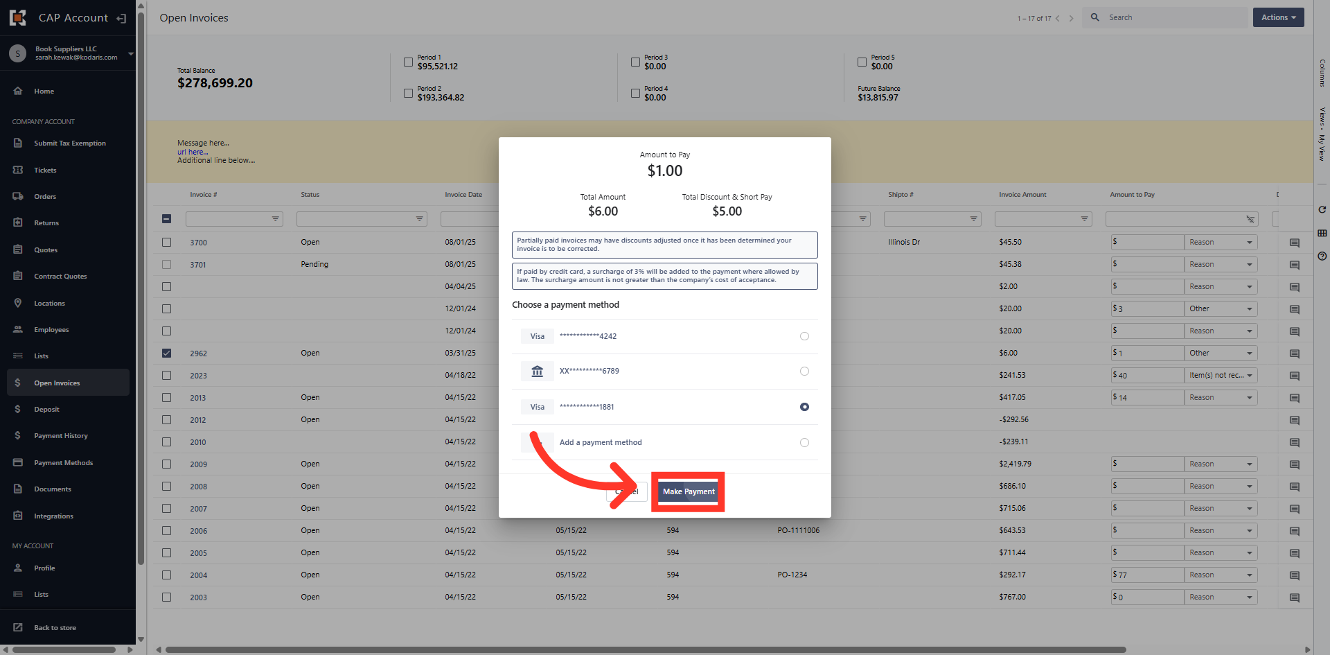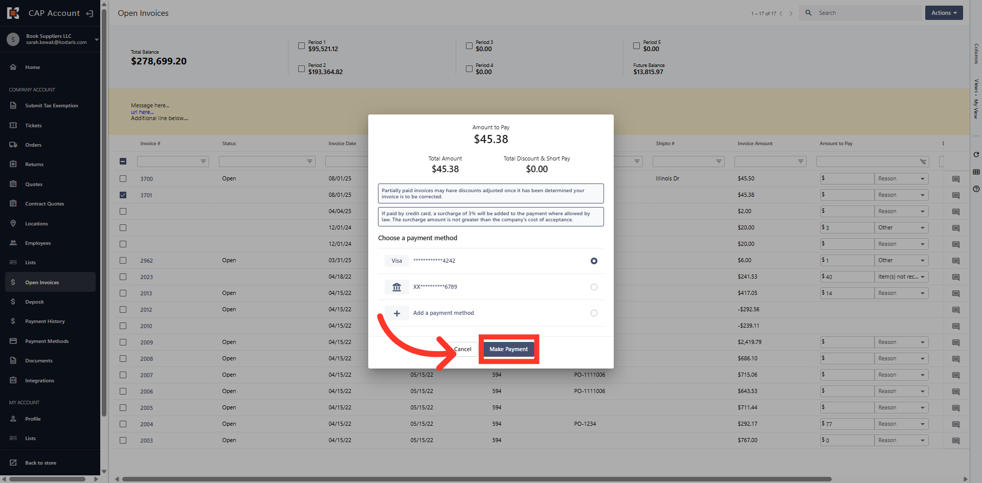 Click the "Make Payment" button to submit your payment to complete the transaction and update invoice status.
