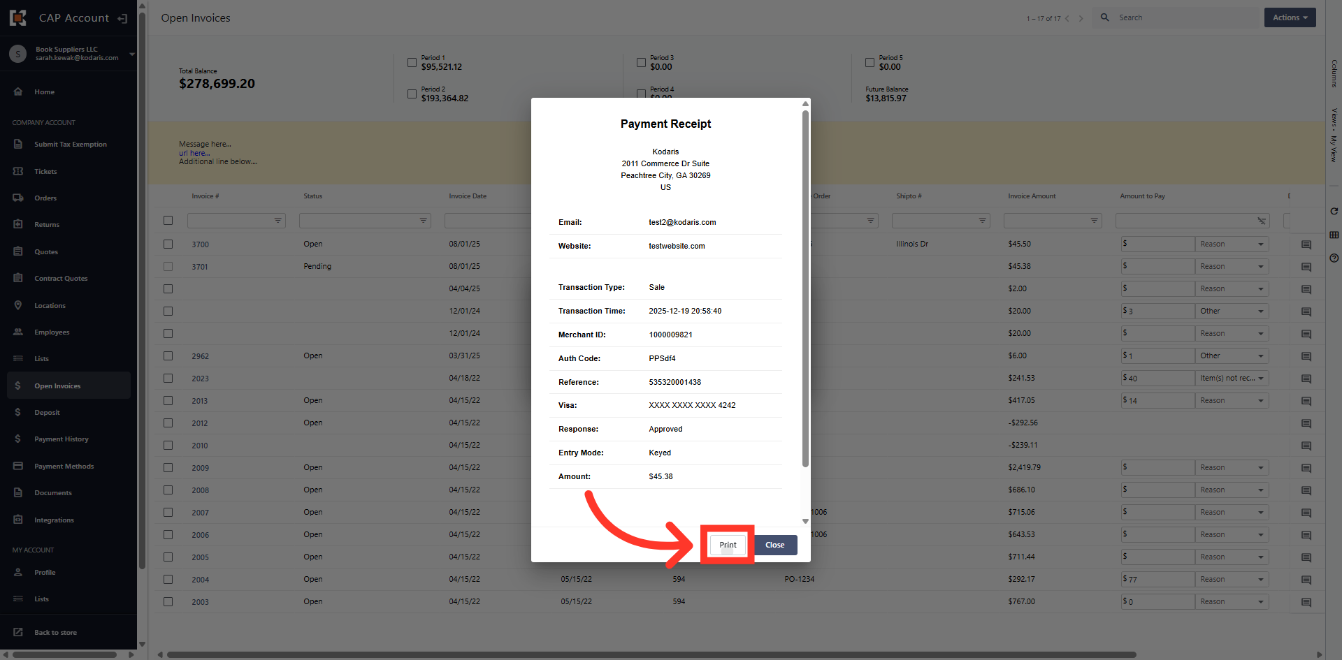 The payment receipt lists payment details. You can also "Print" the receipt from this view.