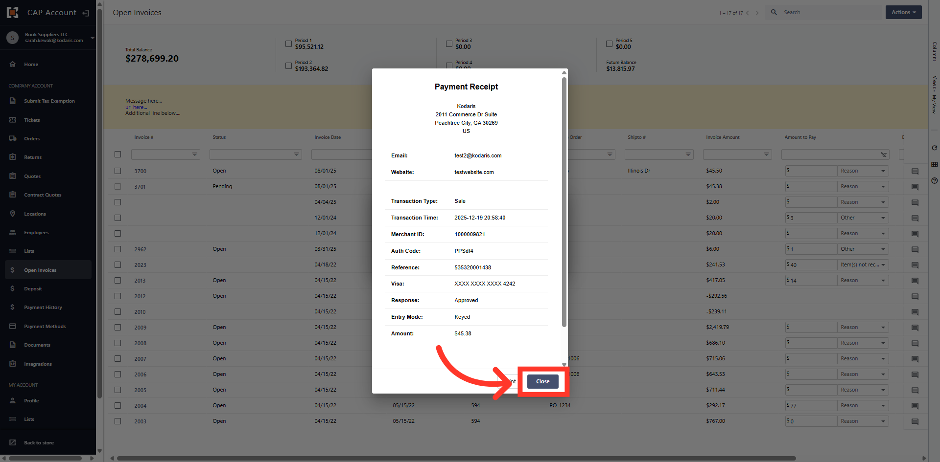 Click "Close" to close the receipt and return to the payment confirmation message.