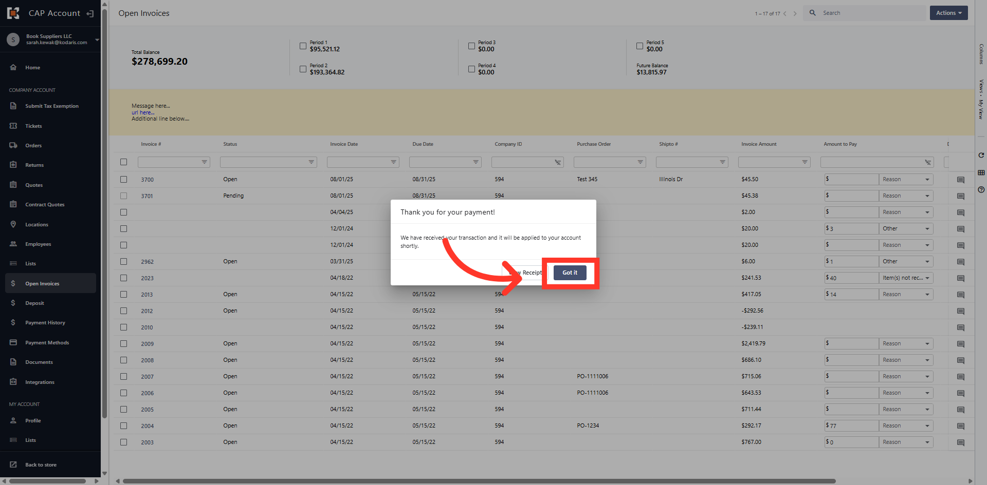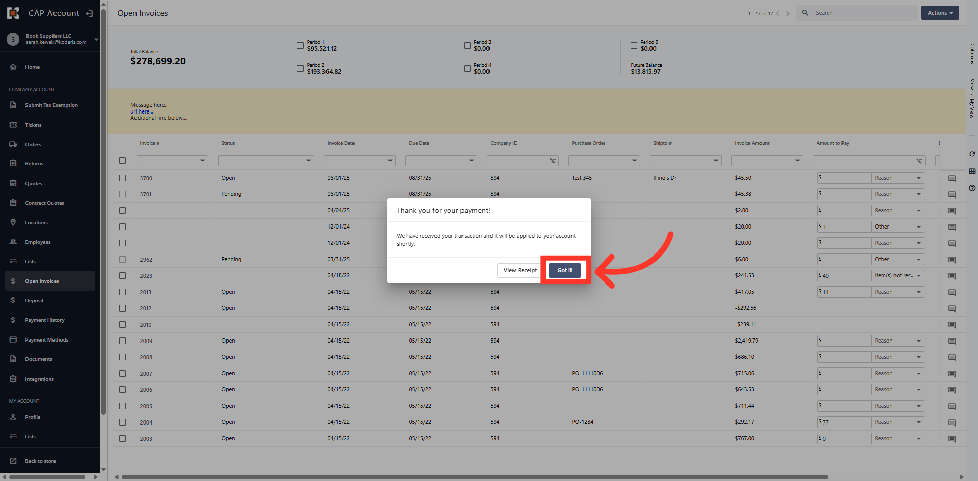 A payment confirmation message will be displayed and you can view the receipt or click "Got It" to return to the "Open Invoices" dashboard.