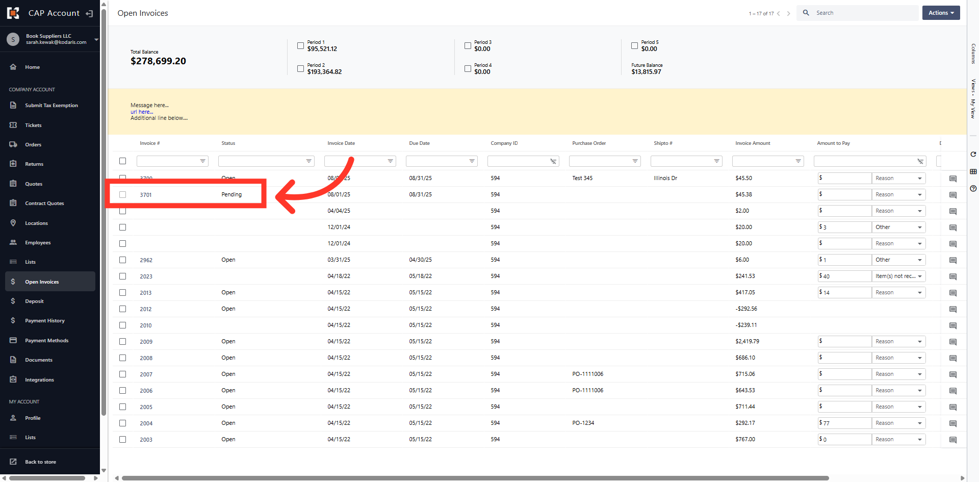 Notice the invoice status changed from "Open" to "Pending" and the check box has been greyed out. This prevents you from selecting the invoice again and making a duplicate payment.
