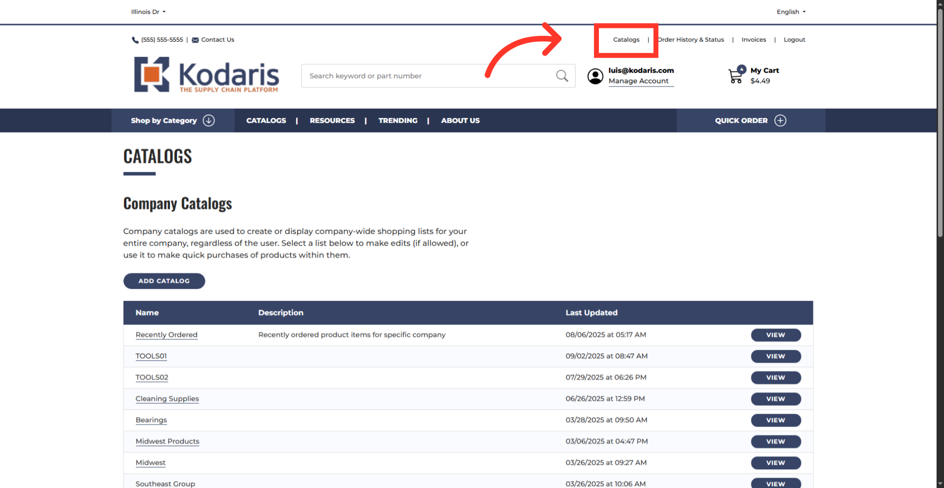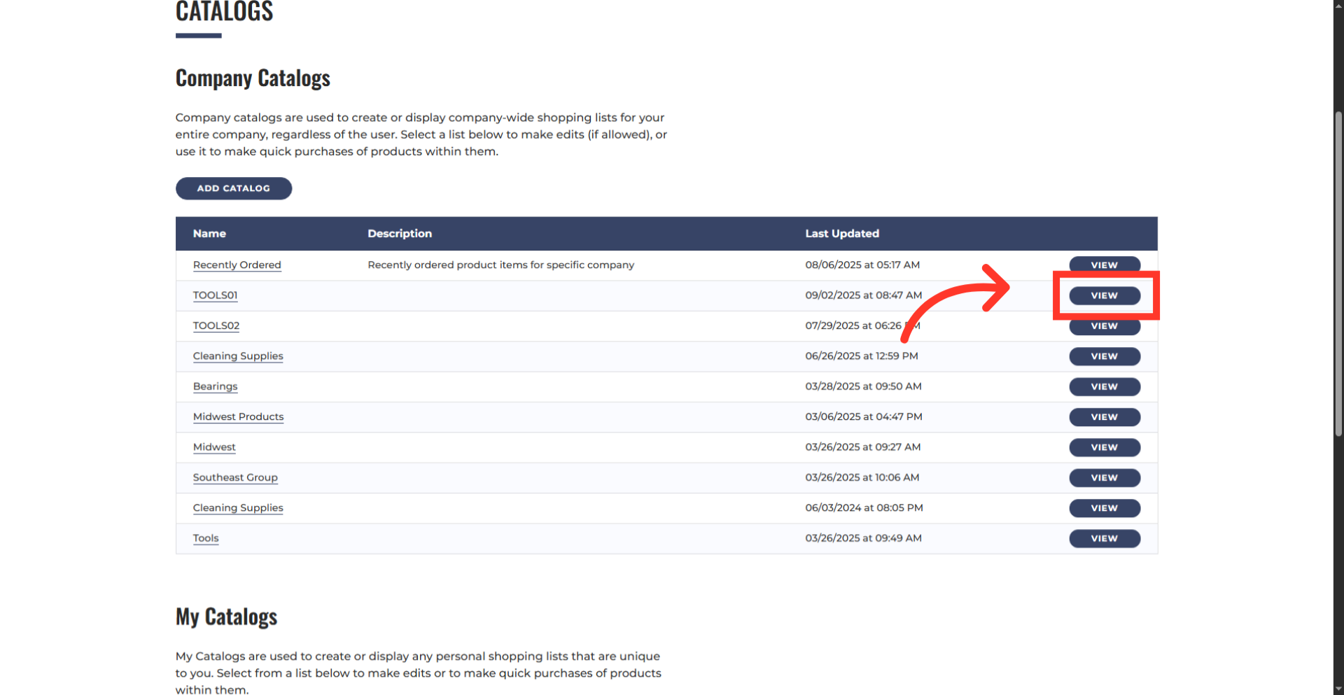 Click the "View" button of the company catalog you want to work with.