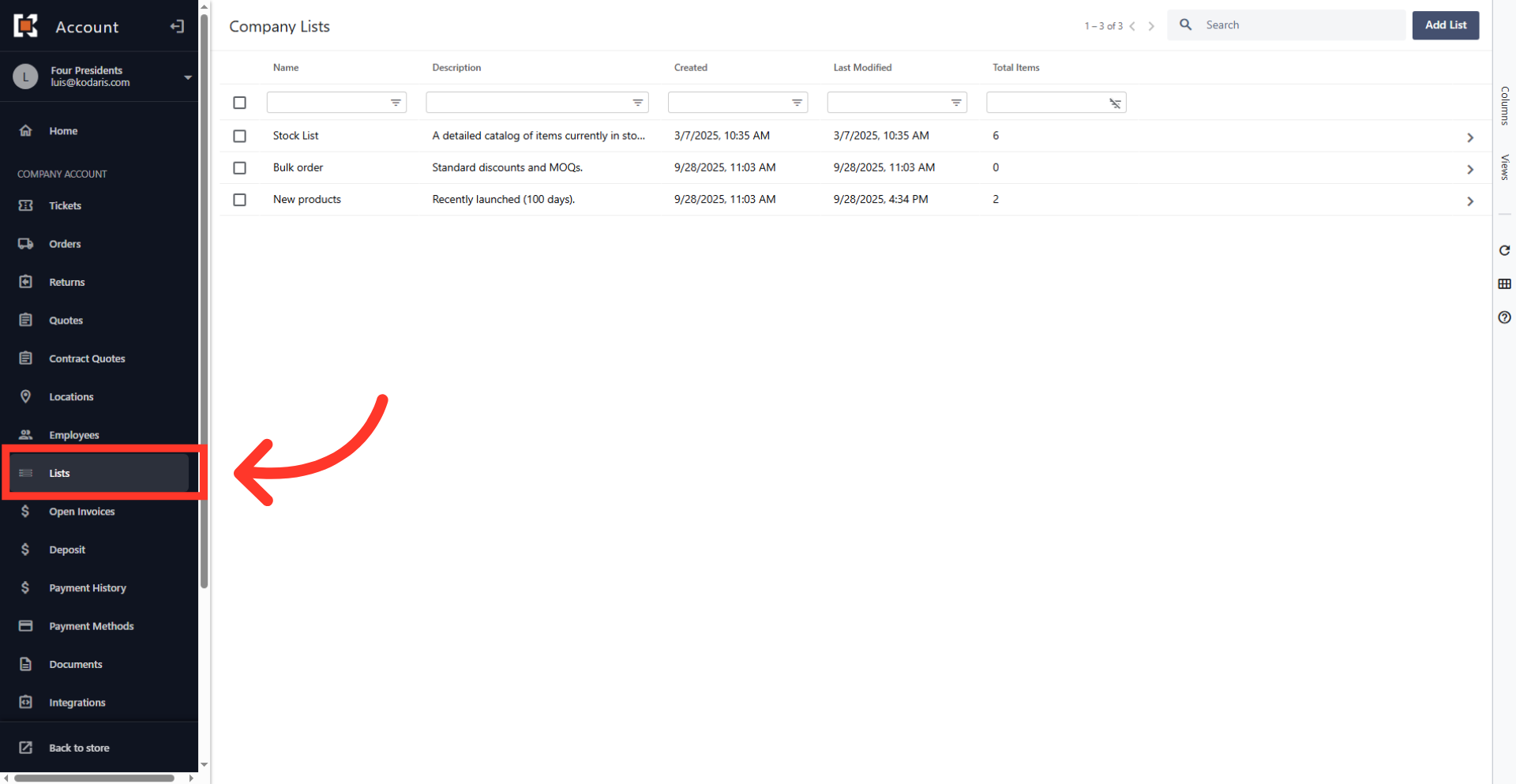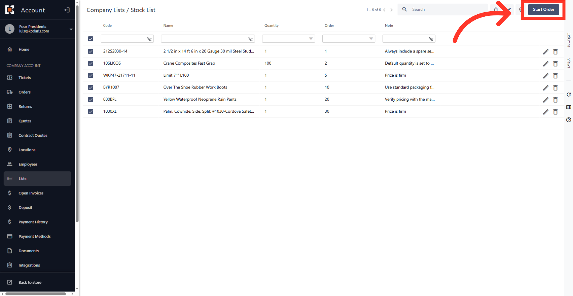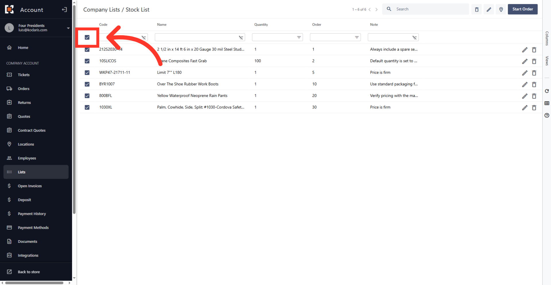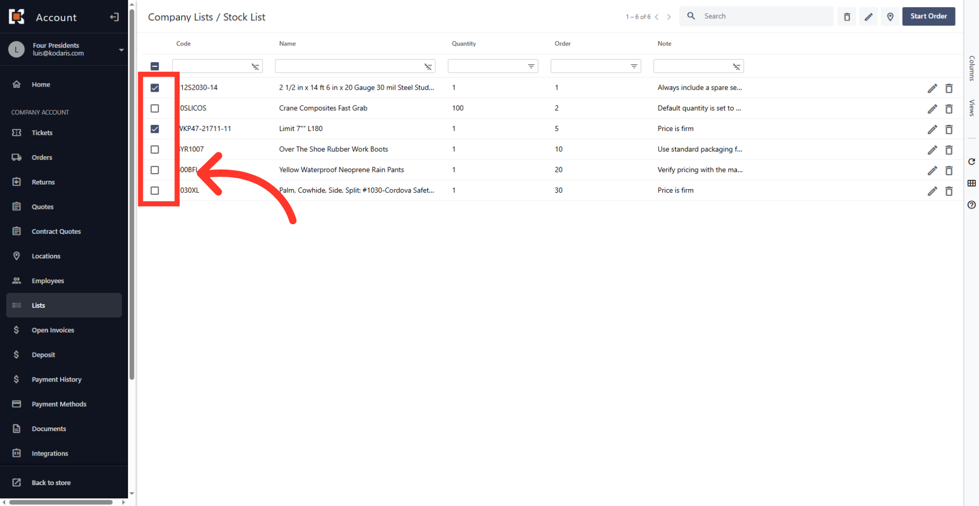 When you order from a product list, you can select items that you would like to order or simply click "Start Order" which will add all the items on the list to your cart. Such functionality is useful if you have very large lists and always order a subset of the items at a time. If this option is enabled, navigate to the "Lists" section in your customer portal.
