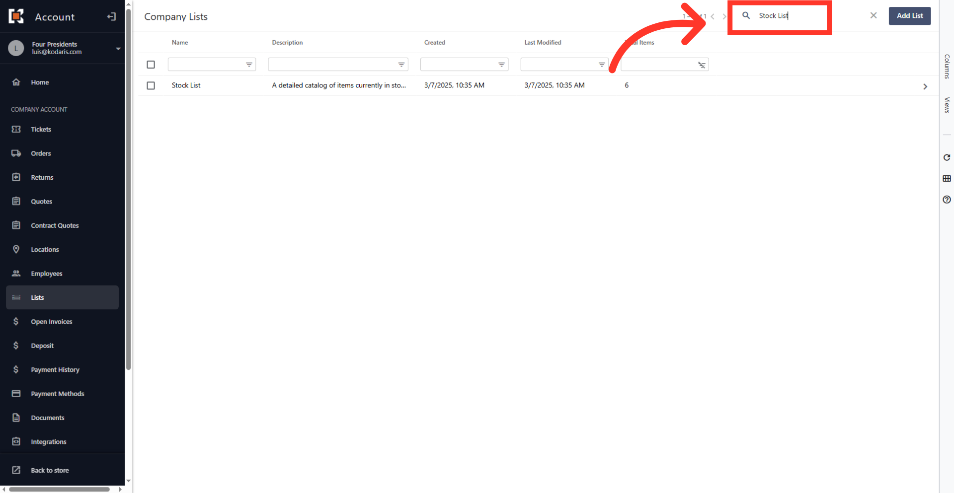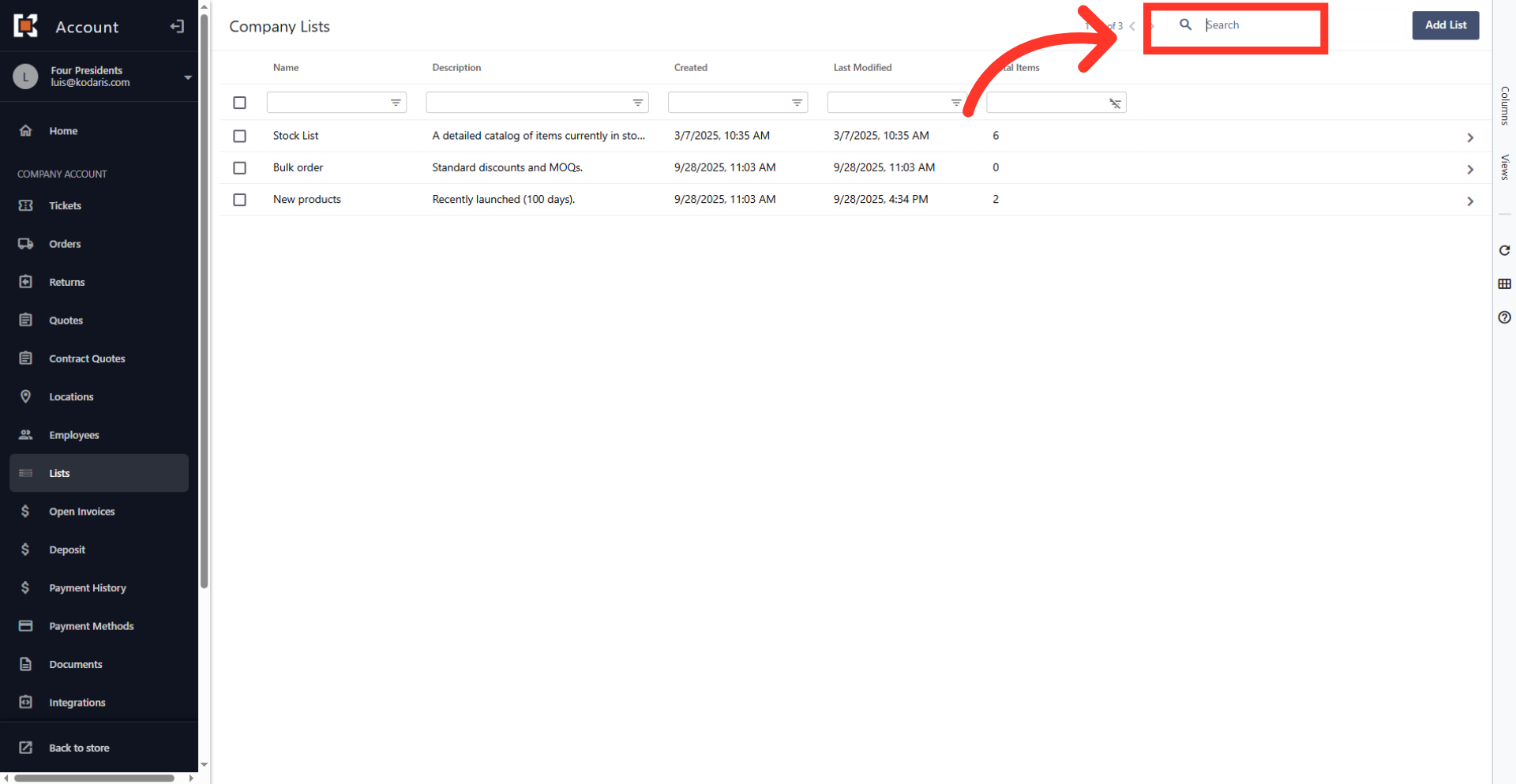 The screen will display a list of all pre-existing product lists currently set up in the system. Click on the "Search." field to input a query and filter the displayed list.