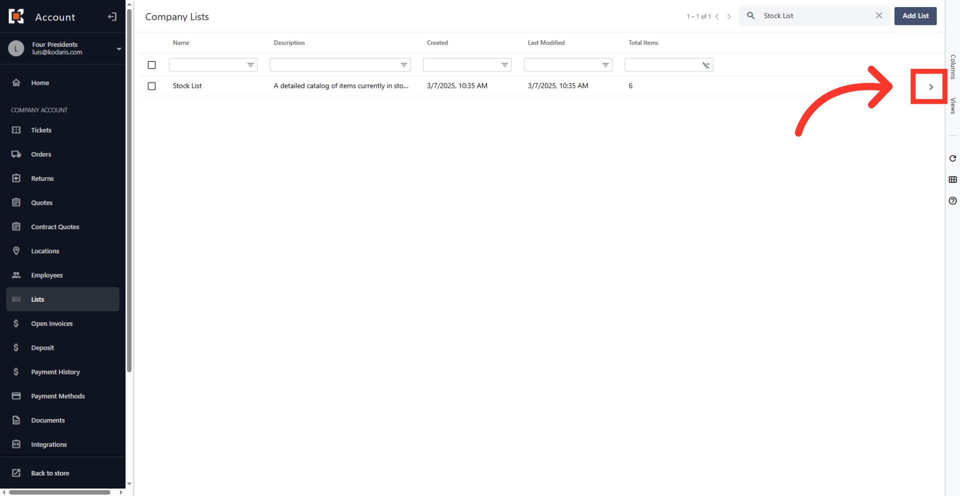 Once the target list is located, click the more details icon to access the list details.