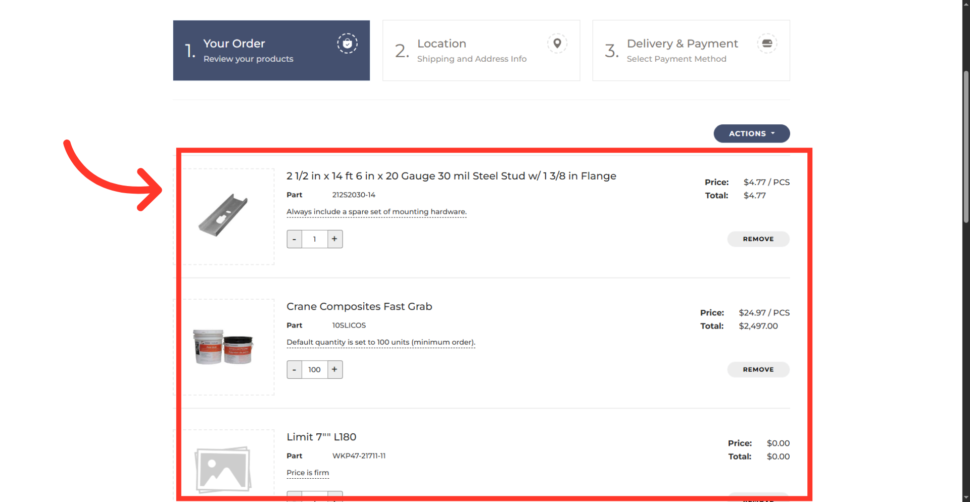 Use the checkboxes next to each item to include specific products from the list in the current order.