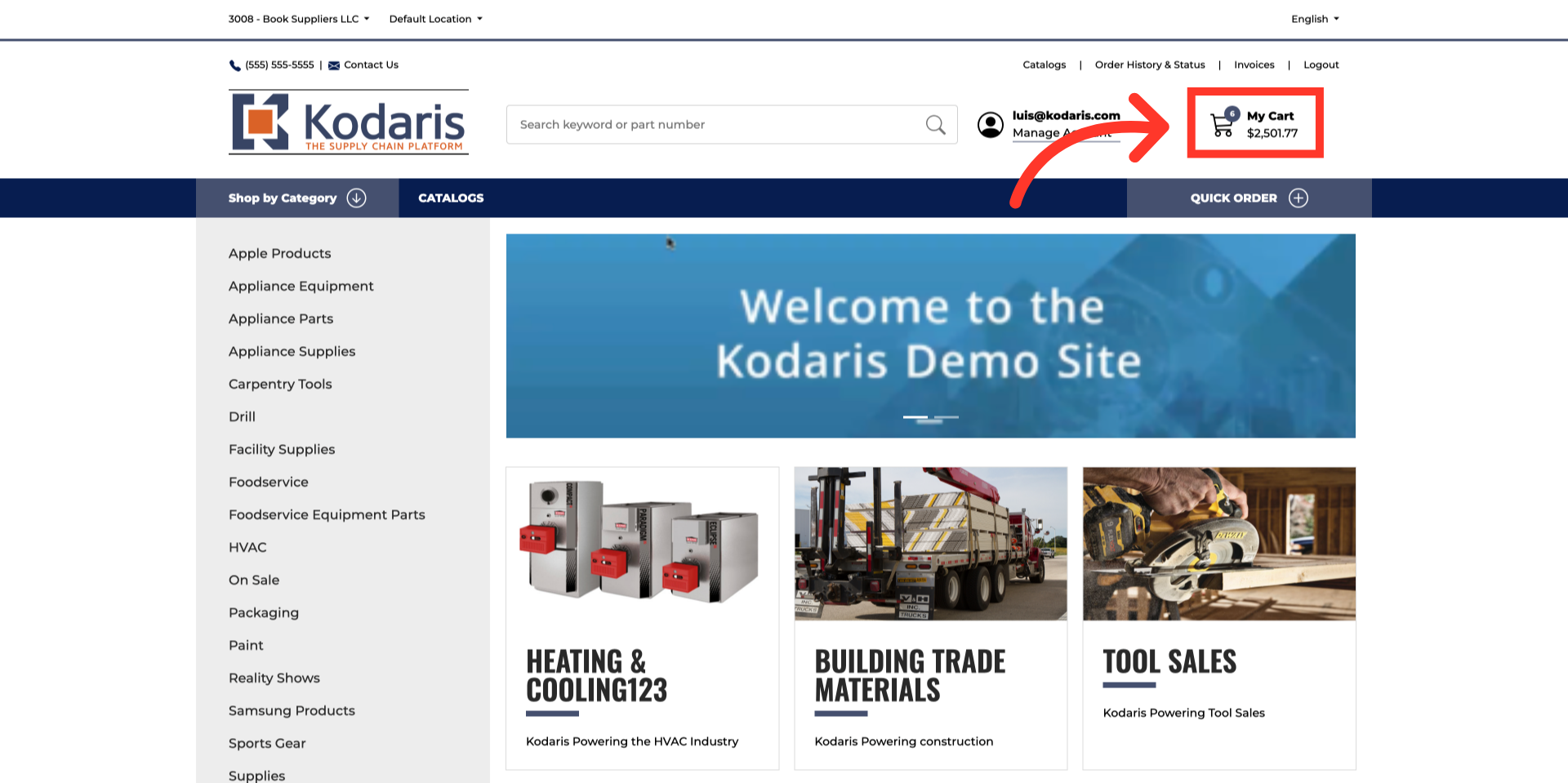 The bulk product upload feature allows users to quickly add multiple products to their shopping cart by importing data from spreadsheet files. Instead of manually searching for and adding products one by one, users can prepare a structured file containing product codes and quantities, then upload it directly to populate their cart efficiently. Log in to the commerce site and click "My Cart".