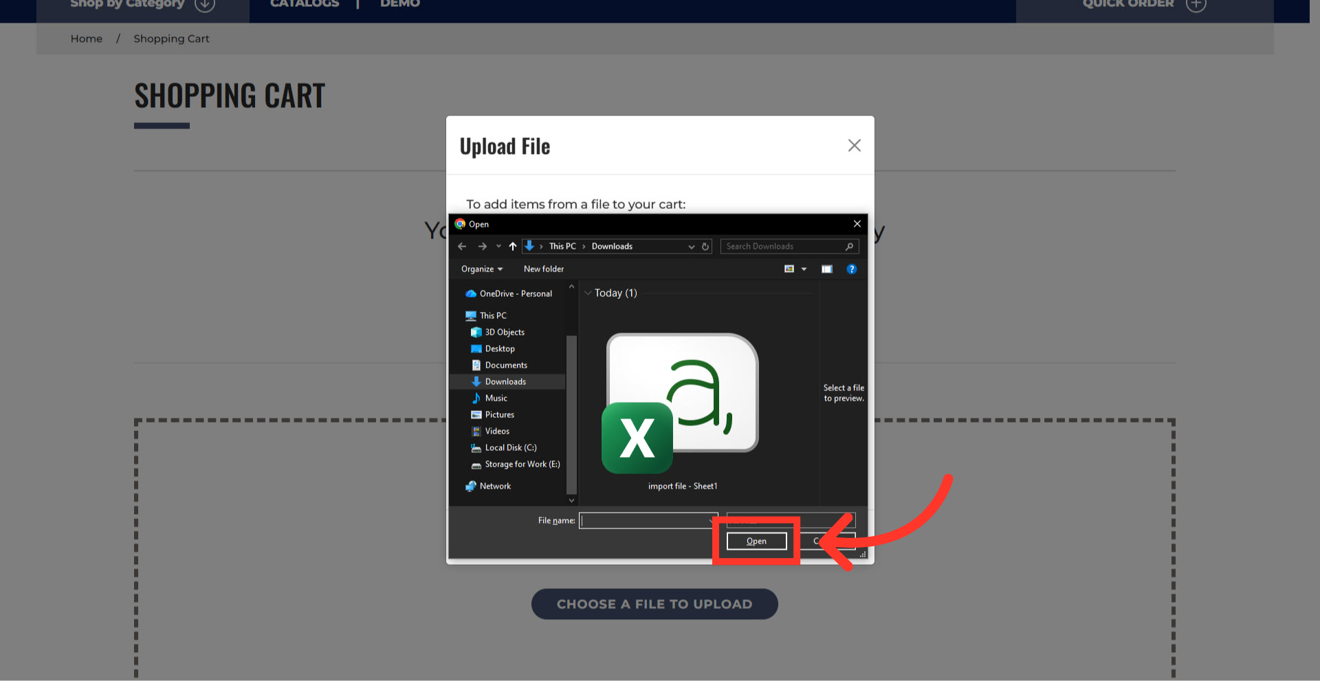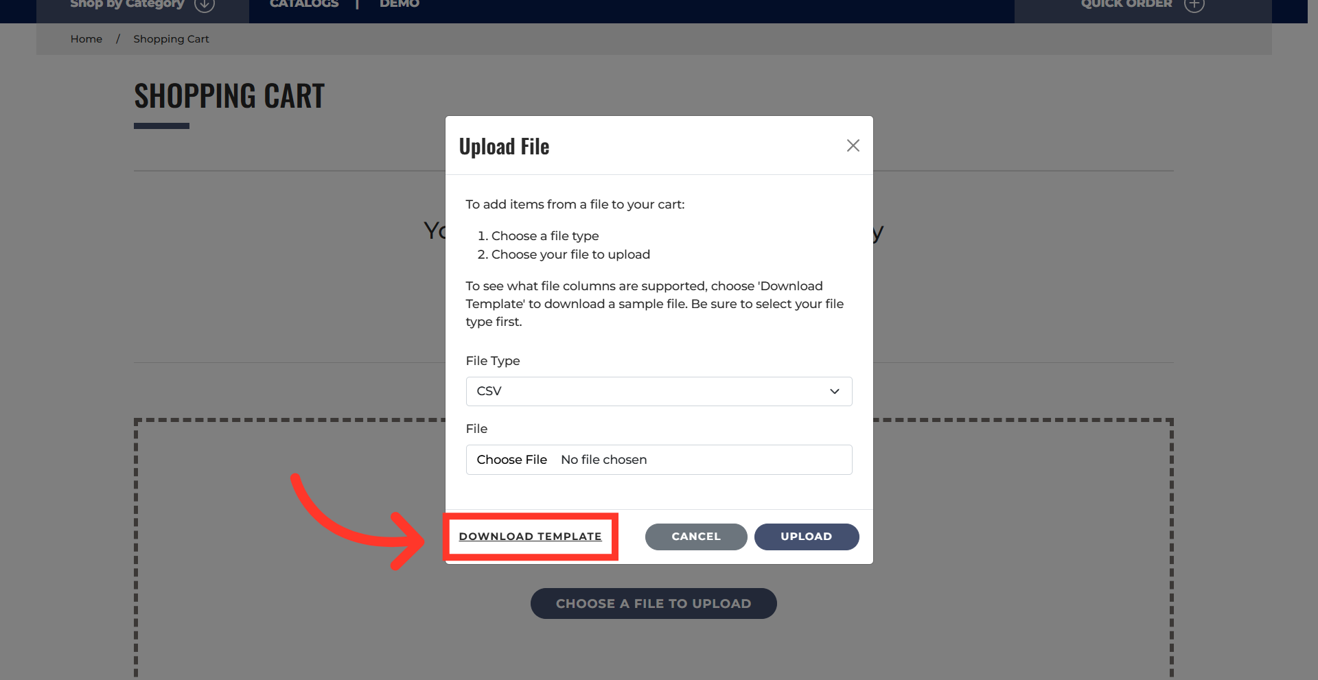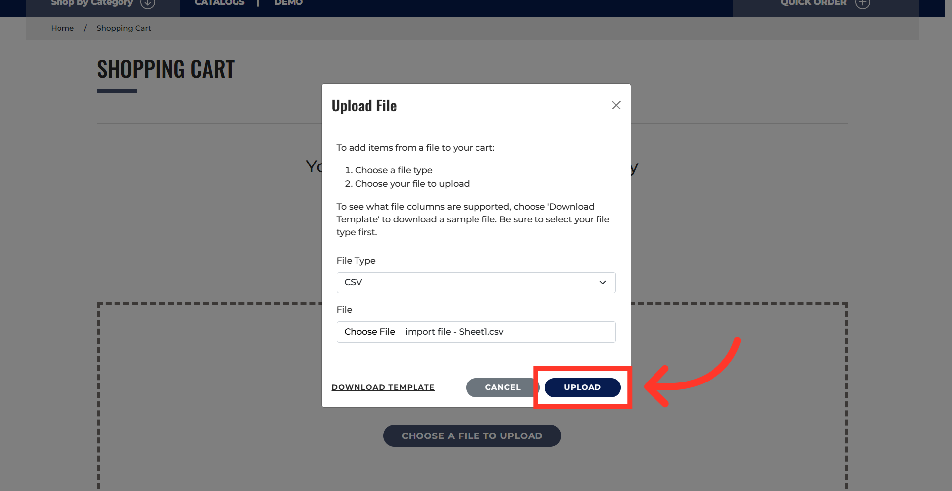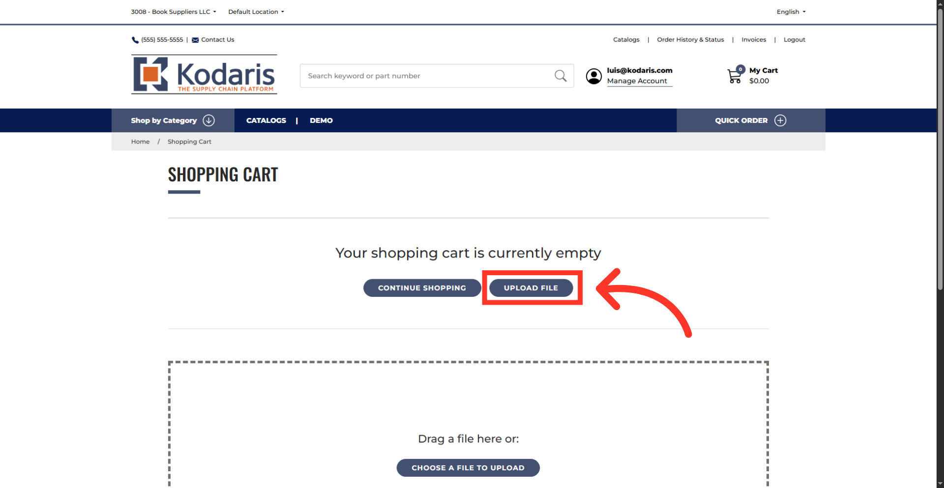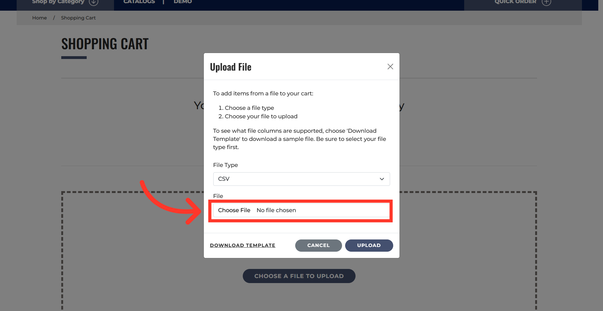 The "Upload file" and "Choose a File to Upload" buttons appear when the cart is empty. Both options can be used for product uploads from CSV, TSV, or Excel files. Click "Upload file" button.