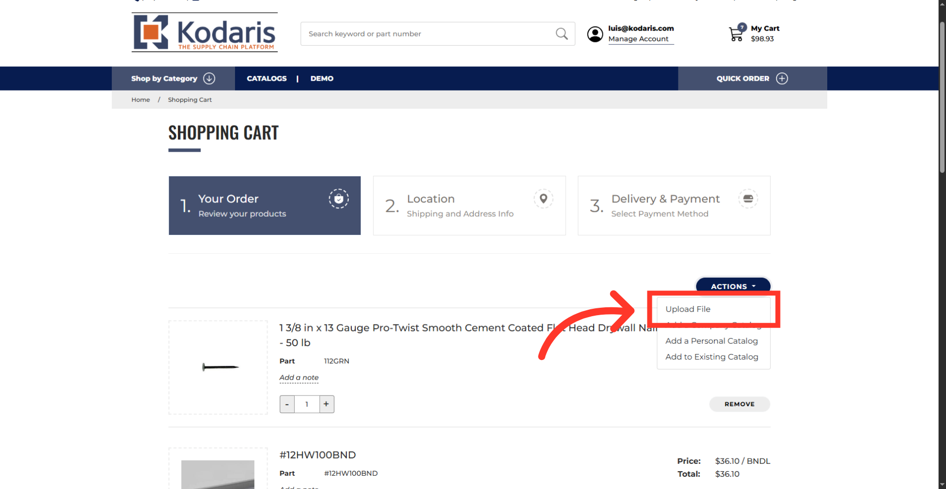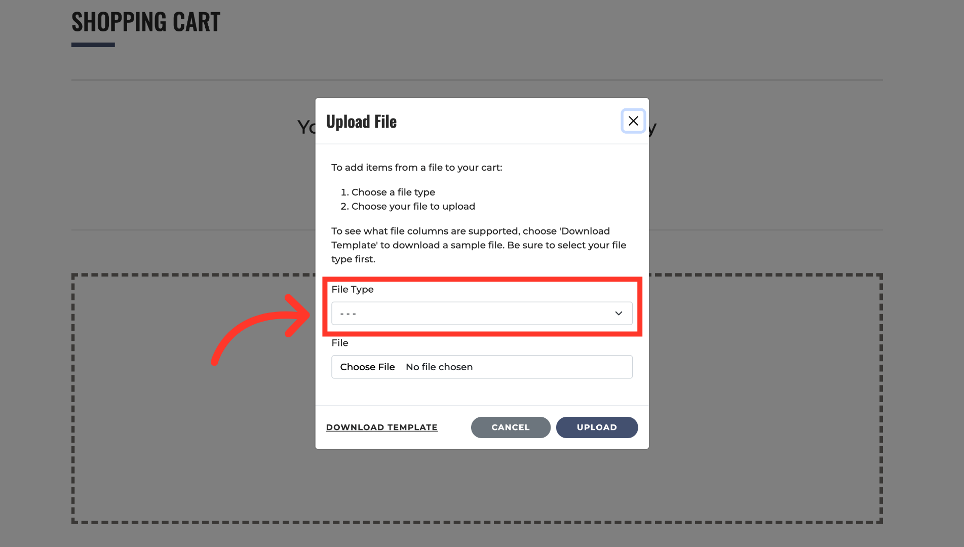 Select "Upload file." The same upload window will appear. You can then select your next file to add products to your existing cart.