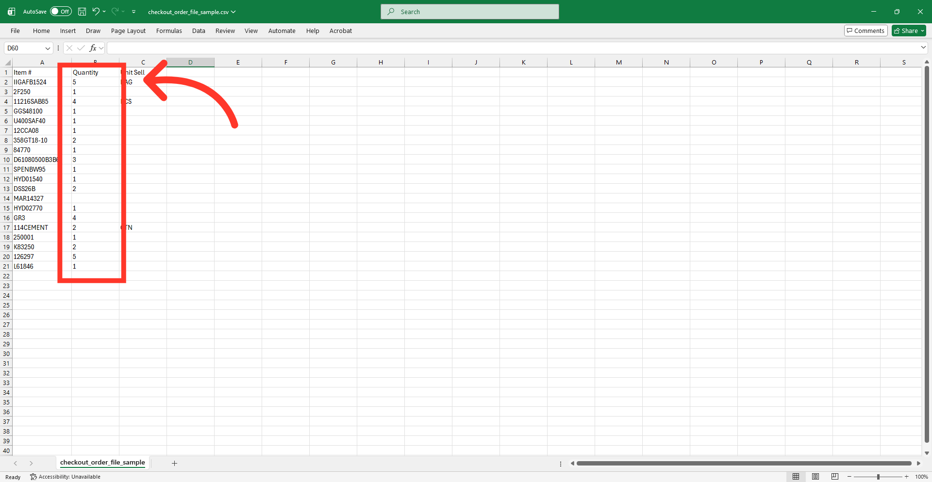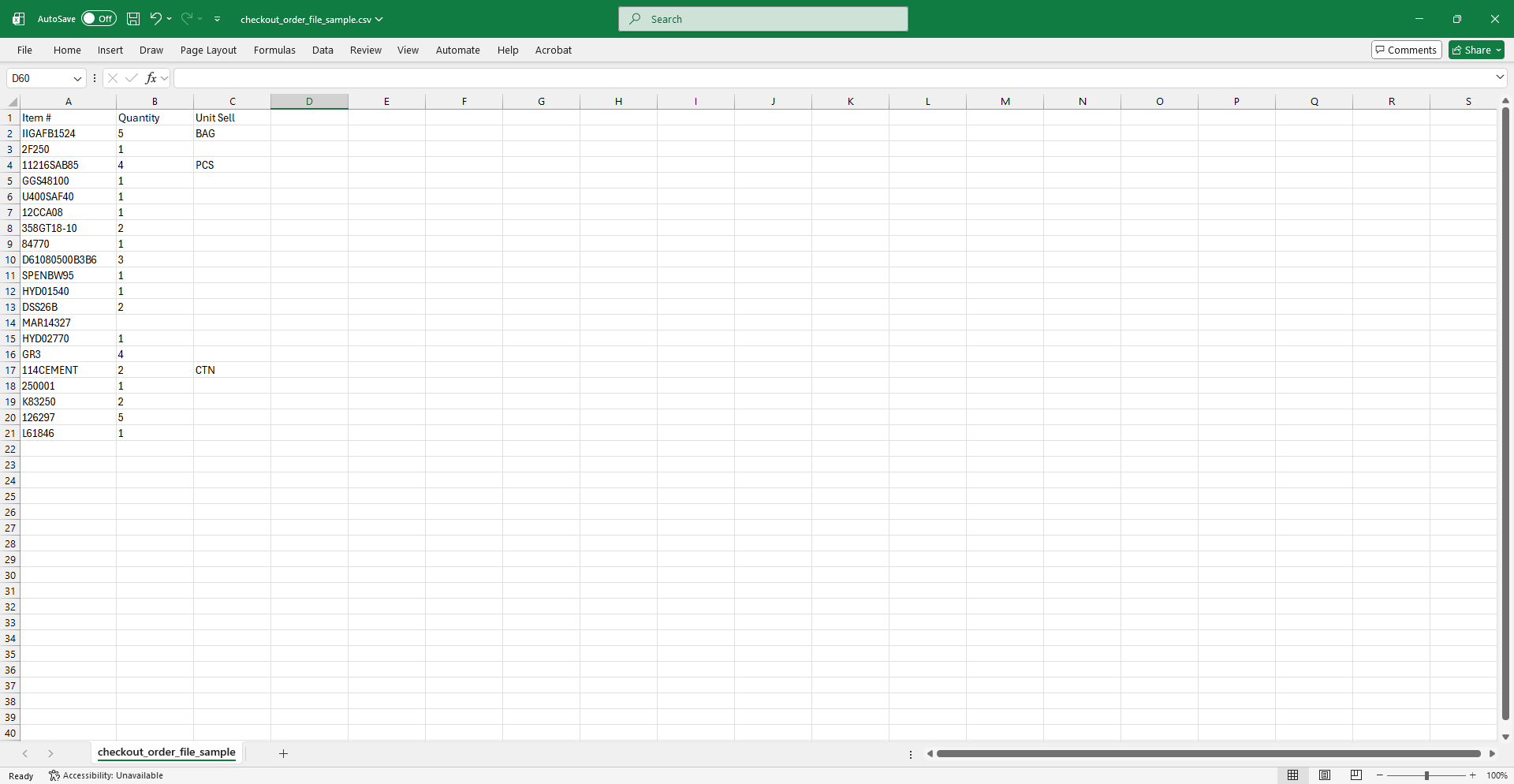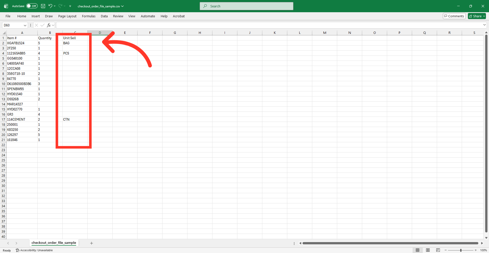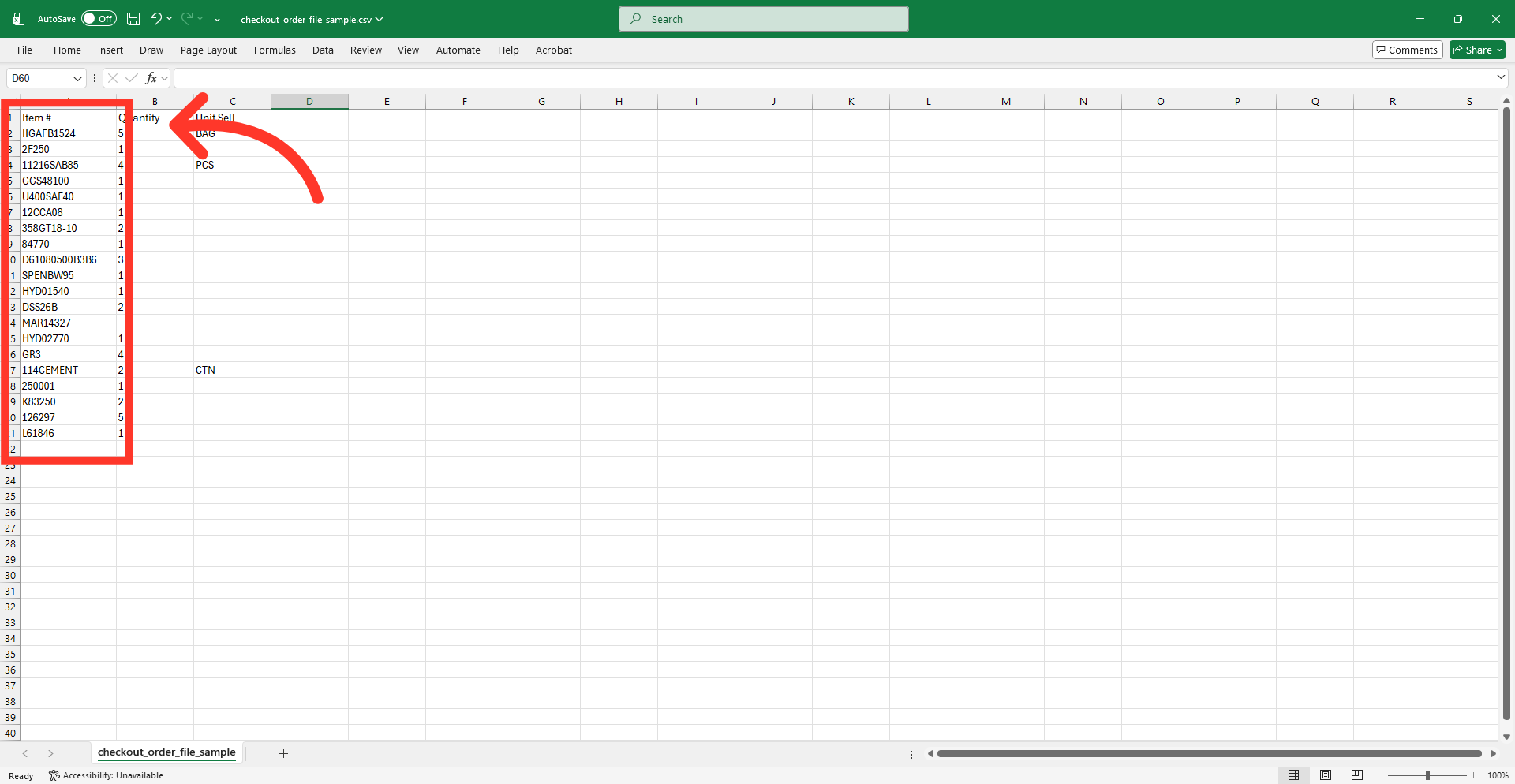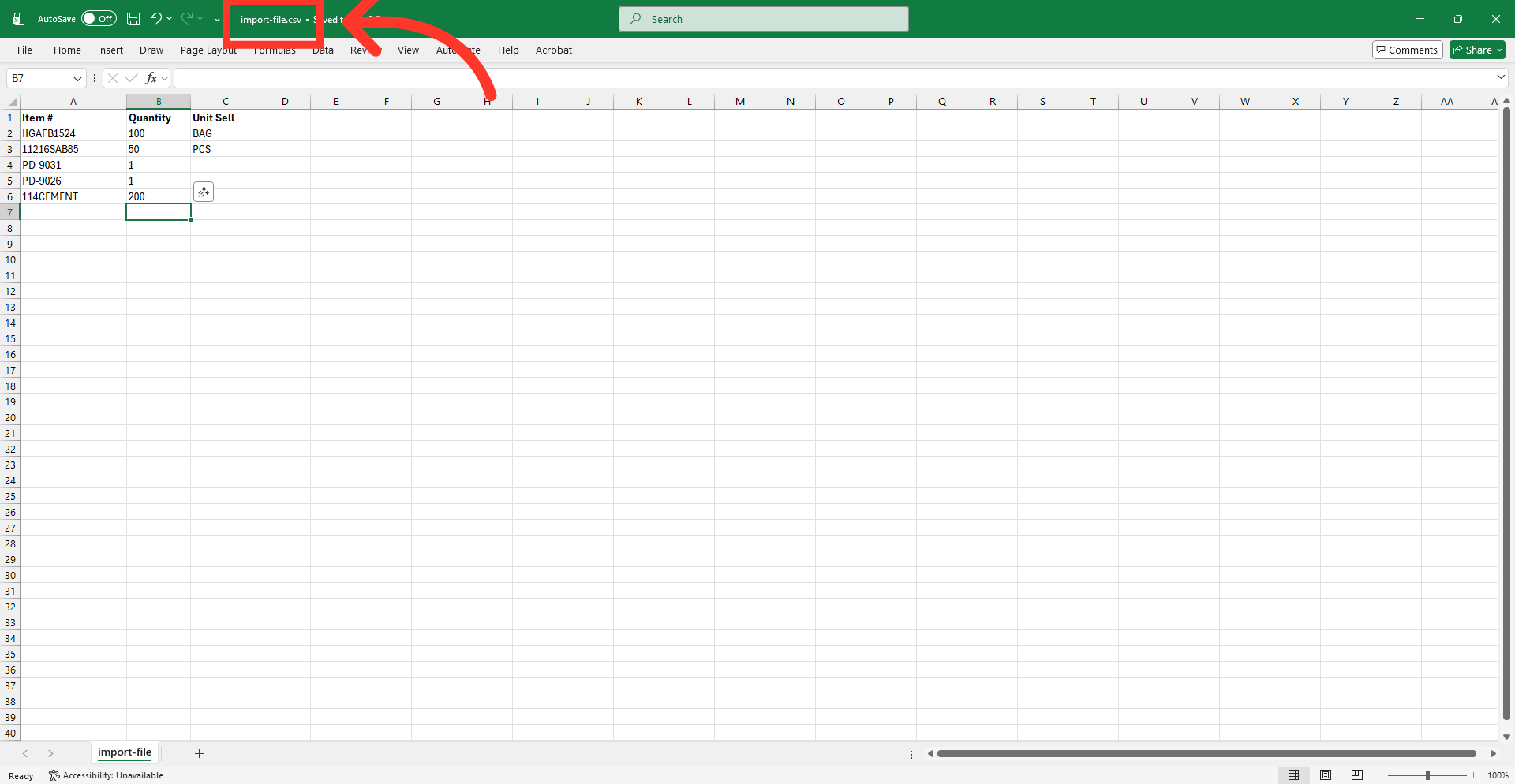 The template contains the necessary header rows for the import. All file types require the same data. Enter the product codes, quantities, and units that you would like to upload.