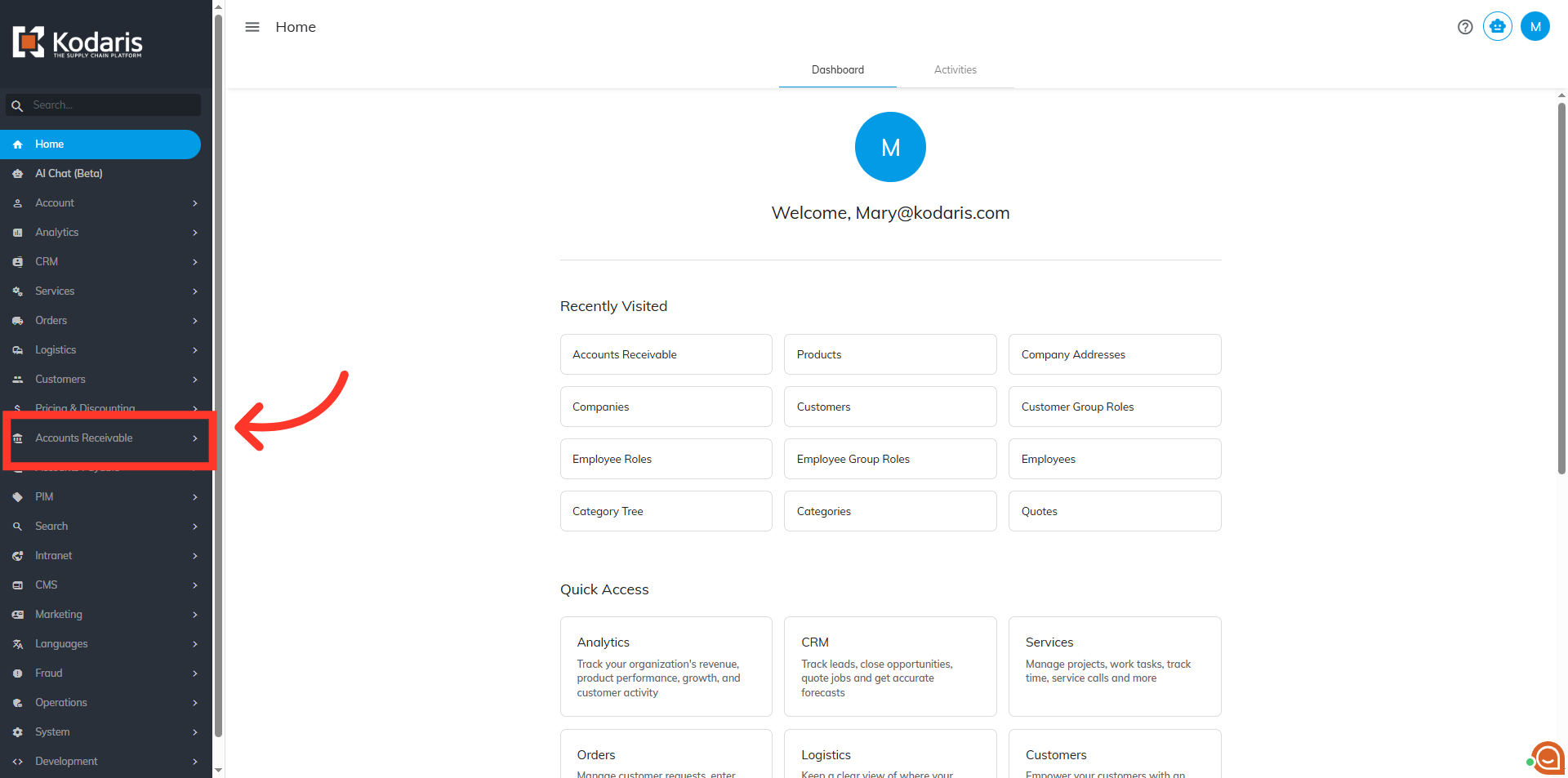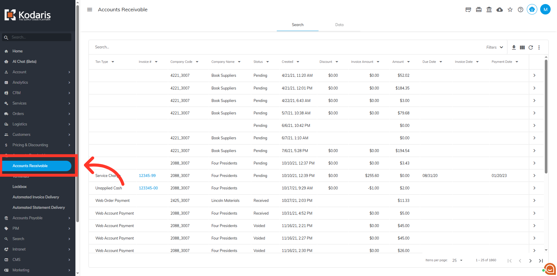 Then, select the "Accounts Receivable" menu. In order to access "Accounts Receivable",you will need to be set up either as an "administrator" or a "superuser", or “accountant” or have the following roles: "paymentEdit and paymentView”.