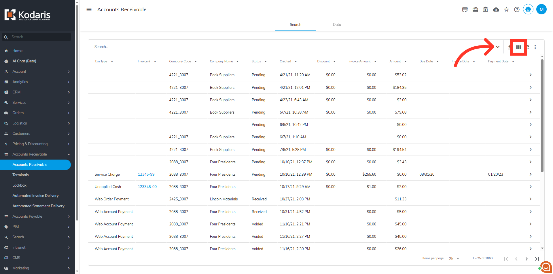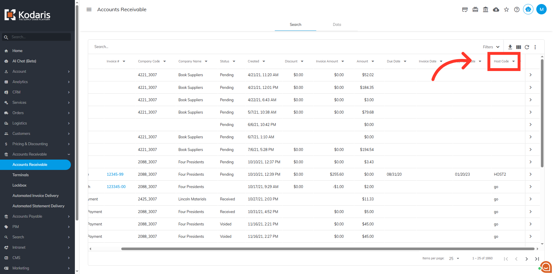 By default, the Host Code field is not visible here. To make it visible on the grid, click the "Show/Hide Columns" icon.