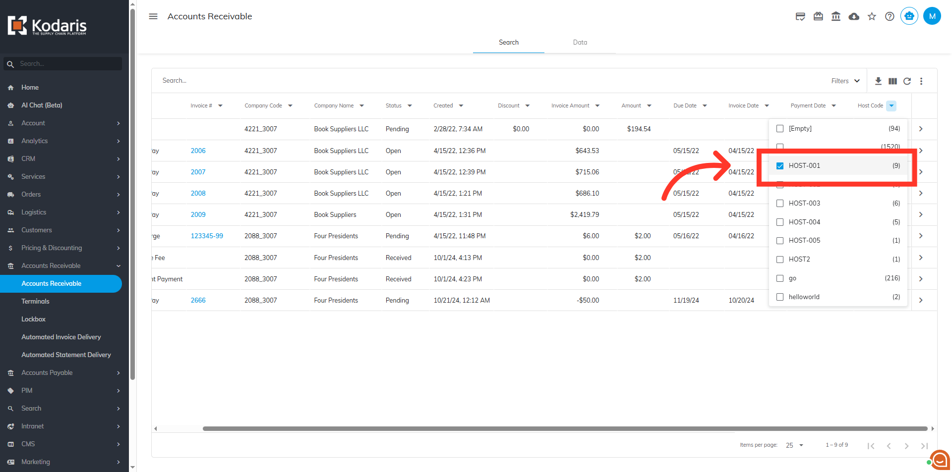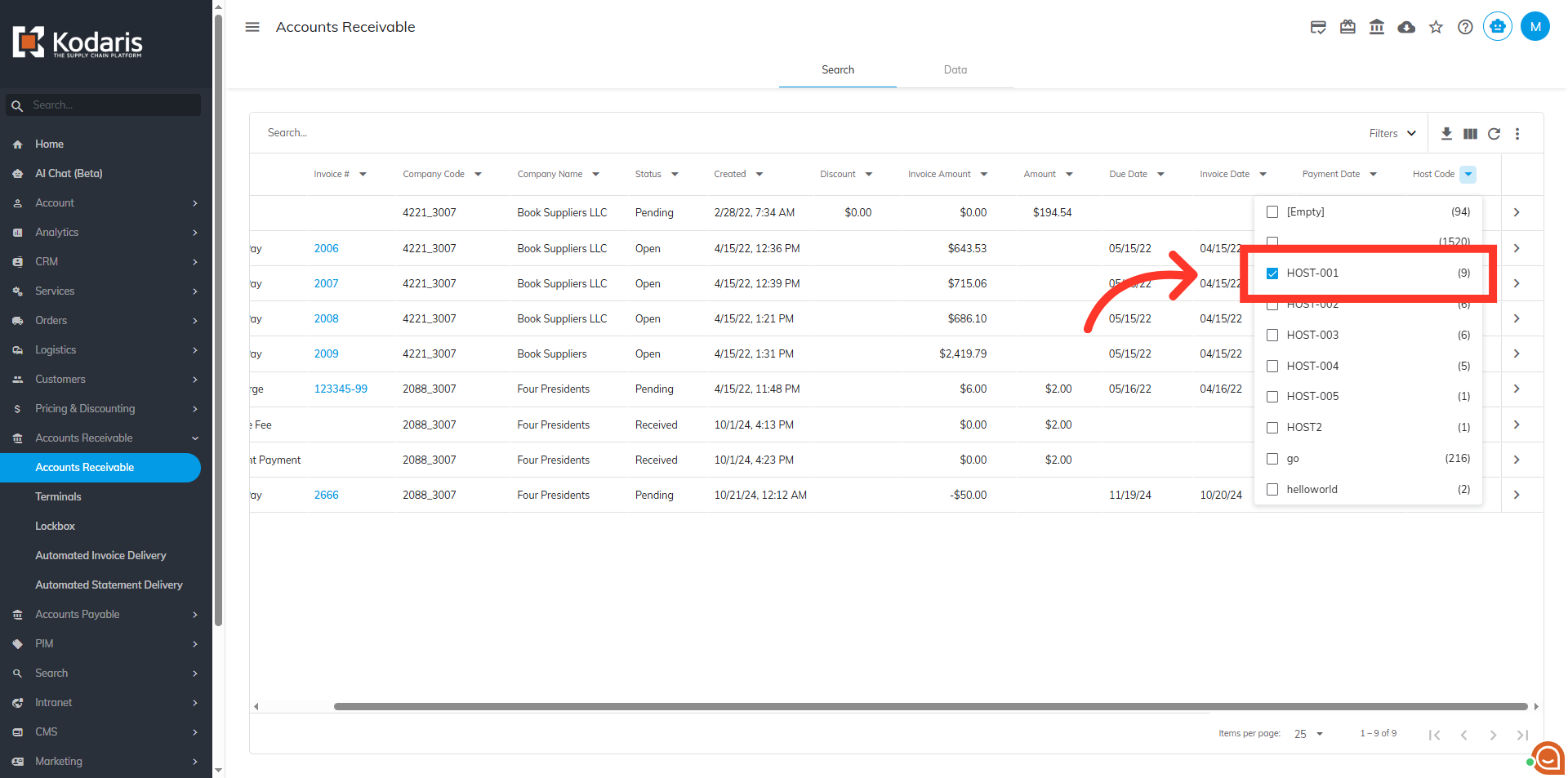 Filter the values in the "Host Code" column by clicking the column header to show the options.