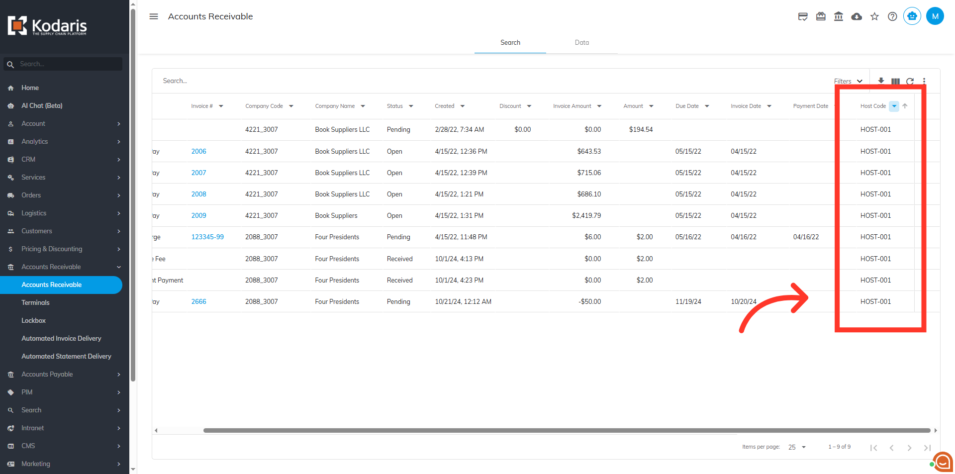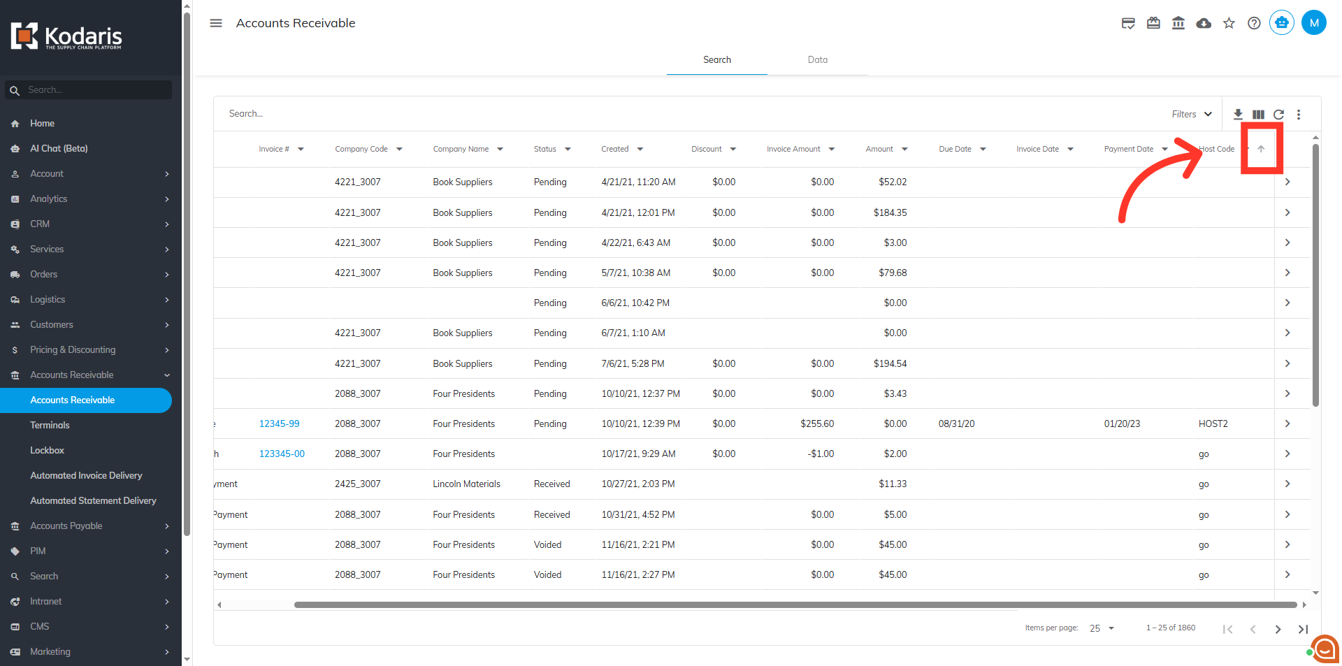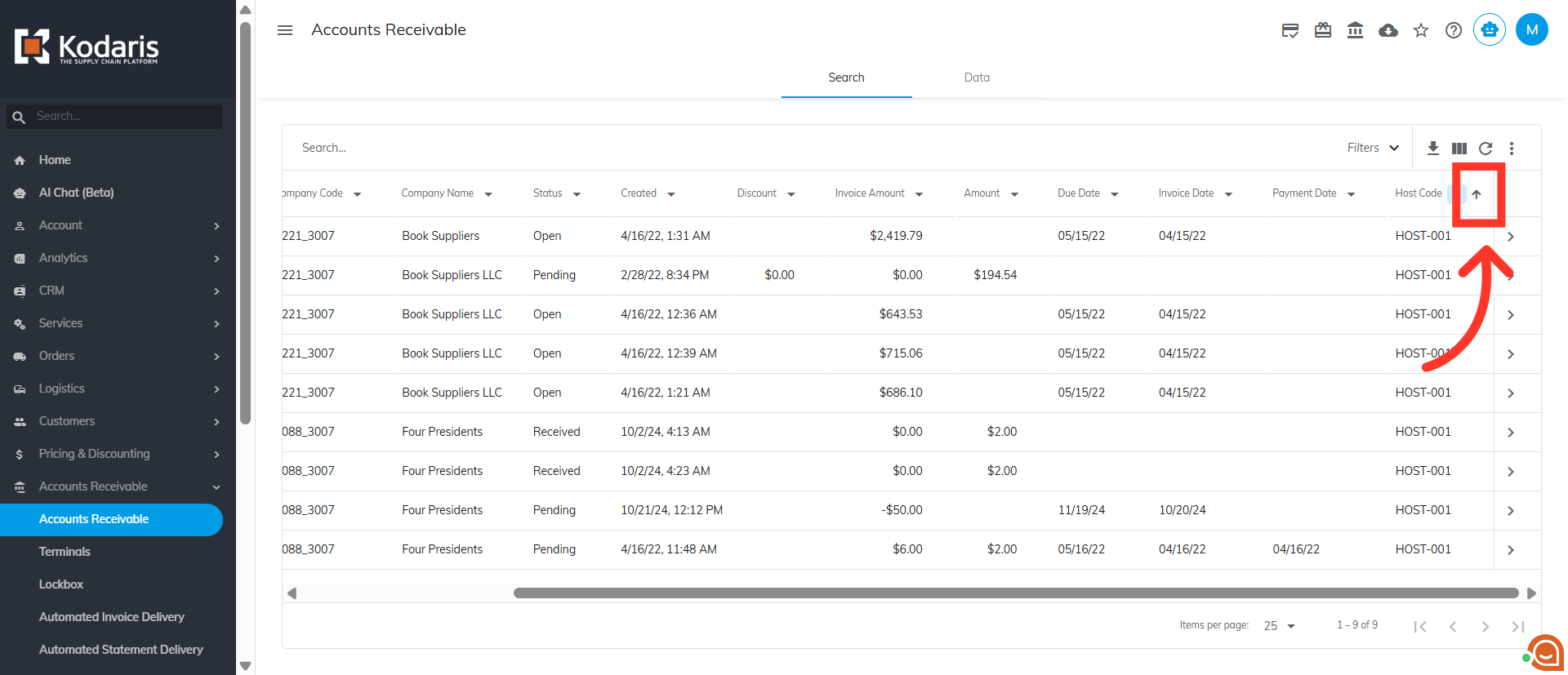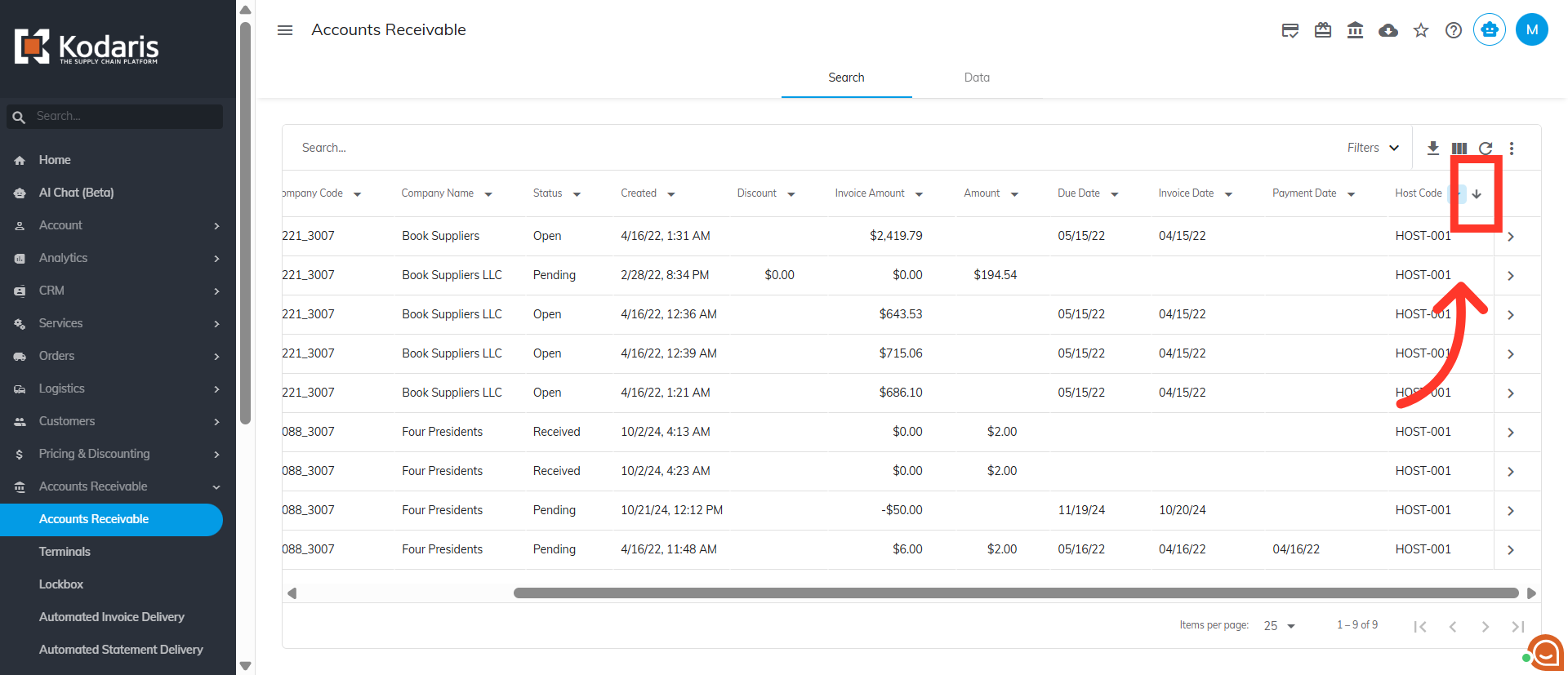 You can sort the "Host Code" data by clicking the arrow of the column header. If the arrow points upward, the payments are sorted in ascending order.