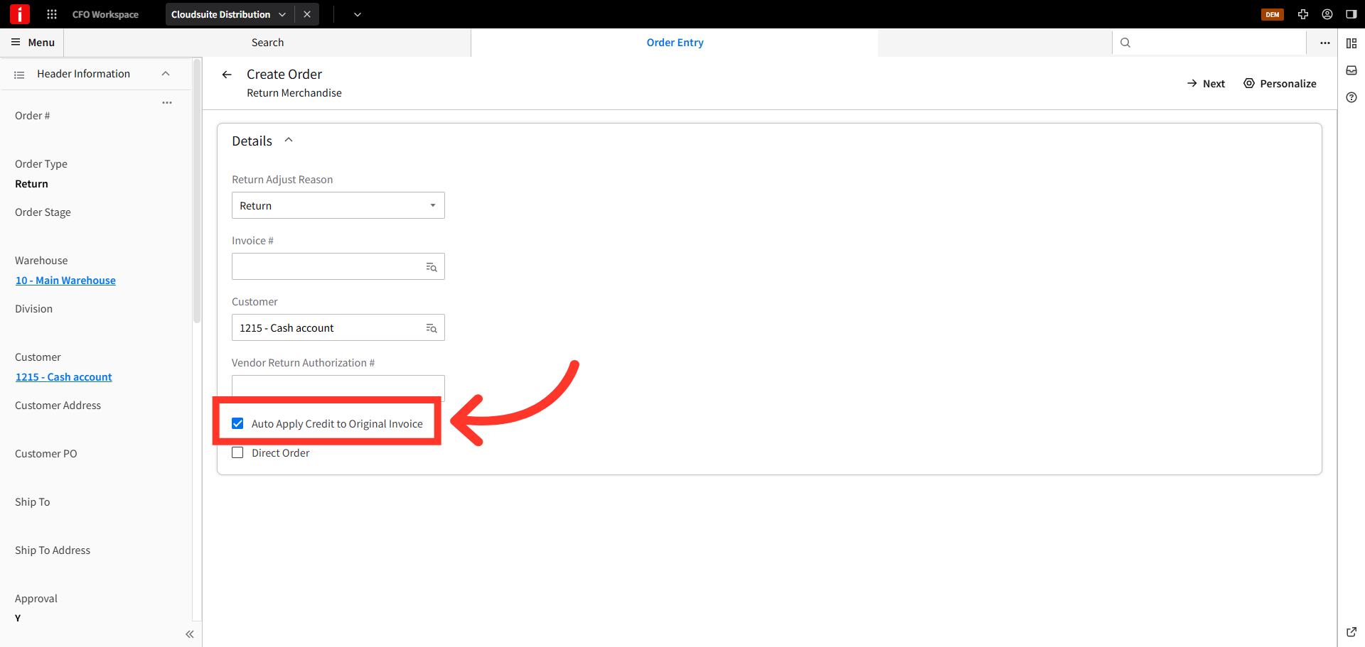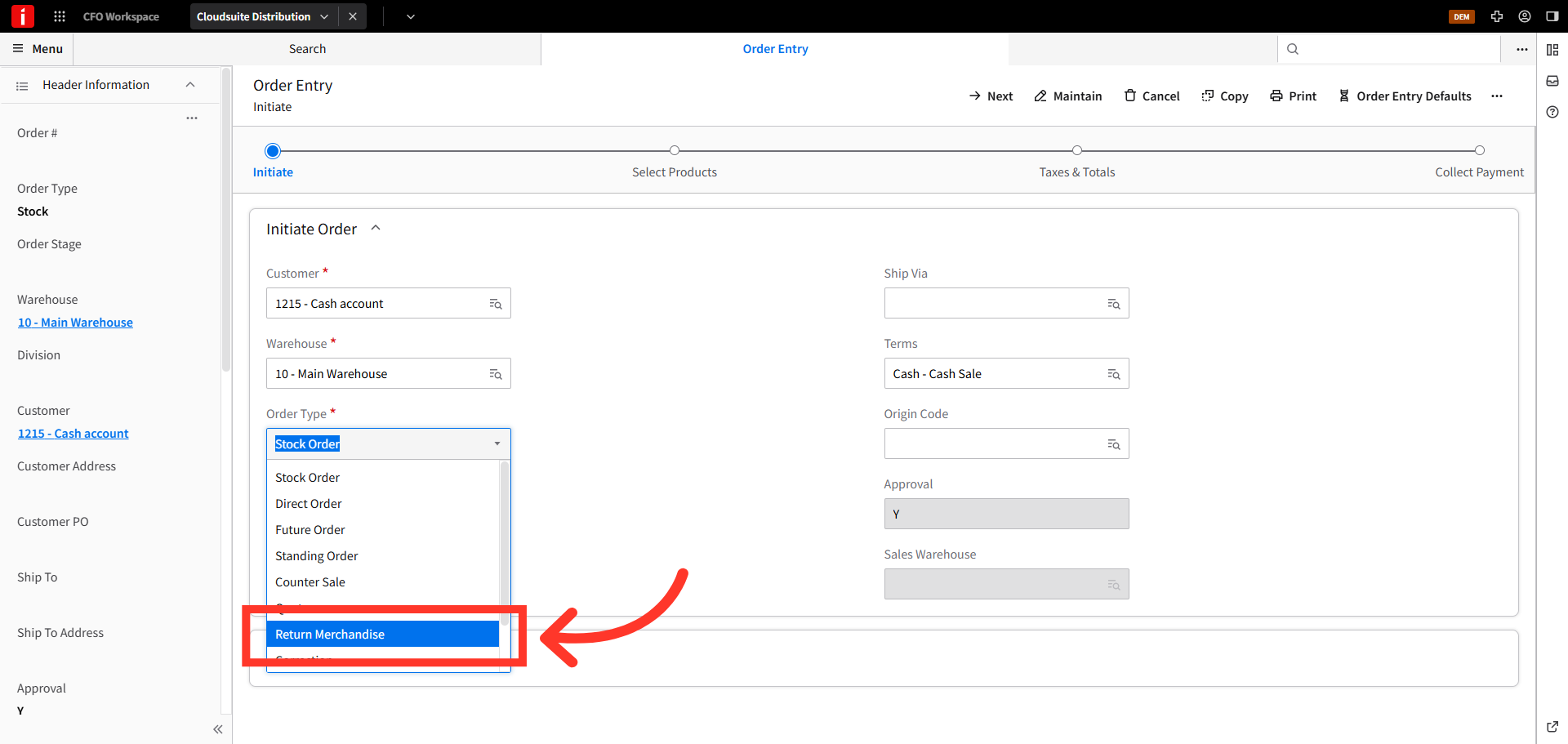 Then, in the "Order Type" field, choose the "Return Merchandise" option to initiate the return process for a customer order.