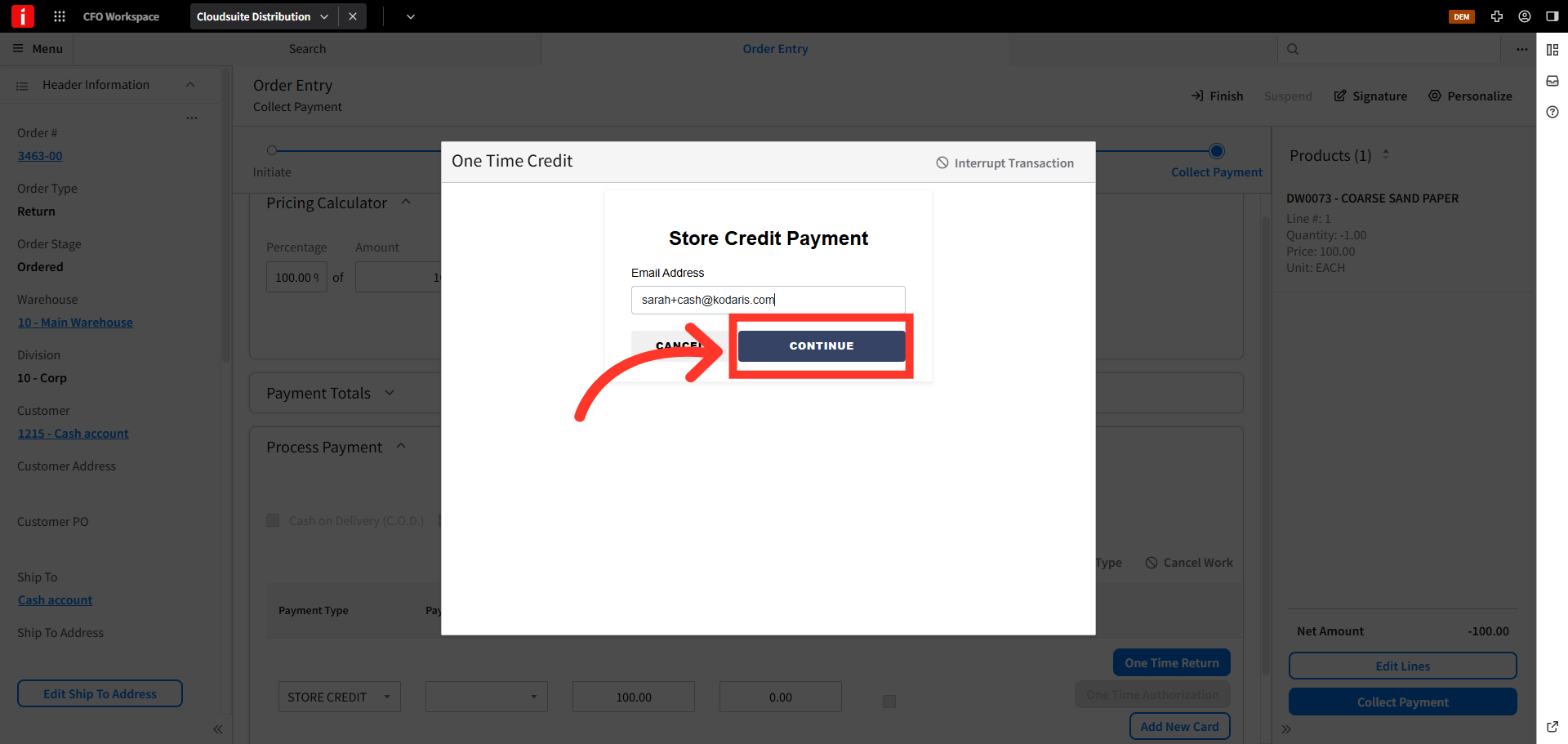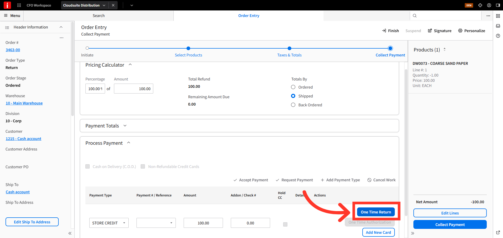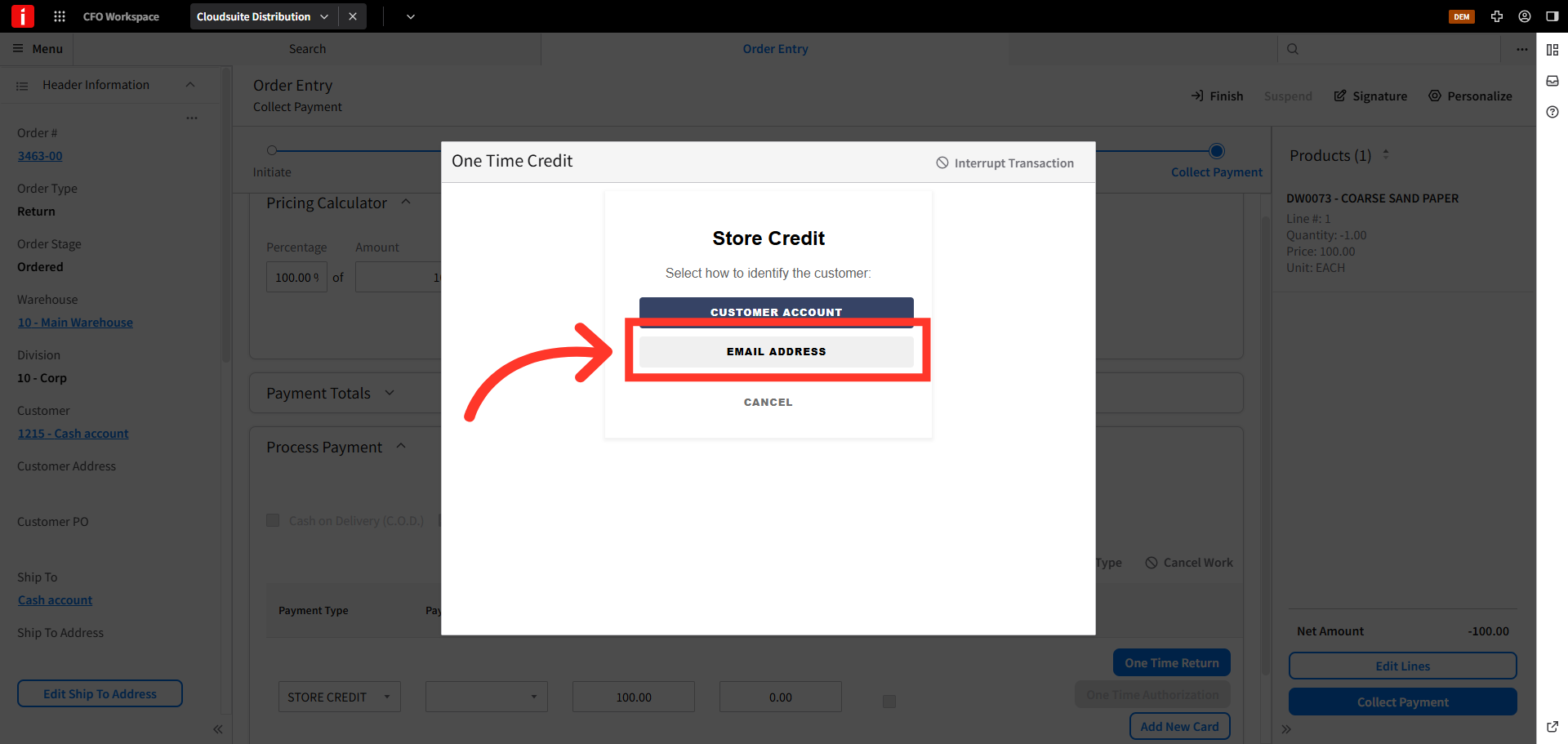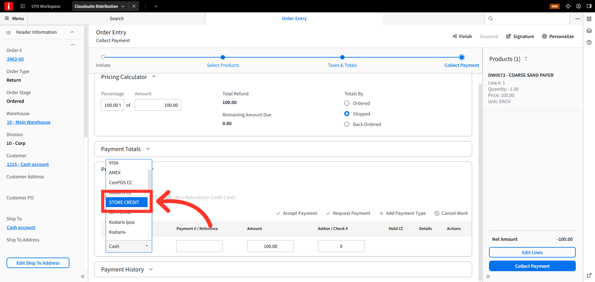 Store credits can be issued to walk-in, cash sale customers. To issue a store credit to cash sale customers in CSD, navigate to the order entry screen.