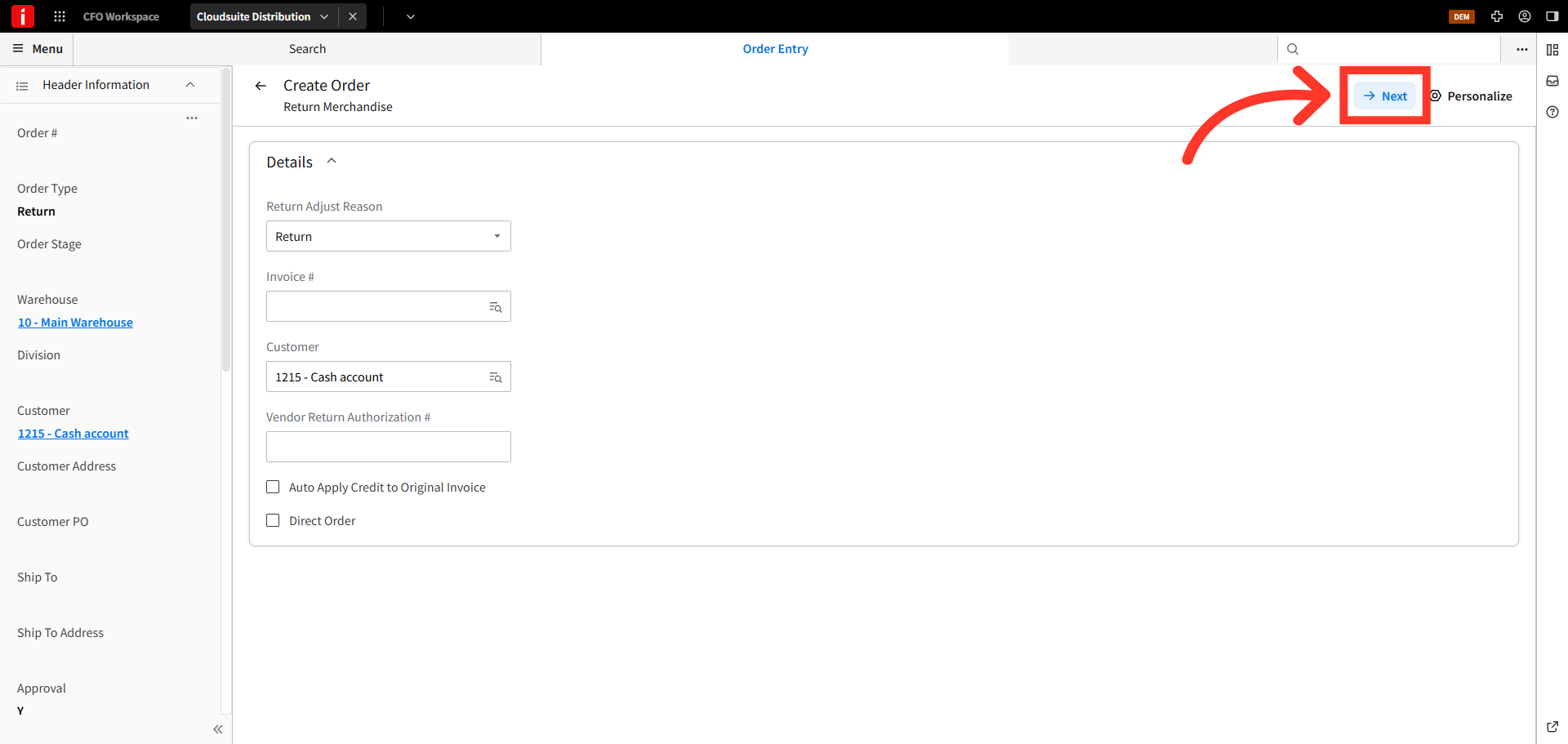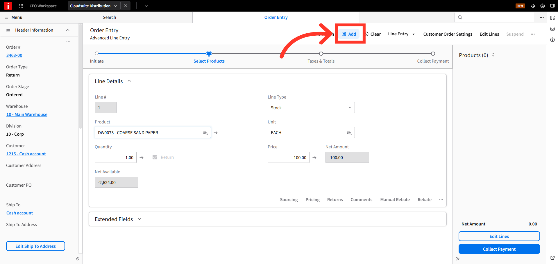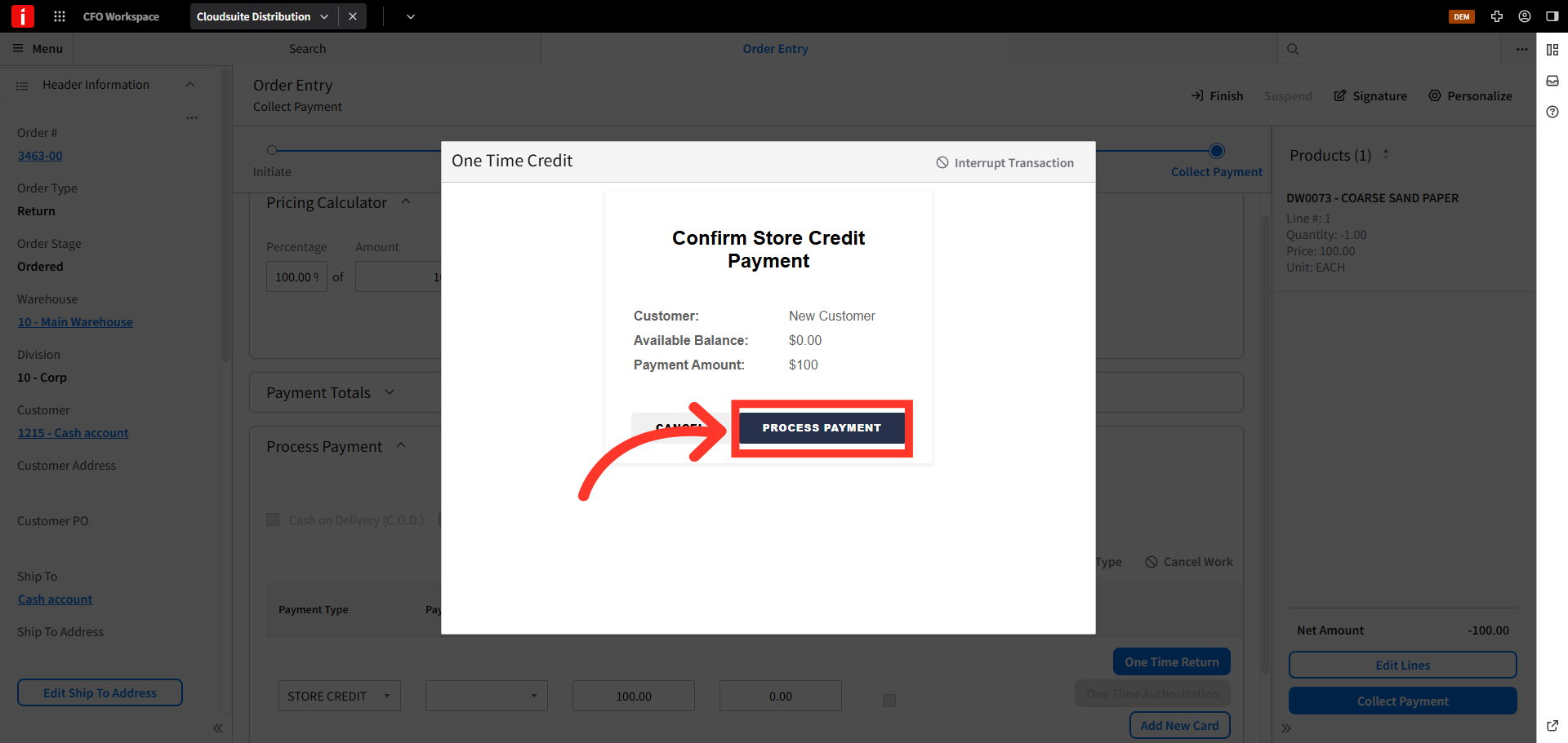 Store credits can be issued to walk-in, cash sale customers. To issue a store credit to cash sale customers in CSD, navigate to the order entry screen.