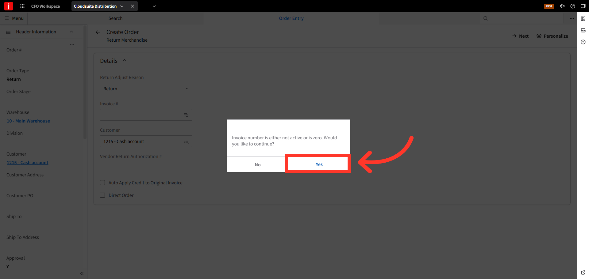 Click "Yes" to confirm the details entered for the return order and proceed.
