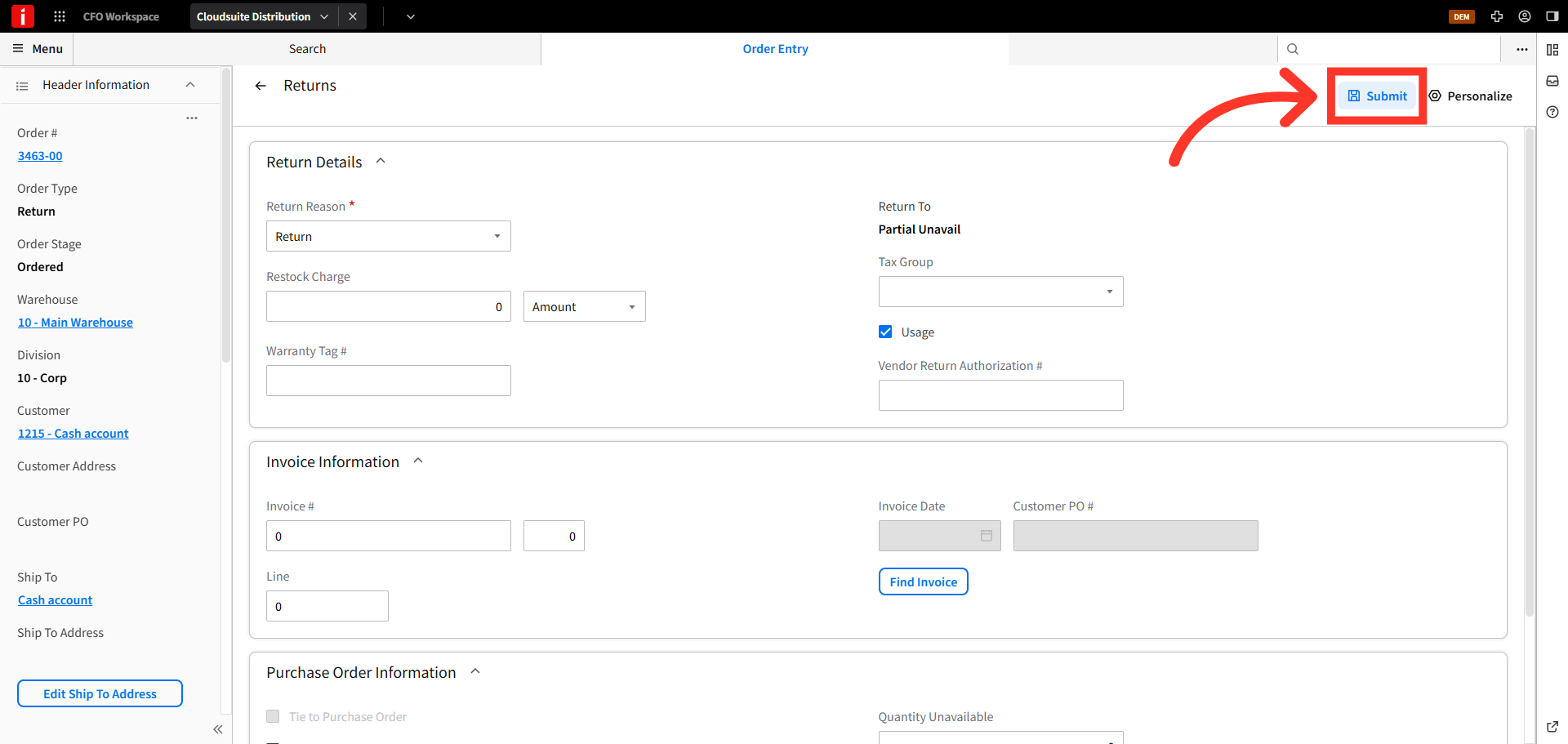 In the "Return Details" screen you can add a line level reason code or reference an invoice. Click "Submit".