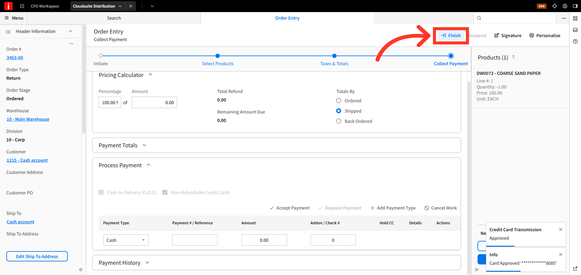 Then, click the "Finish" button at the top of the order entry screen to complete the transaction.