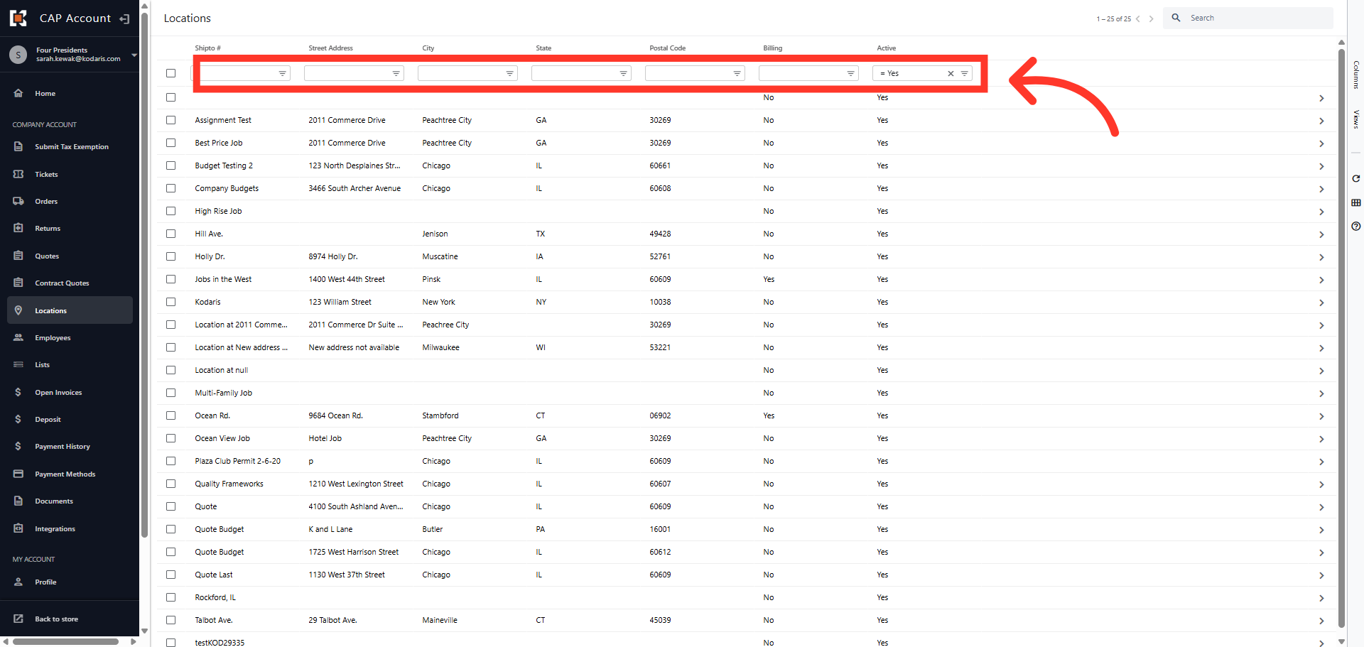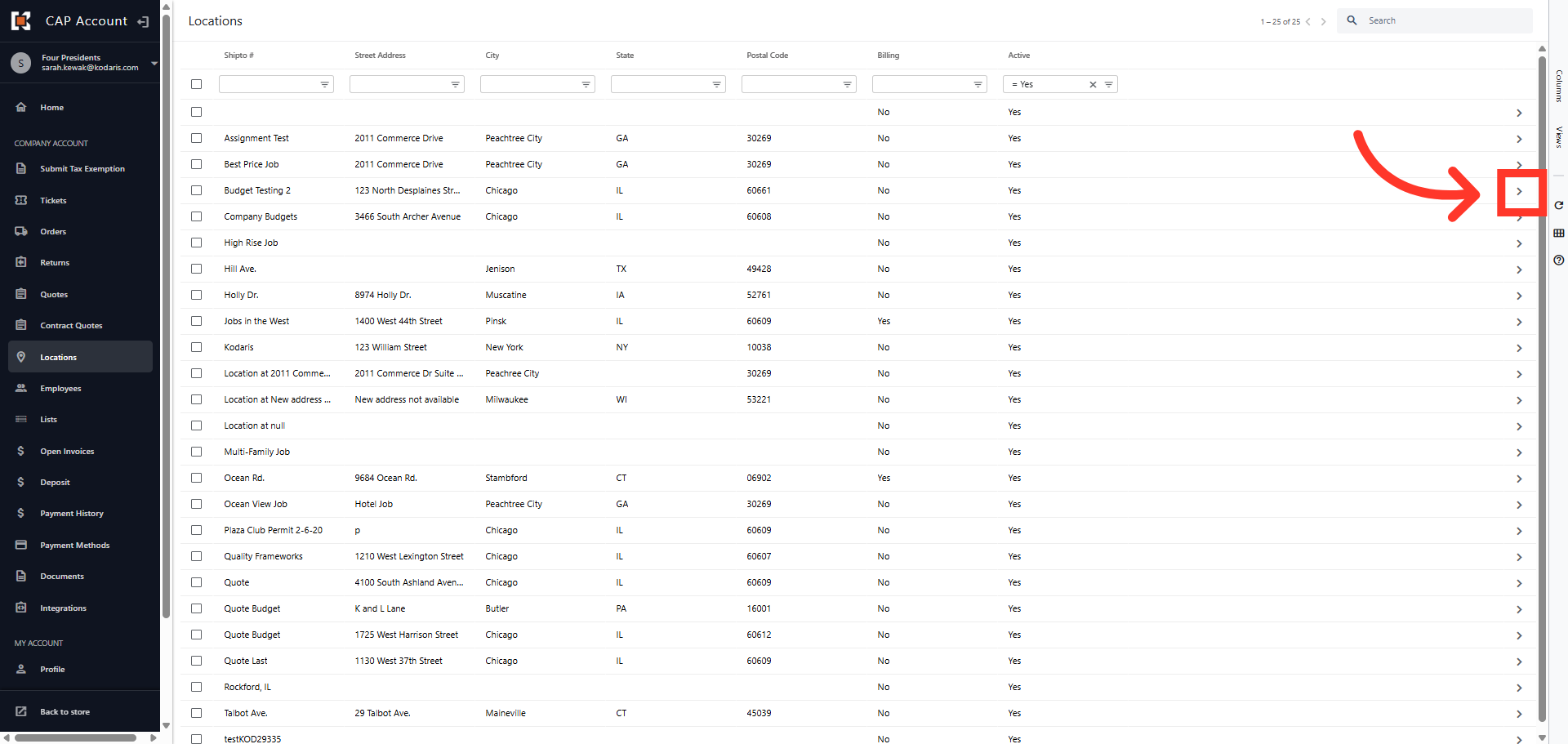 In order to access "Locations" you will need to have either "Company Admin", "View Assigned Location Quotes", or "View All Quotes". Search for the shipto in the "Search" field. You can enter the shipto number to search.