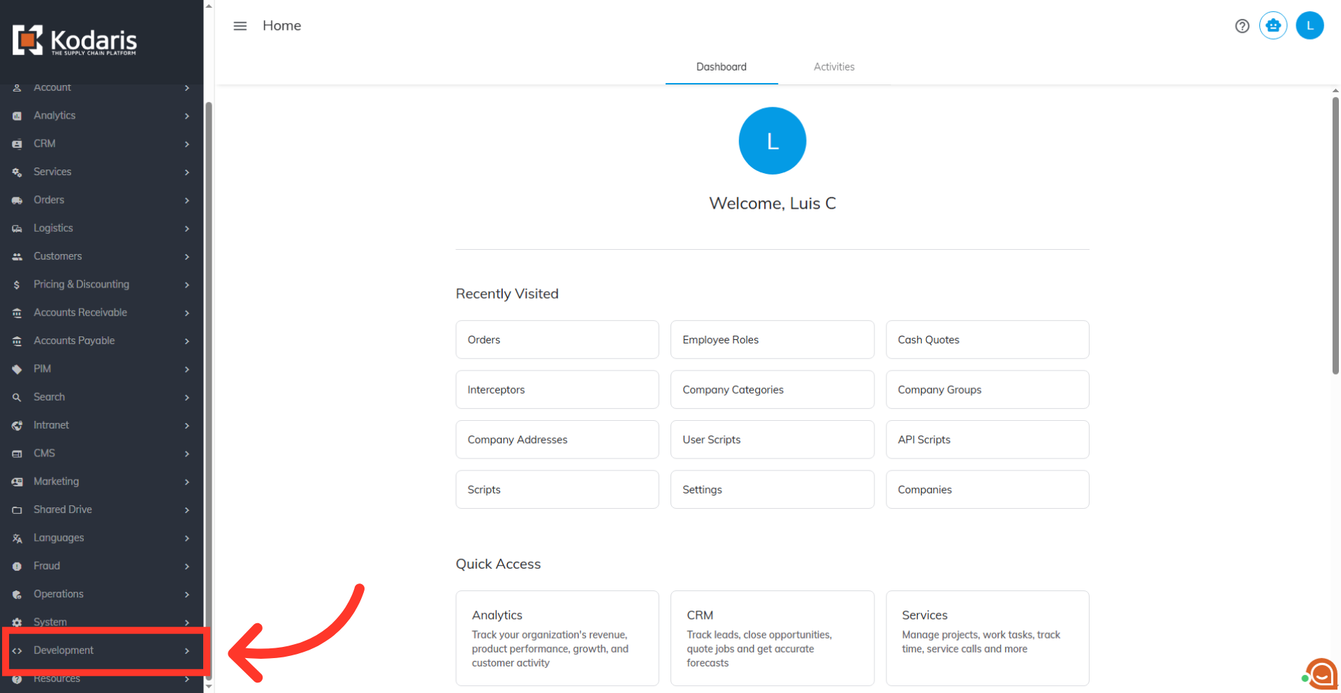 Click on the "Development" tab. In order to access this tab, you will need to have the role; "Developer".