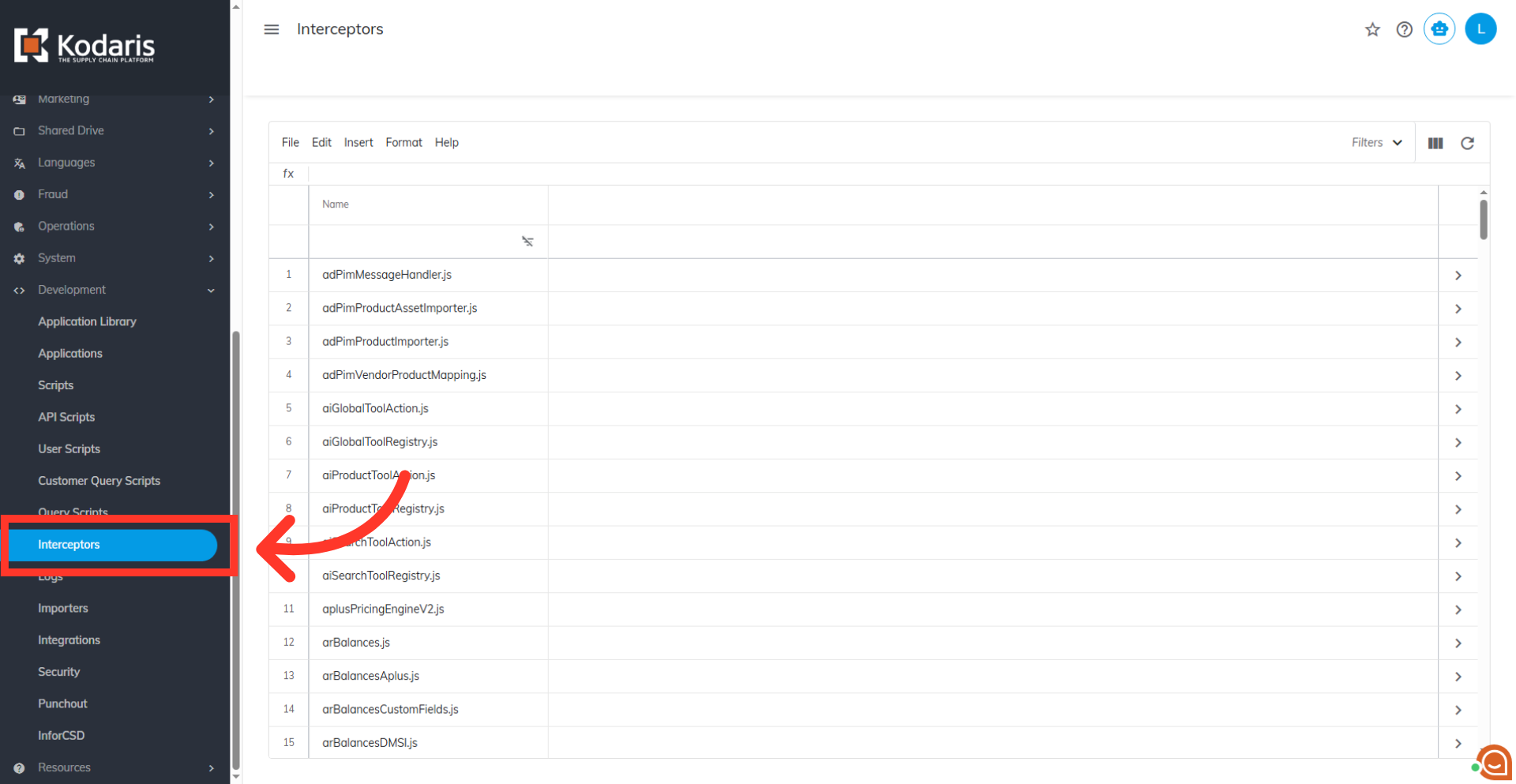 Click "Interceptors". In order to access "Interceptors" the account will need to be set up either as an "administrator" or a "superuser", or have the appropriate role: "scriptEdit".