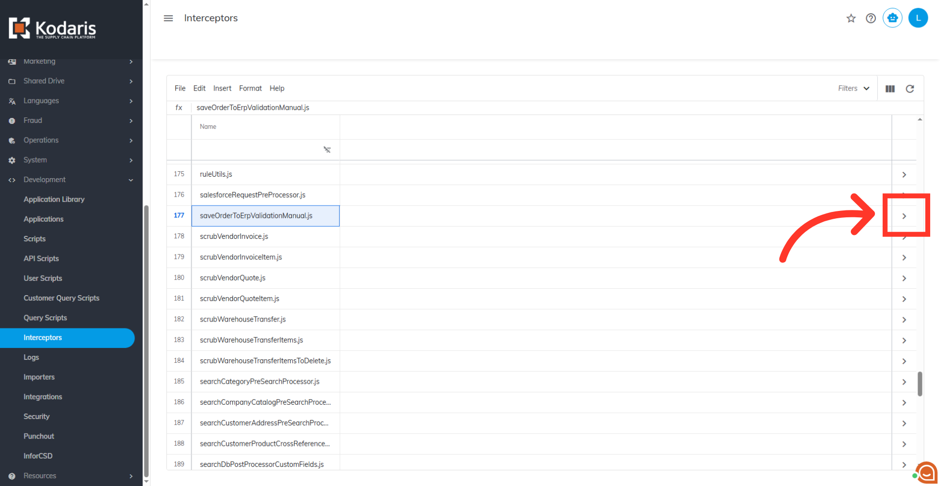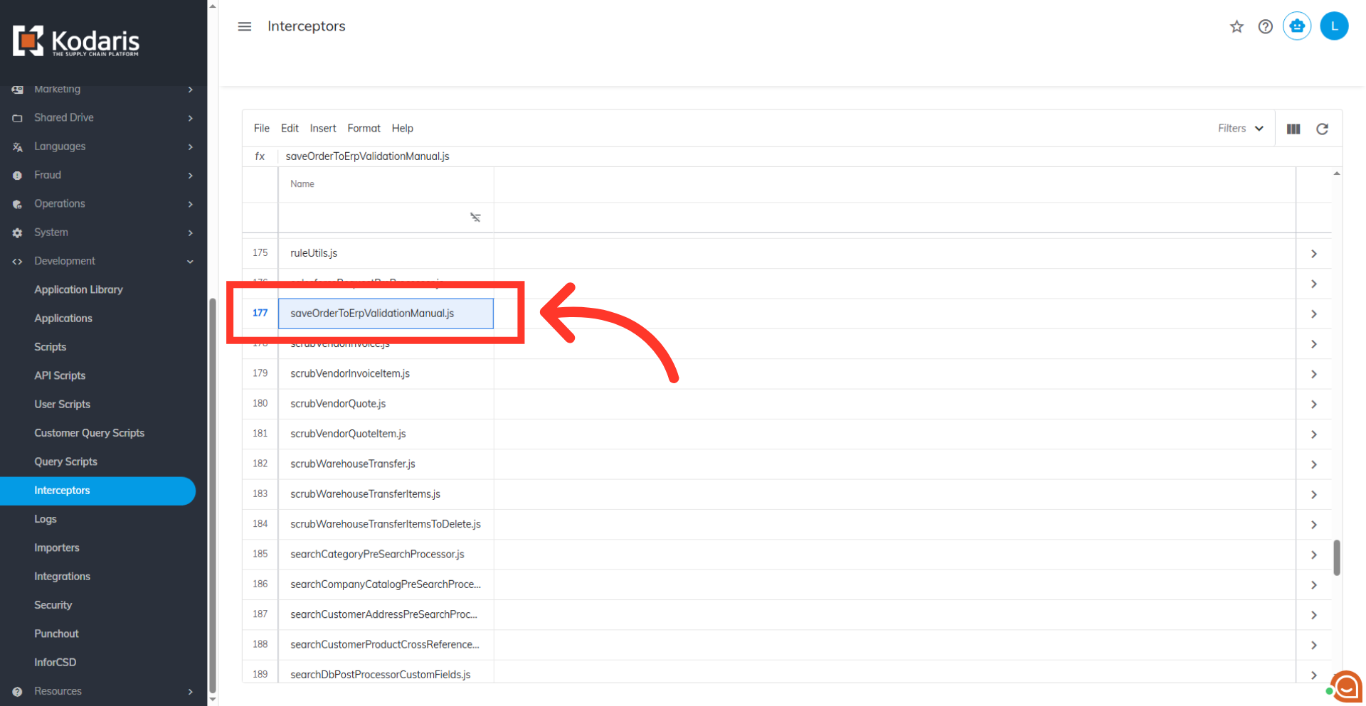 Scroll down the list to locate the "saveOrderToErpValidationManual.js" interceptor. This specific interceptor is executed just before an Order or Cash Quote is saved to the ERP.