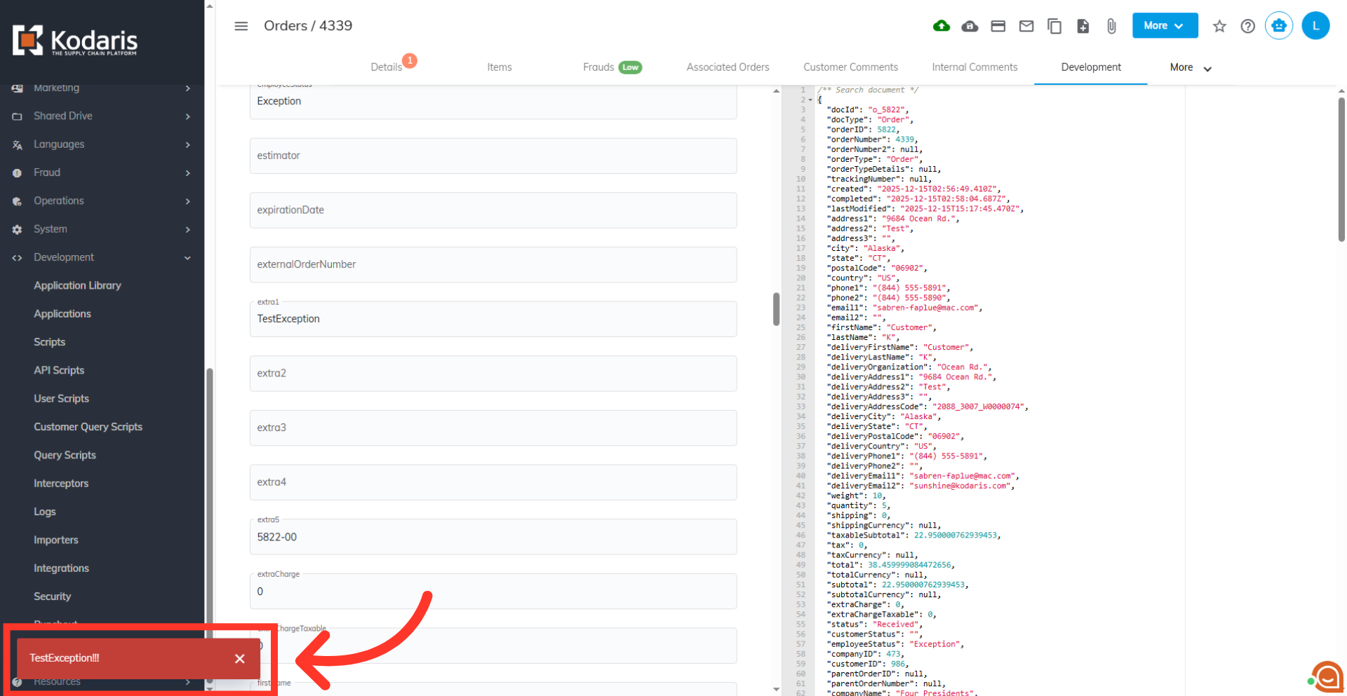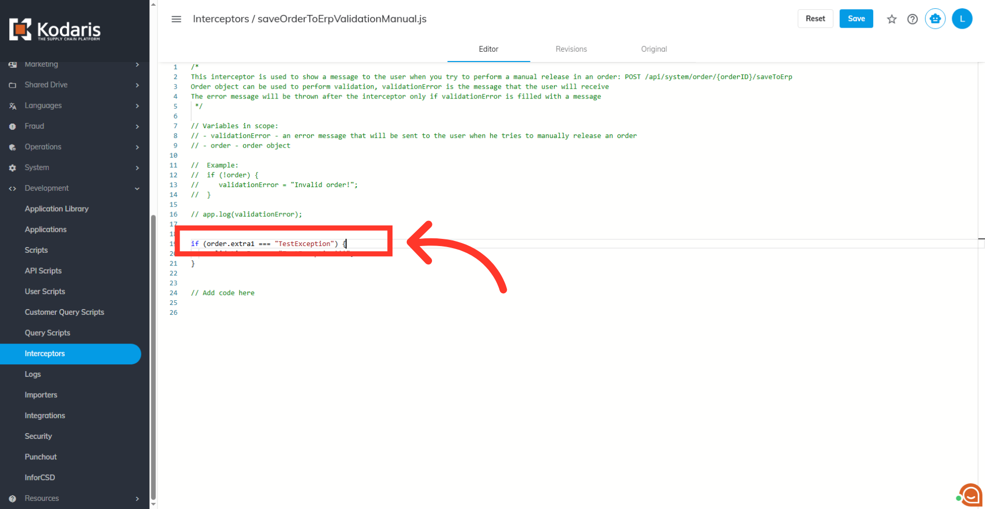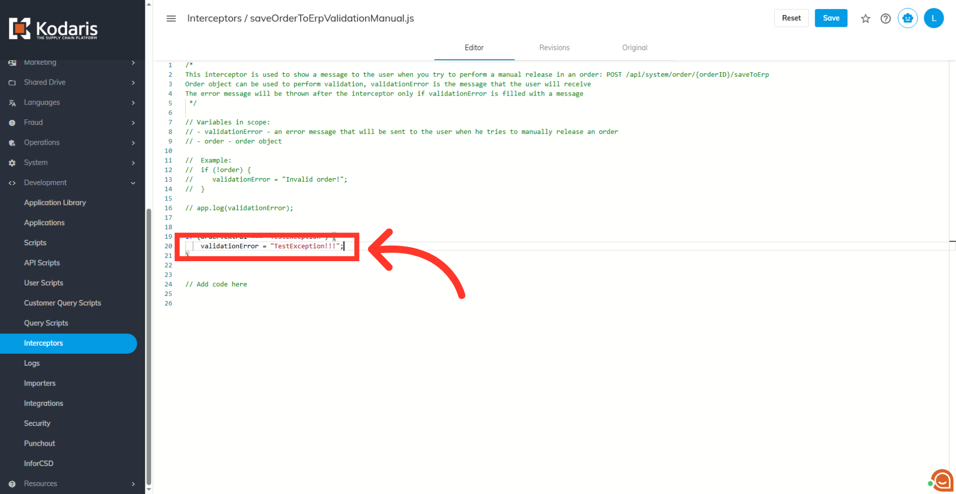 To add the "Save to ERP" warning, navigate to the "Development" section in the operations portal.