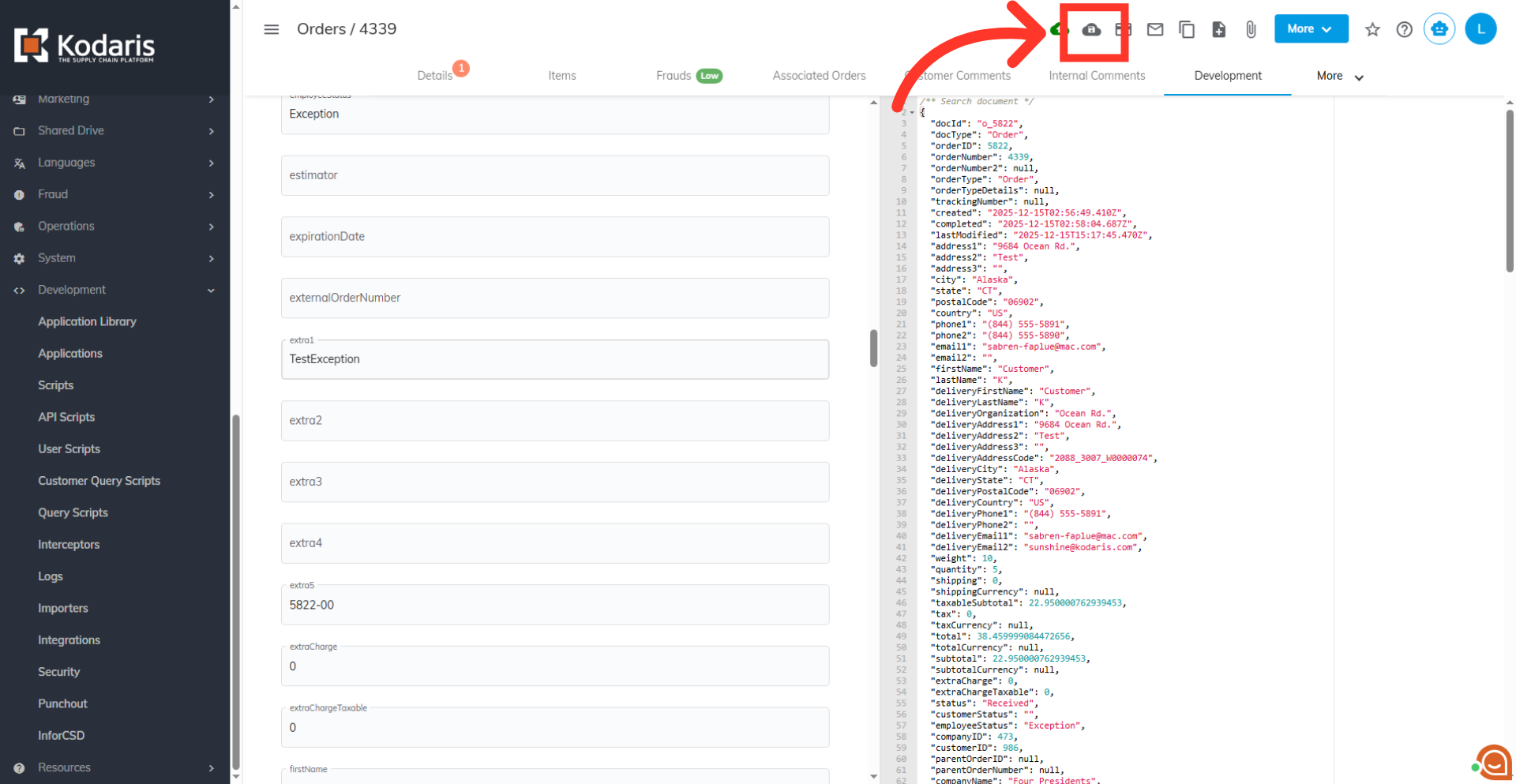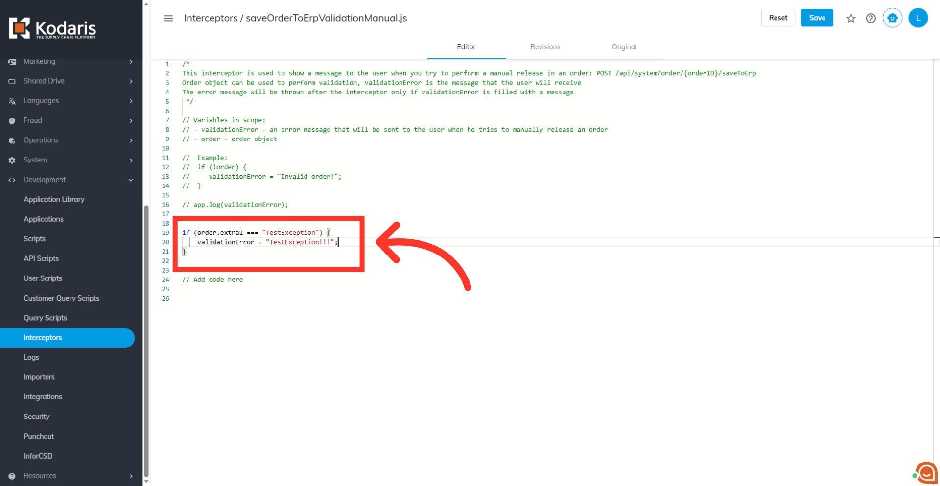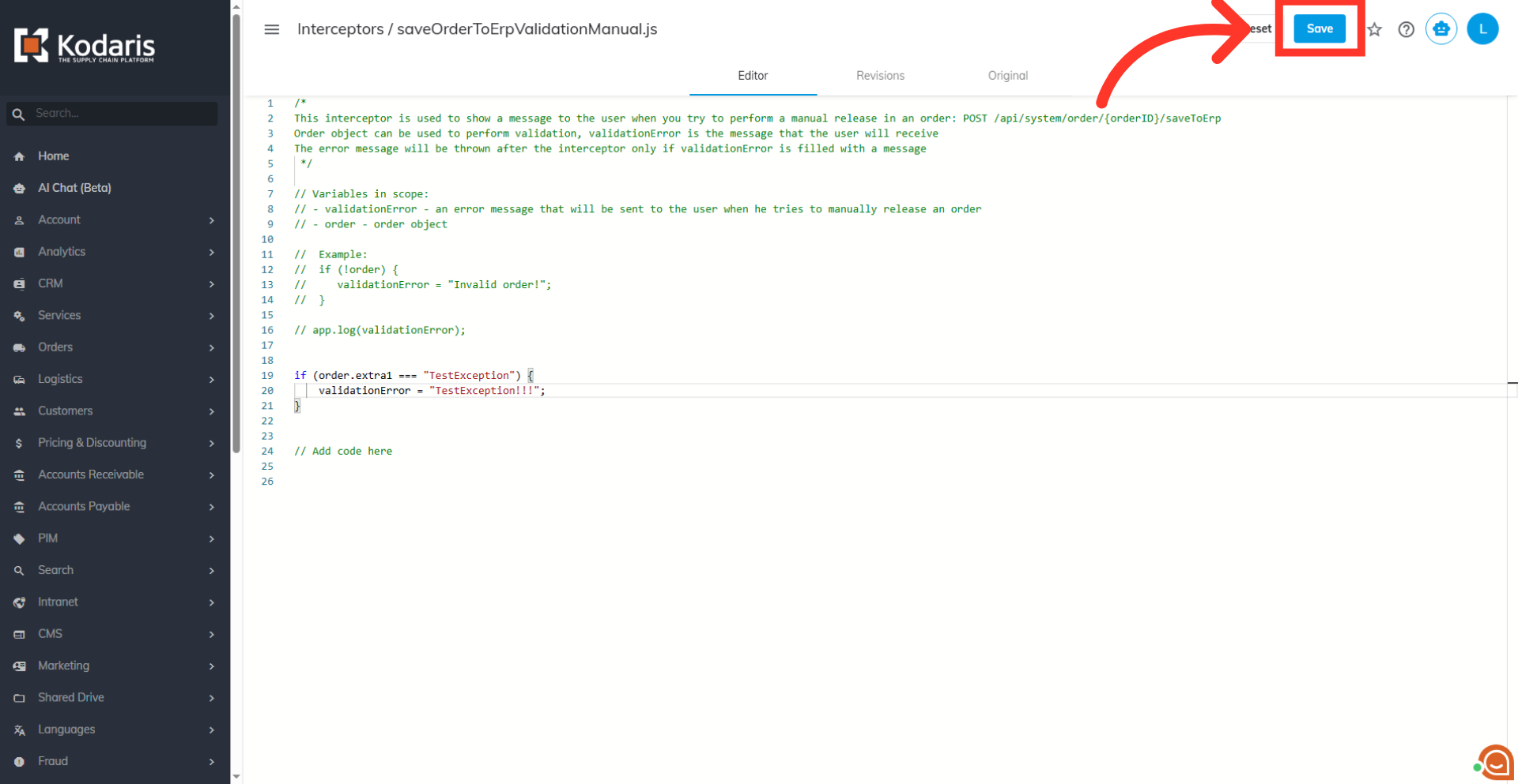 To add the "Save to ERP" warning, navigate to the "Development" section in the operations portal.