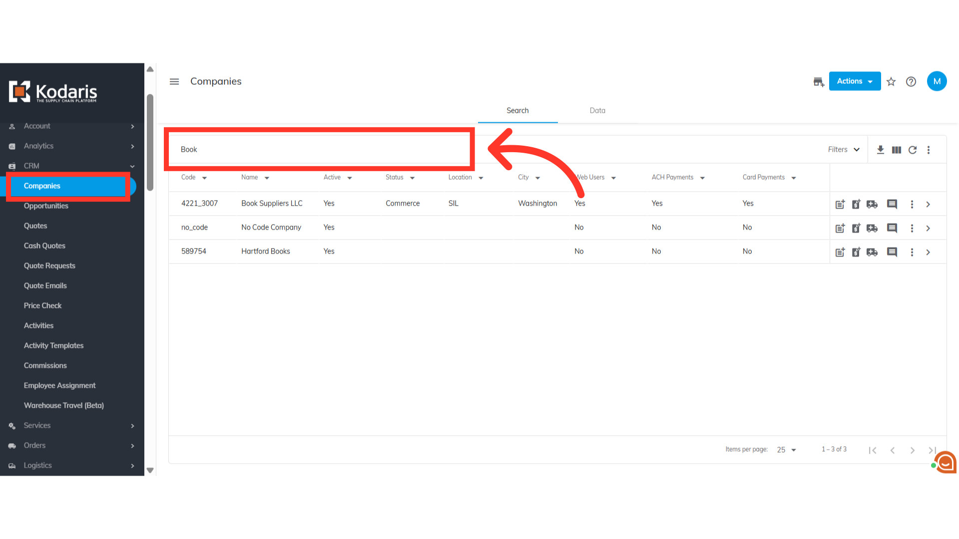 Navigate to "Companies". In order to access "Companies" you will need to be set up either as an "administrator" or a "superuser", or have the appropriate roles: "companyView", "companyEdit", and "customerEdit. You can then type to search for the company in the "Search" field.