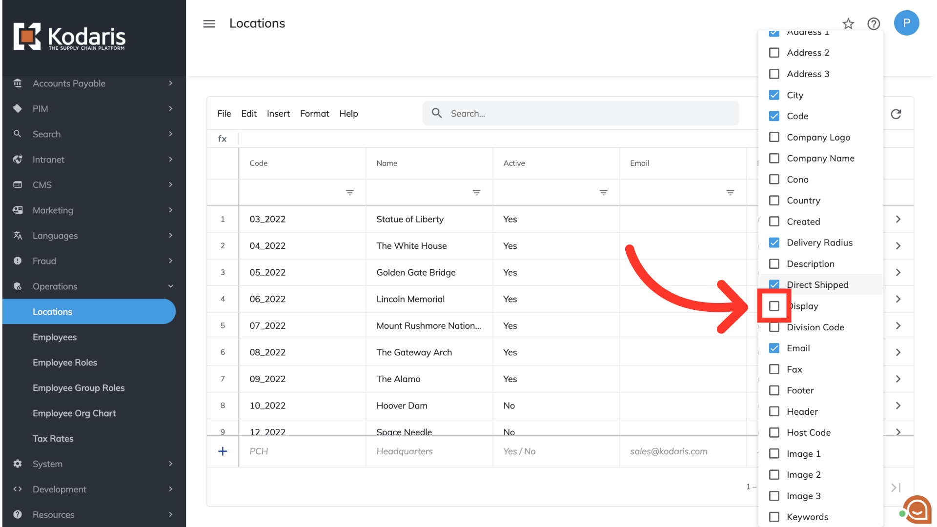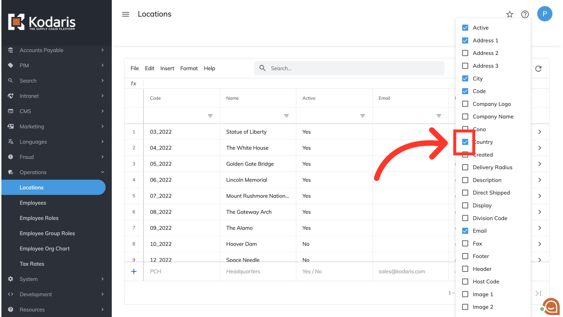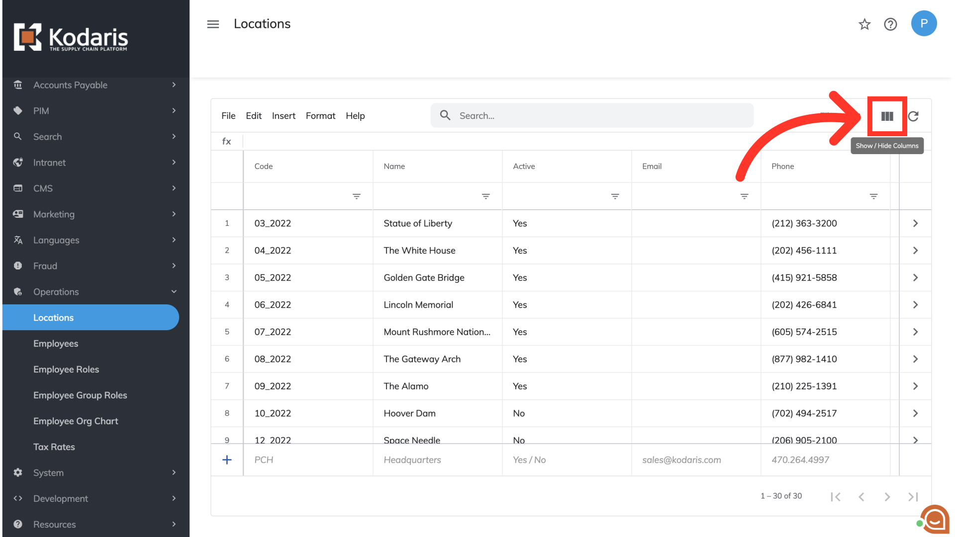 The "Locations" screen has all of your existing warehouse location information. To begin the process of mass updating this information, you will need to customize the screen to display the data you wish to update. Select the "Show/Hide Columns" icon to view the available columns.