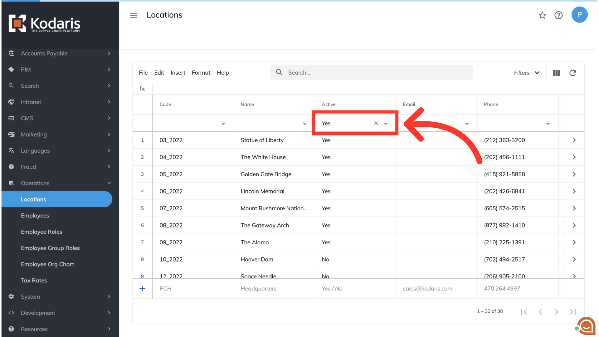 Once you've chosen the fields or columns you want to update, you can also use the filtering capabilities to further customize your view. While this is not mandatory, it is available. For this example, we will filter the "Active" column by "Yes" to showcase only the active locations.