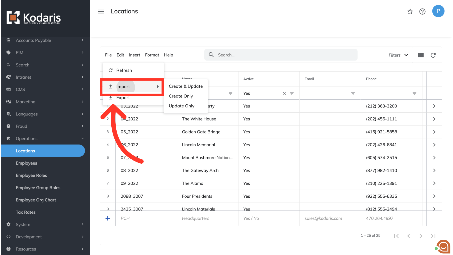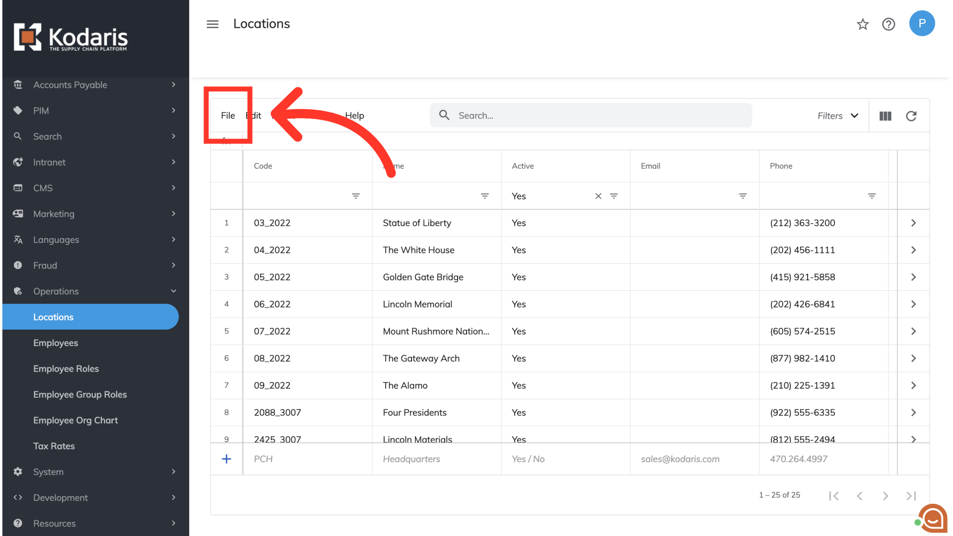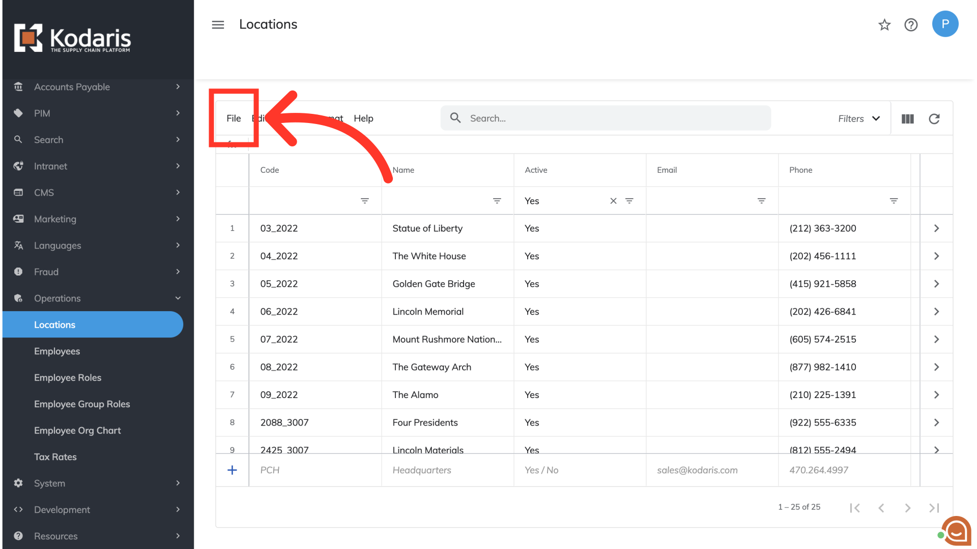 Once your CSV file has been downloaded, head back to the "Locations" screen in the Operations Portal. Select "File" to begin the uploading process.