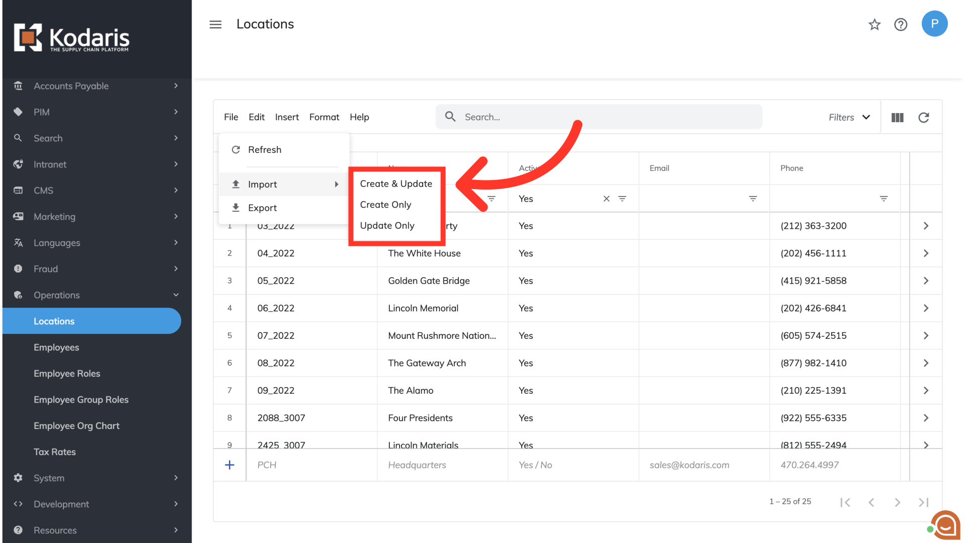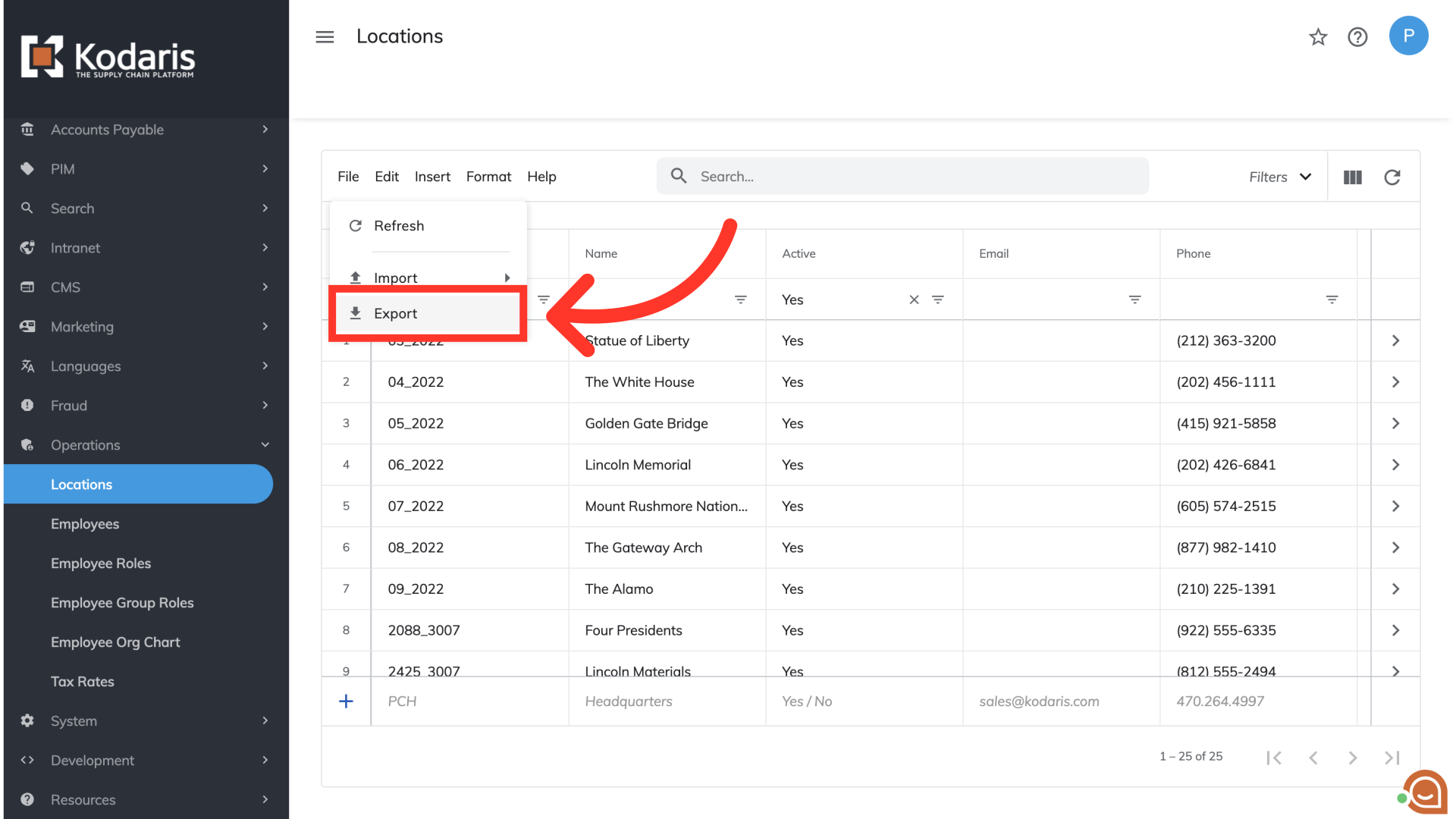 Select "Export". This export will have the needed header row and data that will be used for importing back into the system when using the locations "Data" screen.