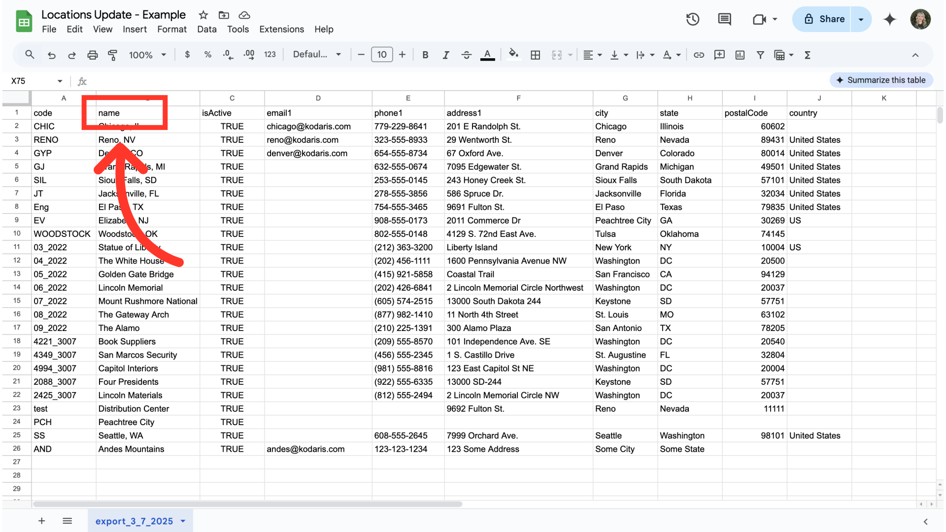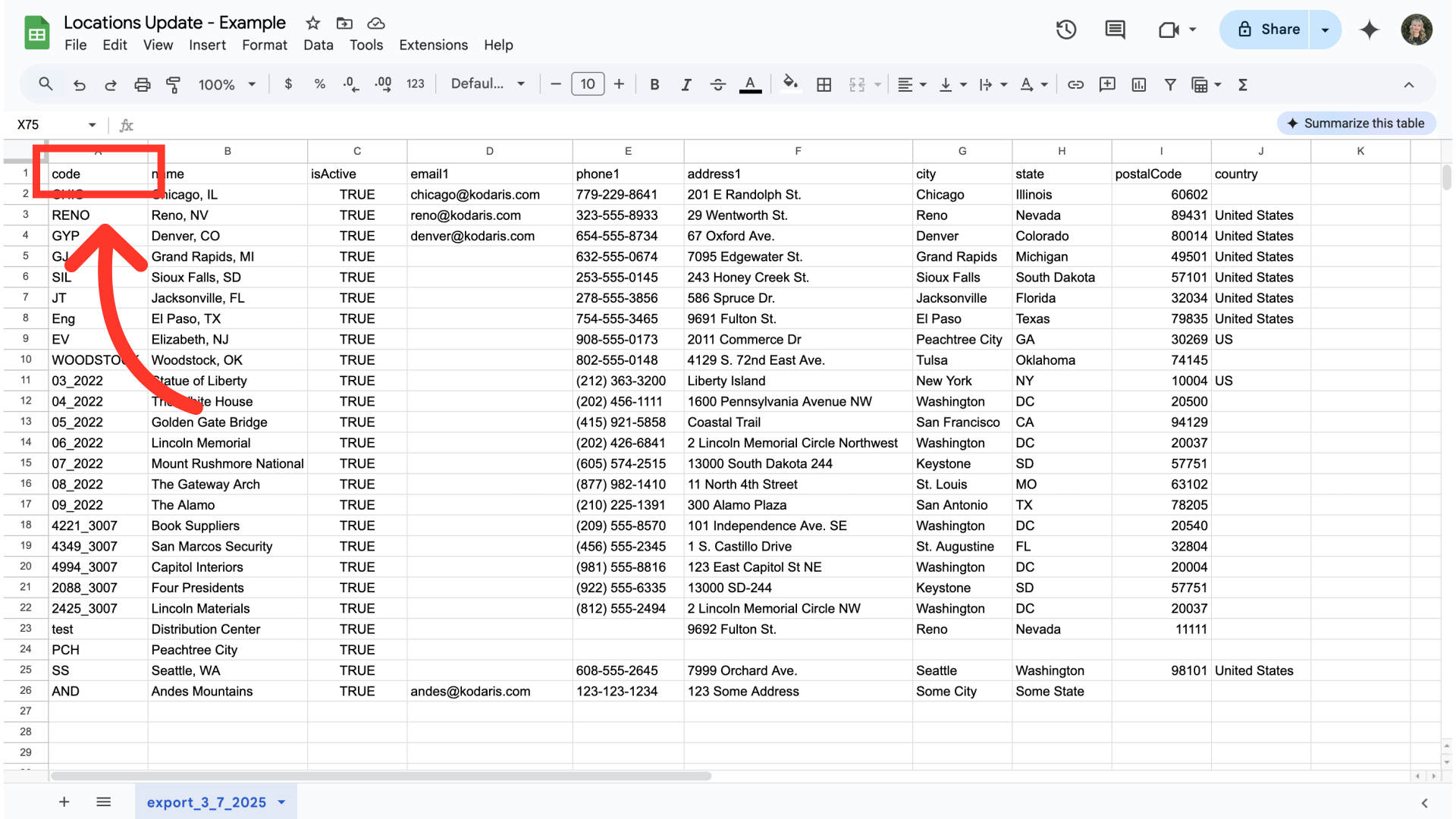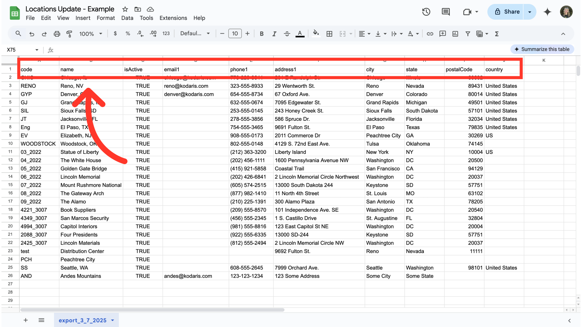You can see in this sample export that we have the header row that is needed to import data, and also the exported locations data.