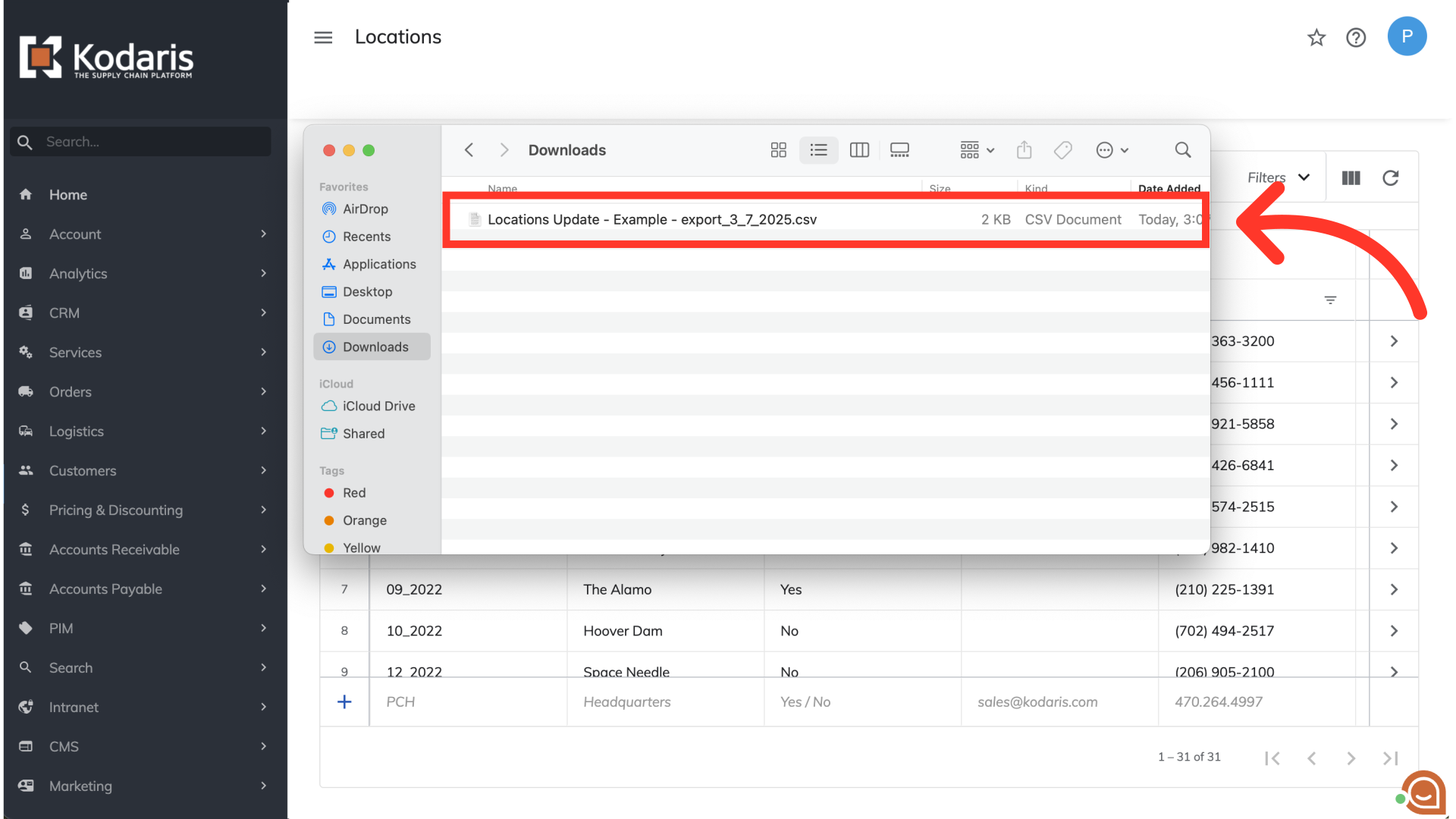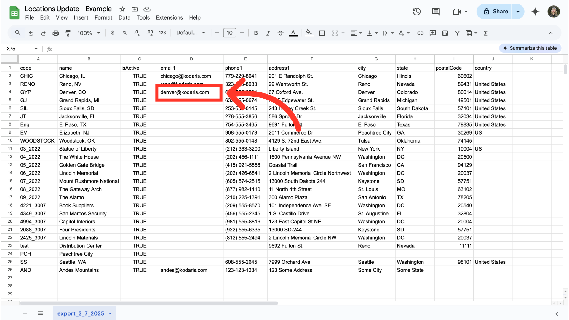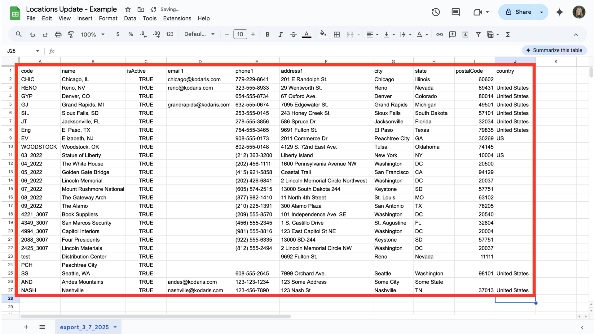 You can see in this sample export that we have the header row that is needed to import data, and also the exported locations data.